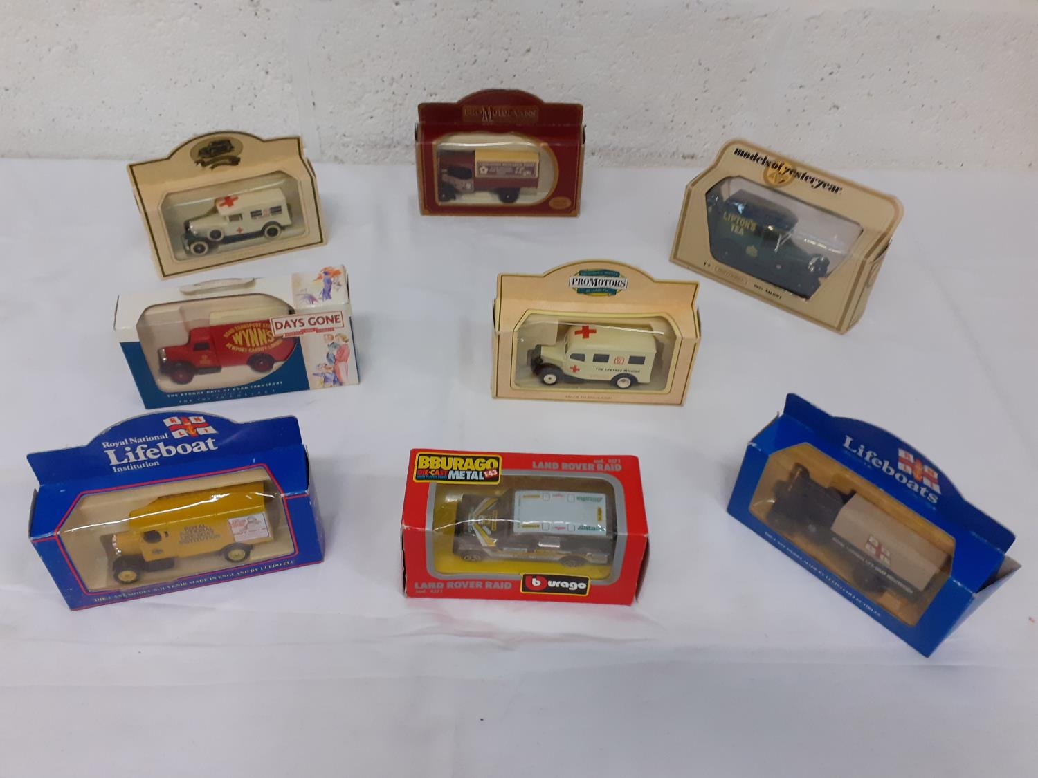 Eight Boxed Model Vehicles - 2 x Lledo Lifeboat Trucks, Buargo Land Rover Raid, Matchbox Models of Yesteryear 1927 Talbot, 2 x Lledo Leprosy Mission Trucks, Lledo Special Edition Leukaemia Research Fund Tredegar & Lledo Days Gone Wynn's Transport Bedford Van.