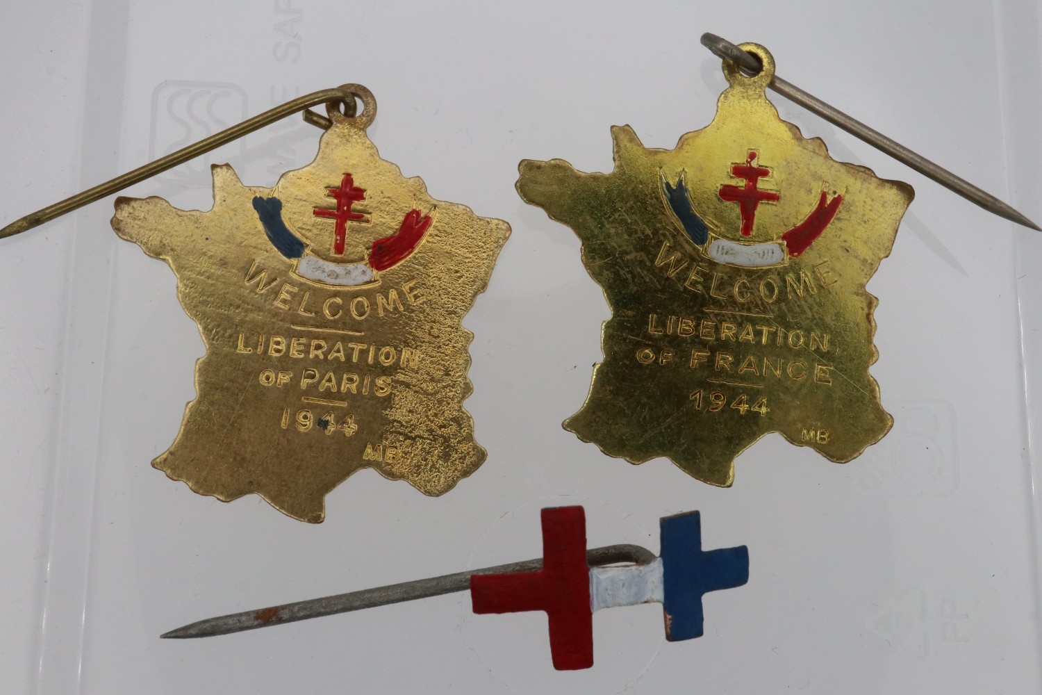 Three WWII French Liberation Pins: Liberation of France, Liberation of Paris and a Free French cross of Lorraine. UK P&P Group 0 (£7+VAT for the first lot and £1+VAT for subsequent lots)