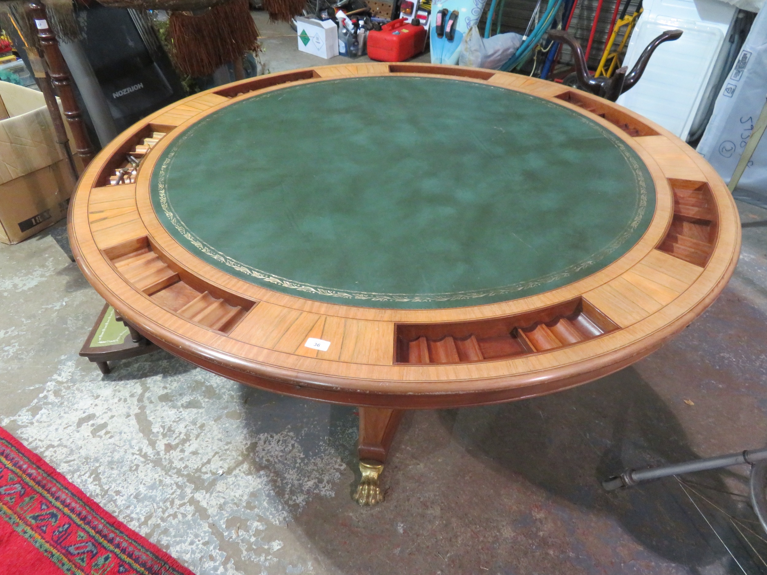 Good quality circular mahogany games table with tooled leather insert to top brushing slide drinks holders seven poker chip compartments on substantial tripod base with brass lion paw feet Diameter approx 64"
