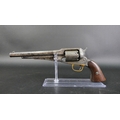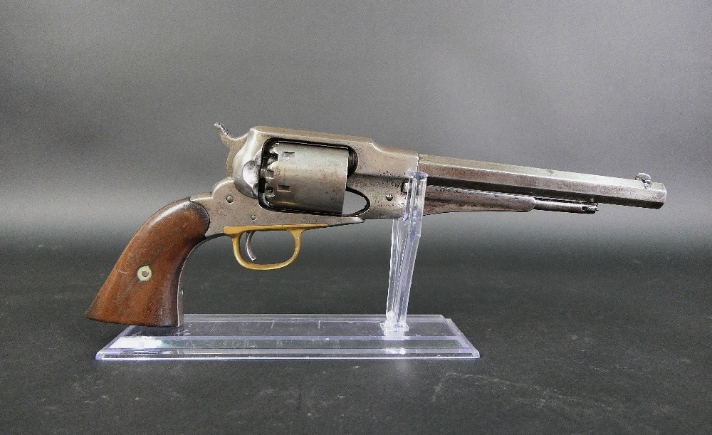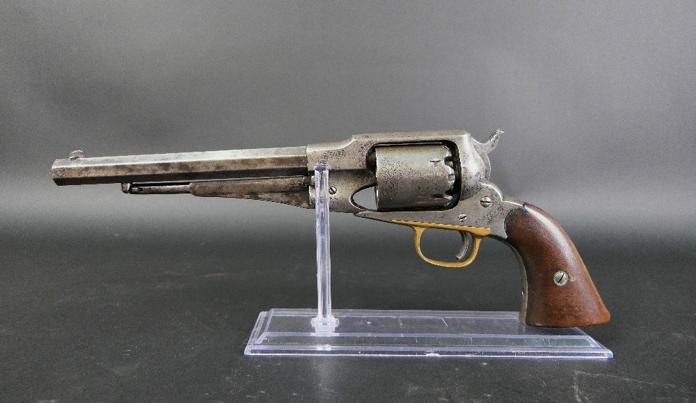Remington 1858 New Model Army 44 percussion revolver, with 8" octagonal barrel, marked to the top Patented 1858 E Remington & Sons New York USA New Model, the cylinder stamped A, trigger guard stamped A, no visible serial number. Sold as a Section 58 obsolete calibre.