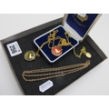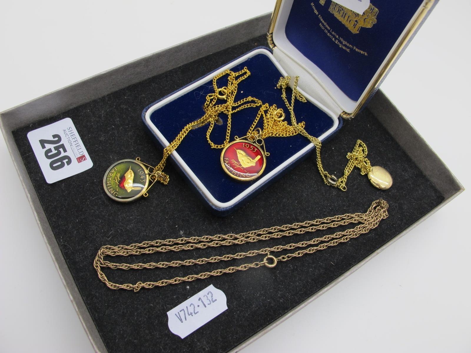 A Fancy Link Chain, (7.5grams); together with a small selection of gilt coloured pendants on chains, including commemorative farthing pendants.