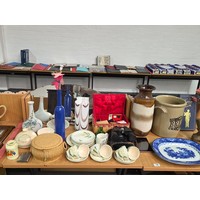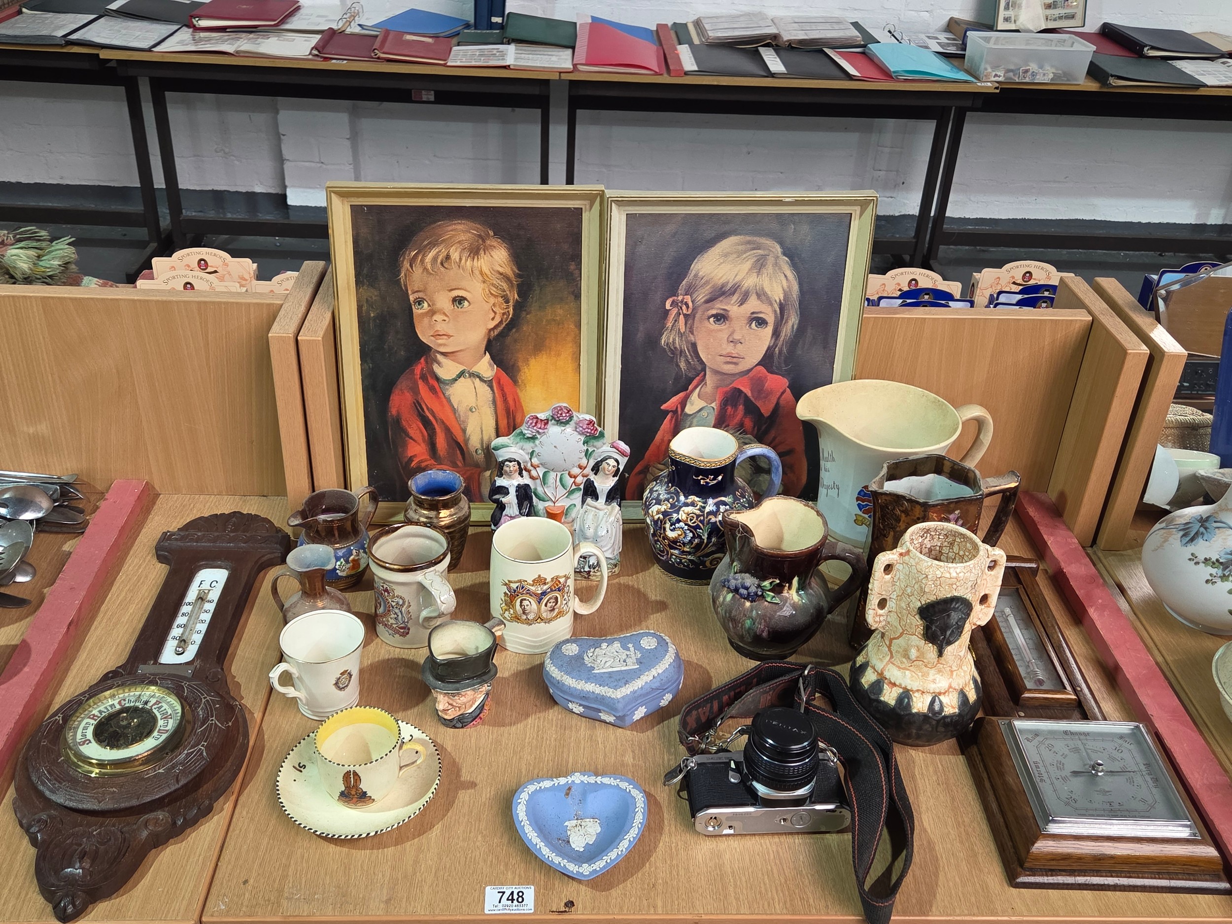 A Pentax camera, two barometers, Wedgwood, Royal Doulton, pictures etc