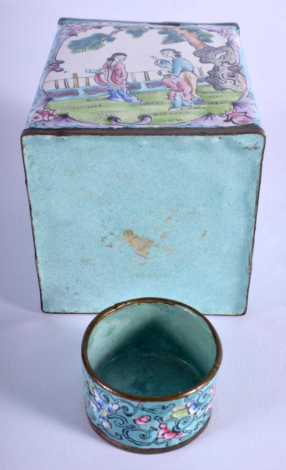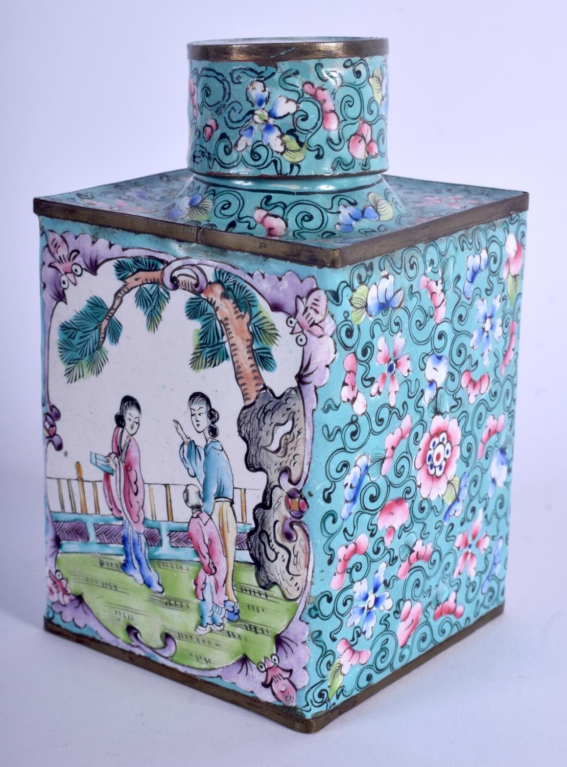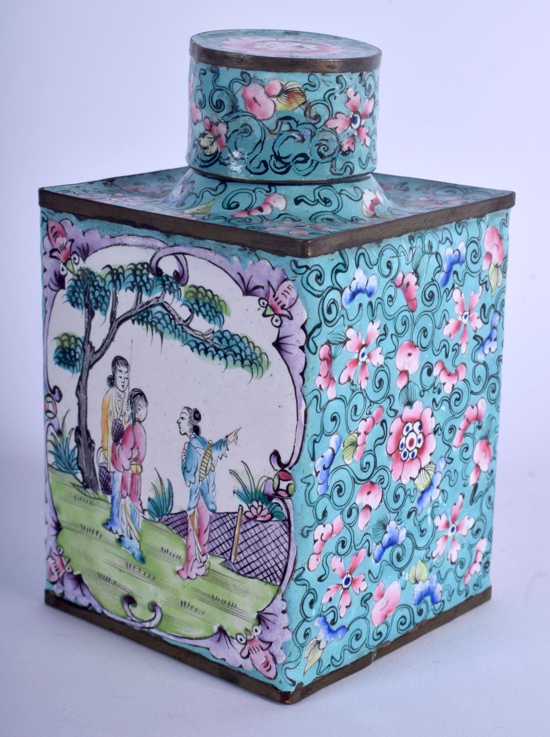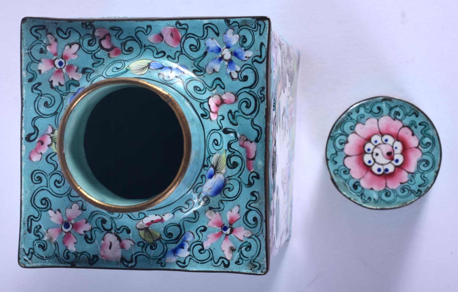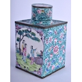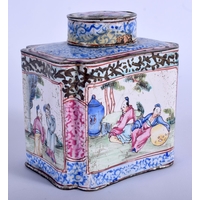 AN EARLY 20TH CENTURY CHINESE CANTON ENAMEL TEA CADDY AND COVER Qing, painted with figures. 12 cm x 6.5 cm.