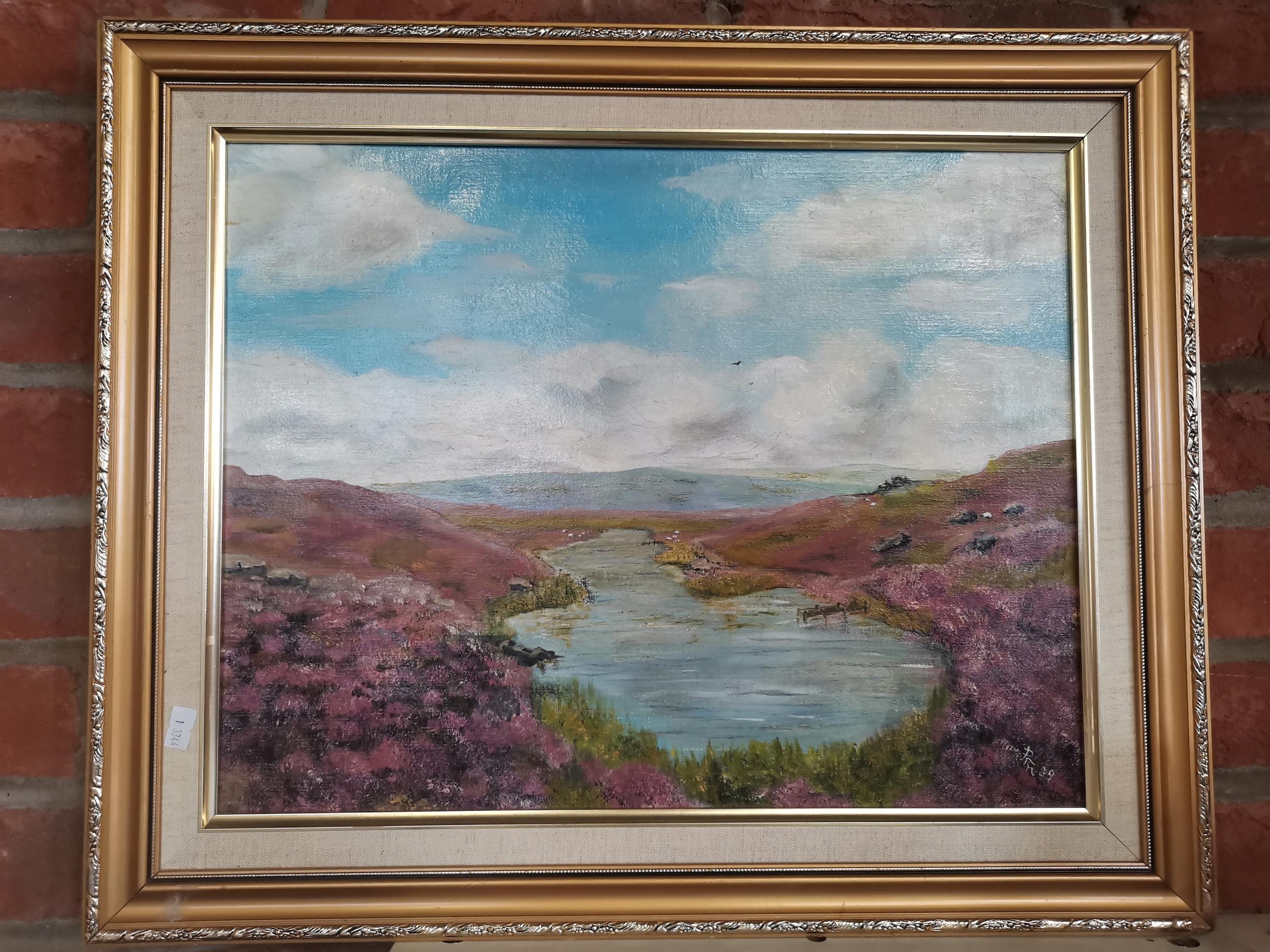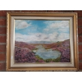 British School, 20th Century, Heather moorland with sheep at a tarn, in the style of Lewis Creighton, oil on canvas, initialled PAH (PAM?) and dated '89 lower right, framed. 35cm by 45cm