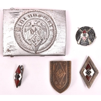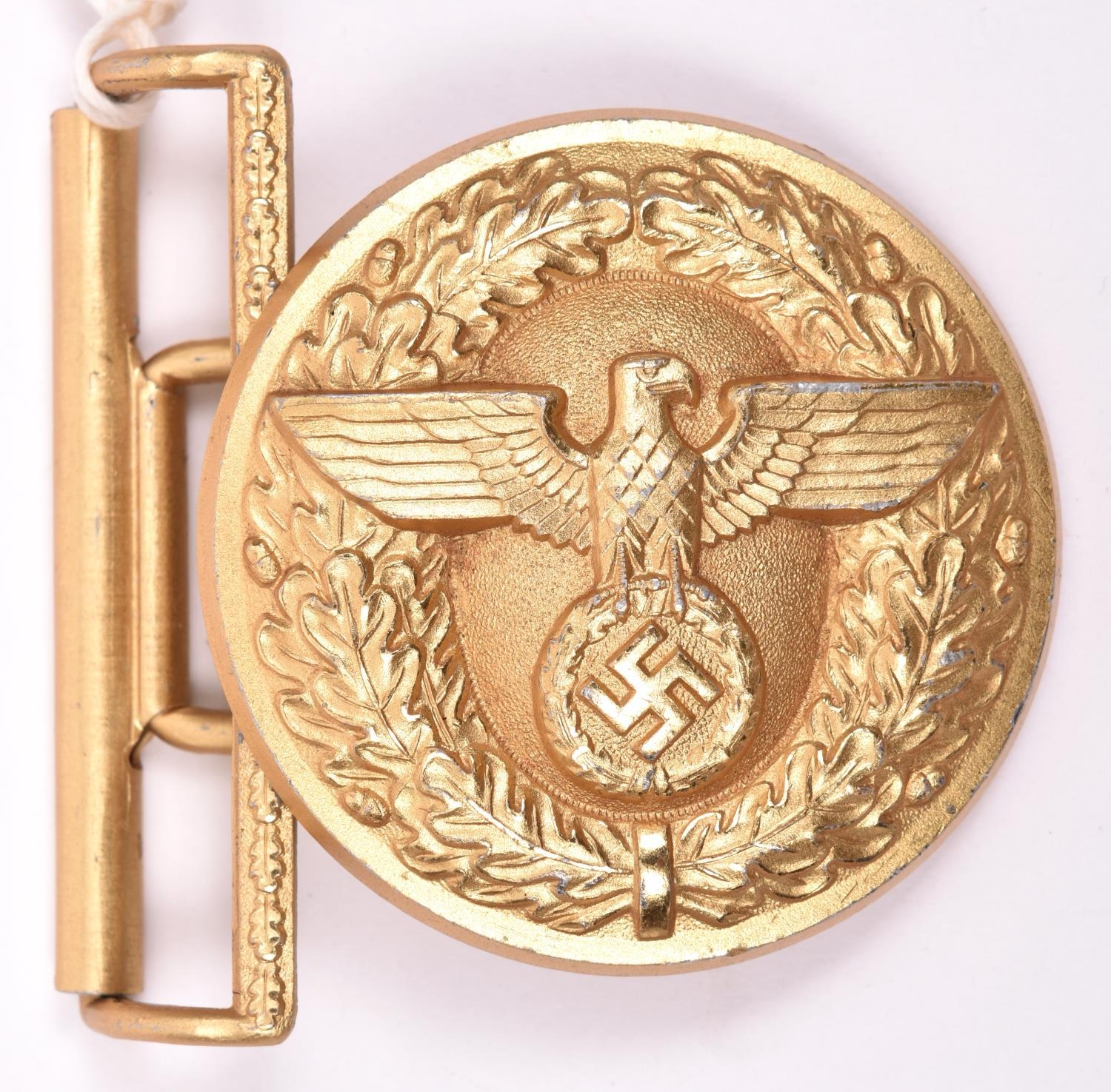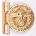 A Third Reich NSDAP Political Leader’s gold anodised aluminium belt buckle, the reverse embossed with RZM mark and “M4/22” (Christian Theodor Dicke, Ludenscheid) VGC (the female clasp missing). £50-80