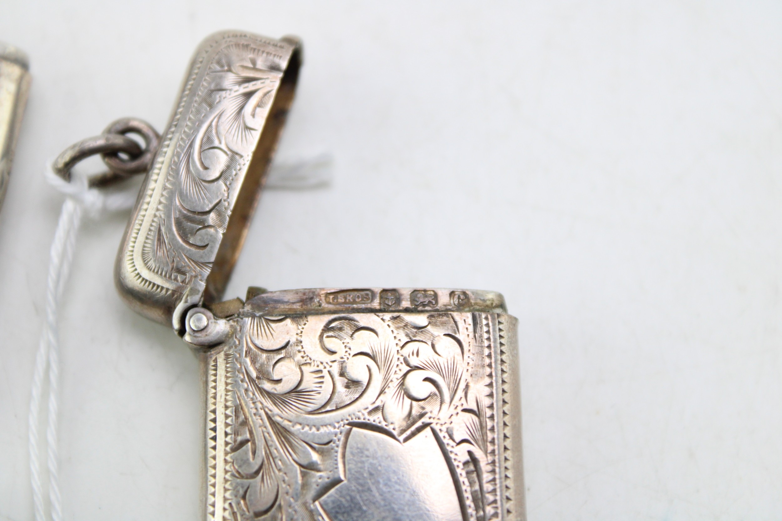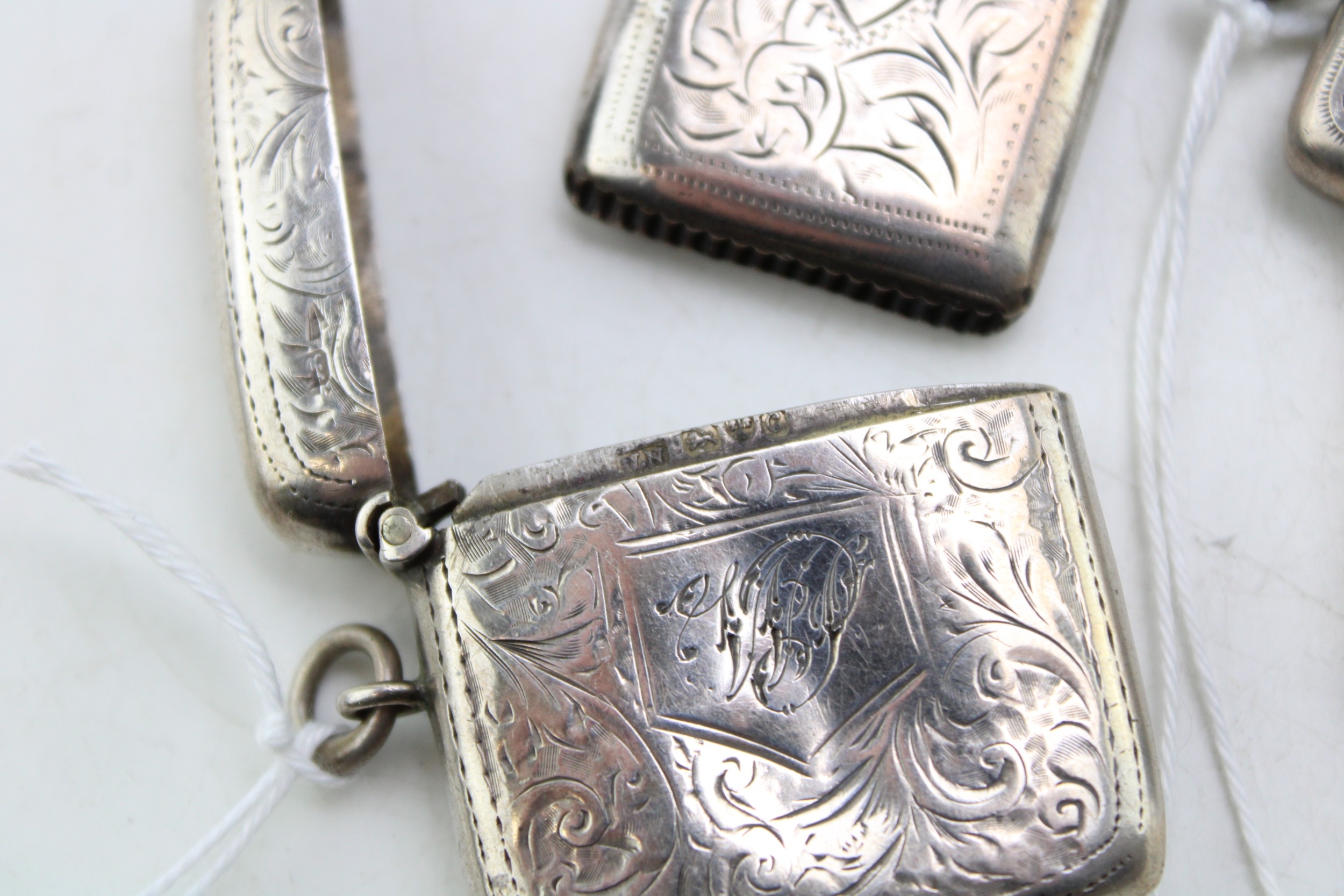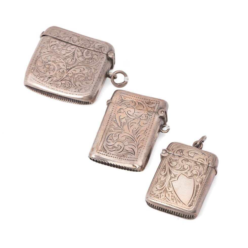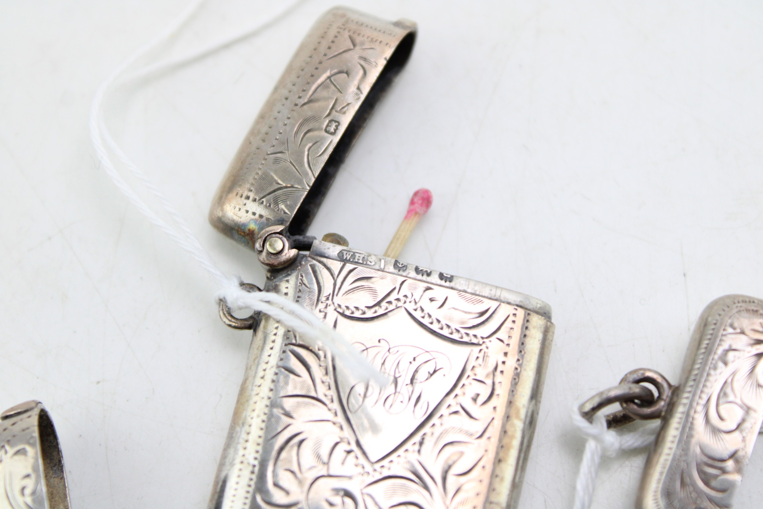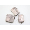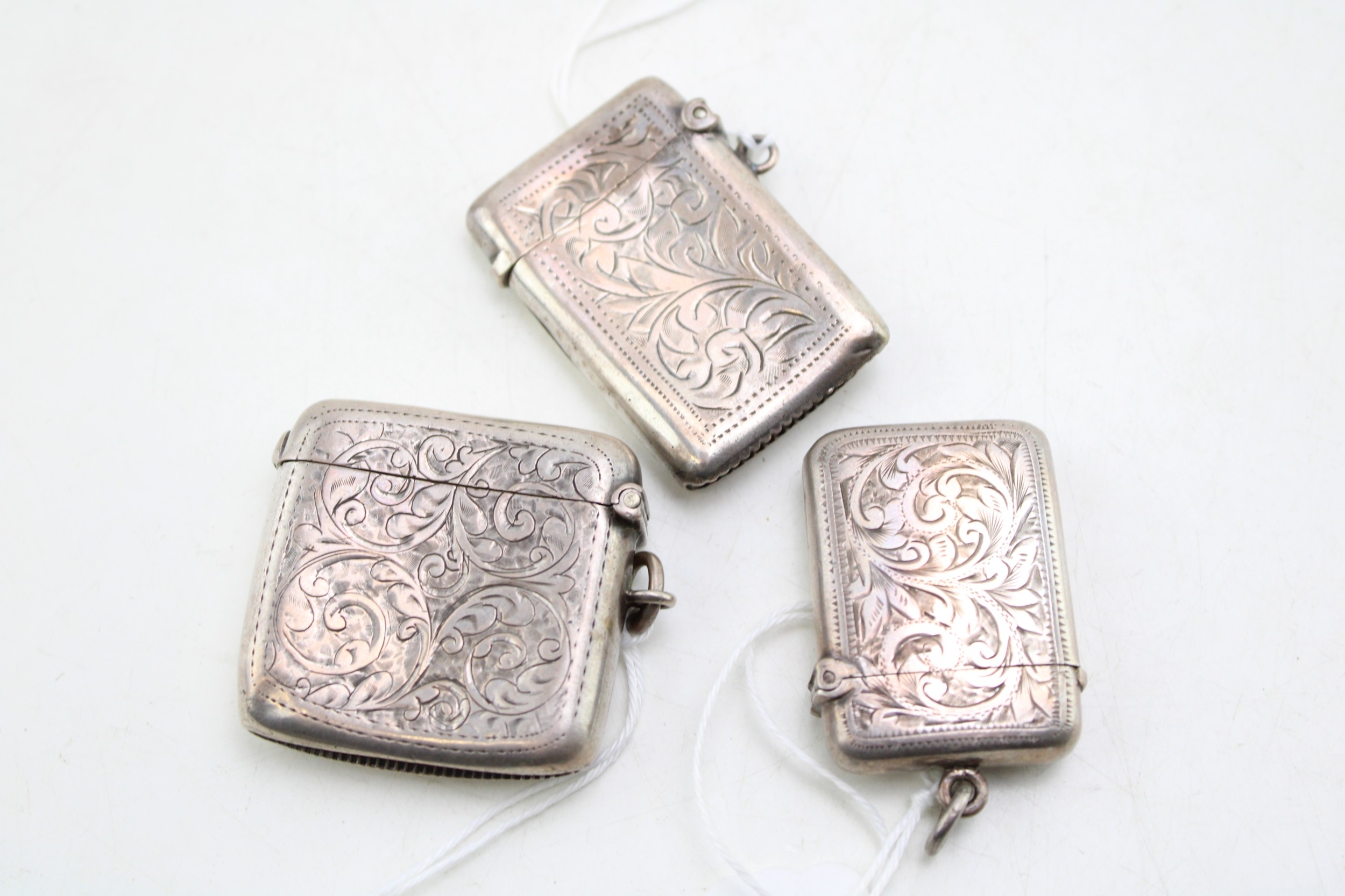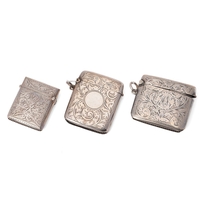 A group of three Victorian and later silver vesta cases, all foliate engraved, with shield reserves, comprising one of simple rectangular form, William Henry Sparrow, Birmingham 1900, monogram engraved, and two smaller similar, Turnbull Brothers, Birmingham 1902, and William Neale, Chester 1903, combined weight 55.5g, 1.78toz.