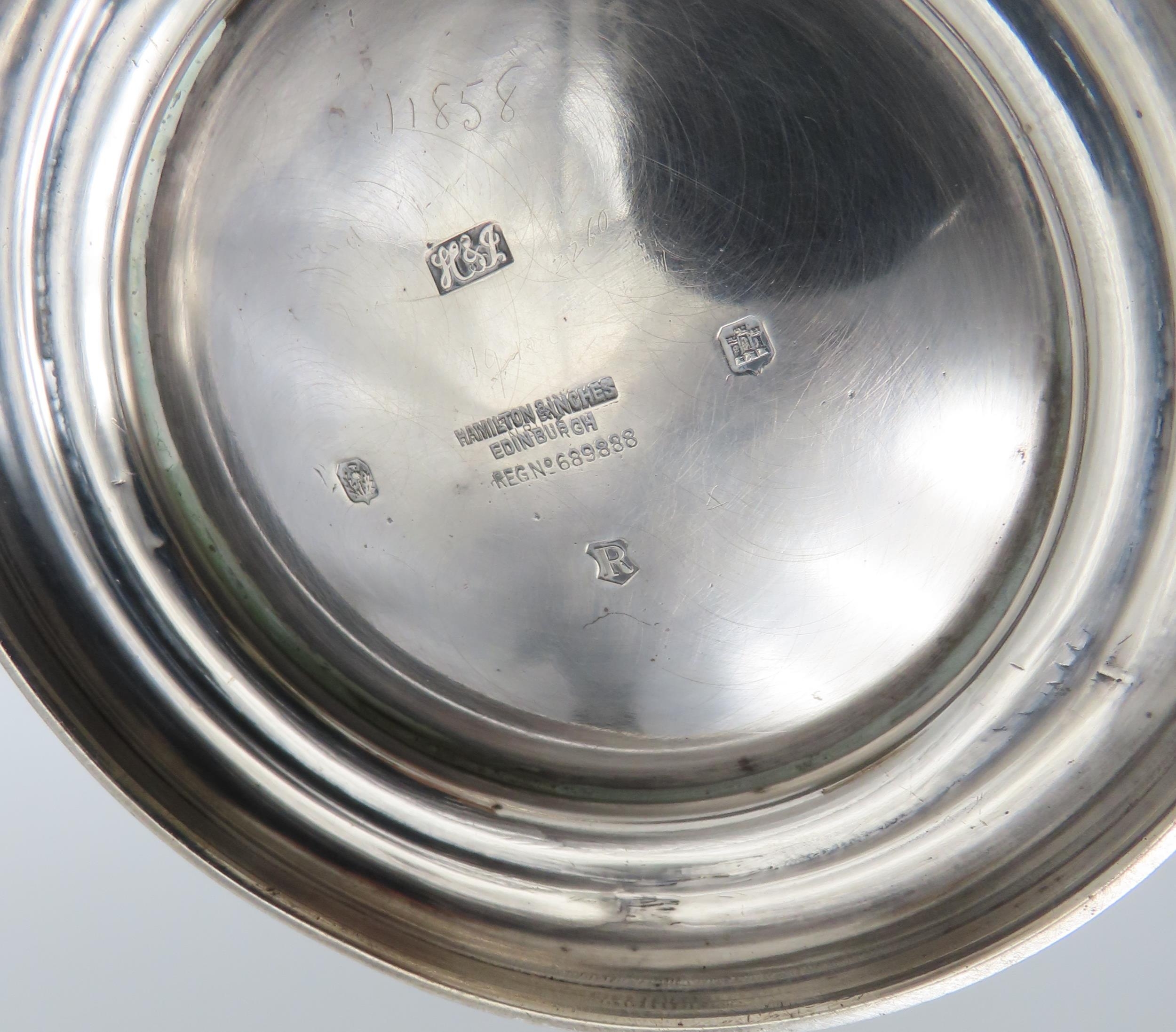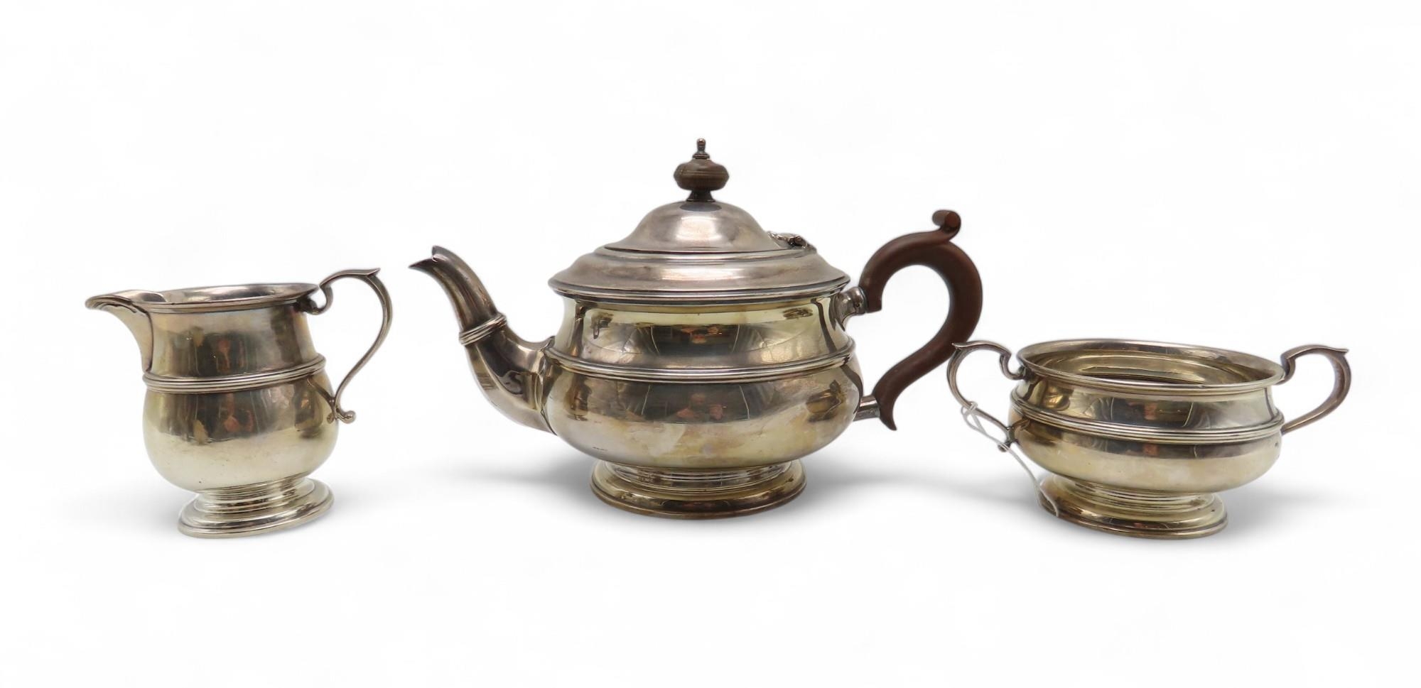 A Scottish three piece silver tea service, by Hamilton & Inches, Edinburgh 1922, of baluster form, the body girdled, 915gms (3)