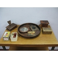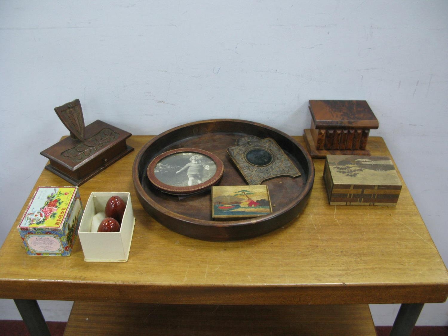A Collection of Wooden Items, hardwood tray, hardwood boxes, one with secret drawer, wooden photograph frame, two wooden pocket watch stands, boxed, salt and pepper, boxed.