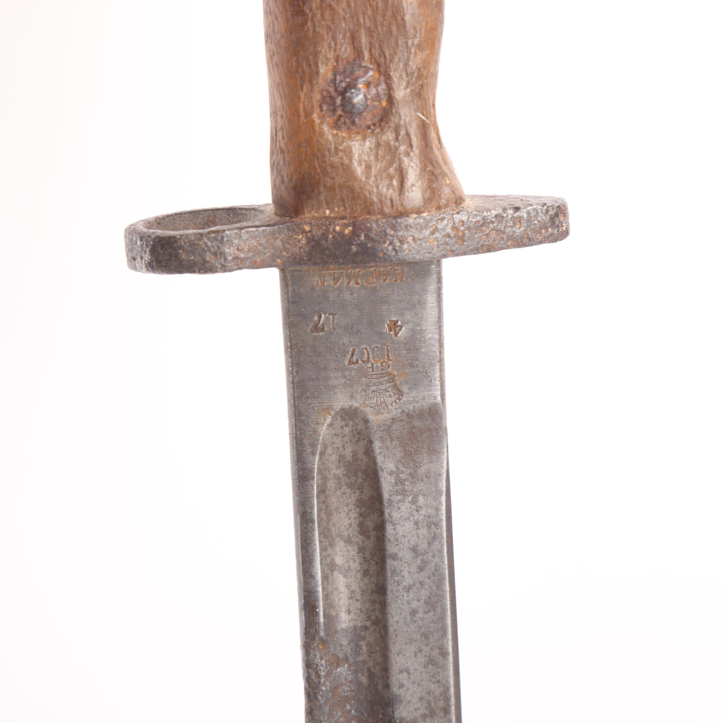 An Edwardian military sword bayonet, blade stamped Chapman 1907, blade length 43cm, original metal and leather scabbard