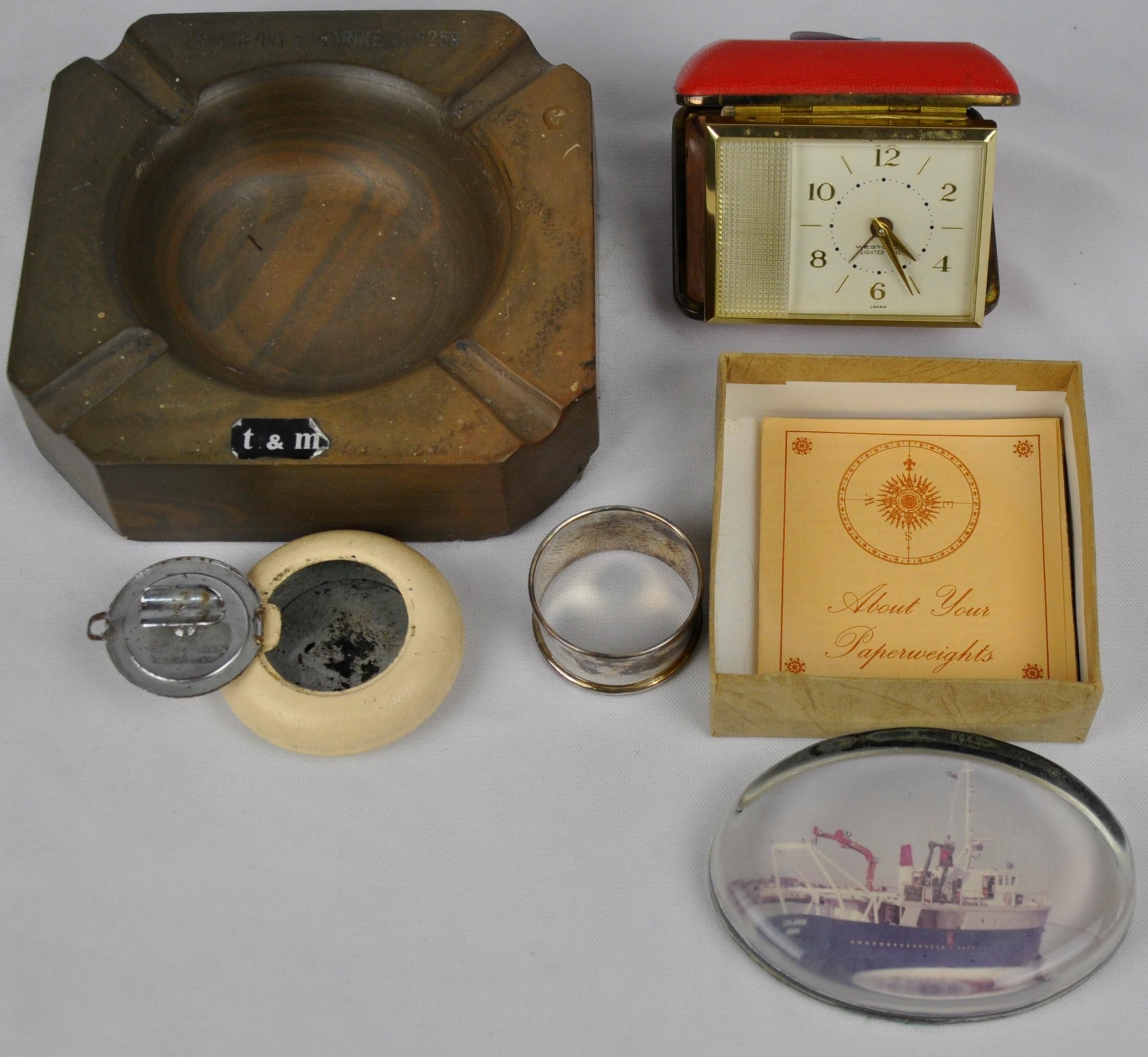 TRANSPORT AND MARINE ASHTRAY, SILVER NAPKIN RING, PAPERWEIGHT, TRAVEL CLOCK AND TRAVEL ASHTRAY