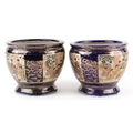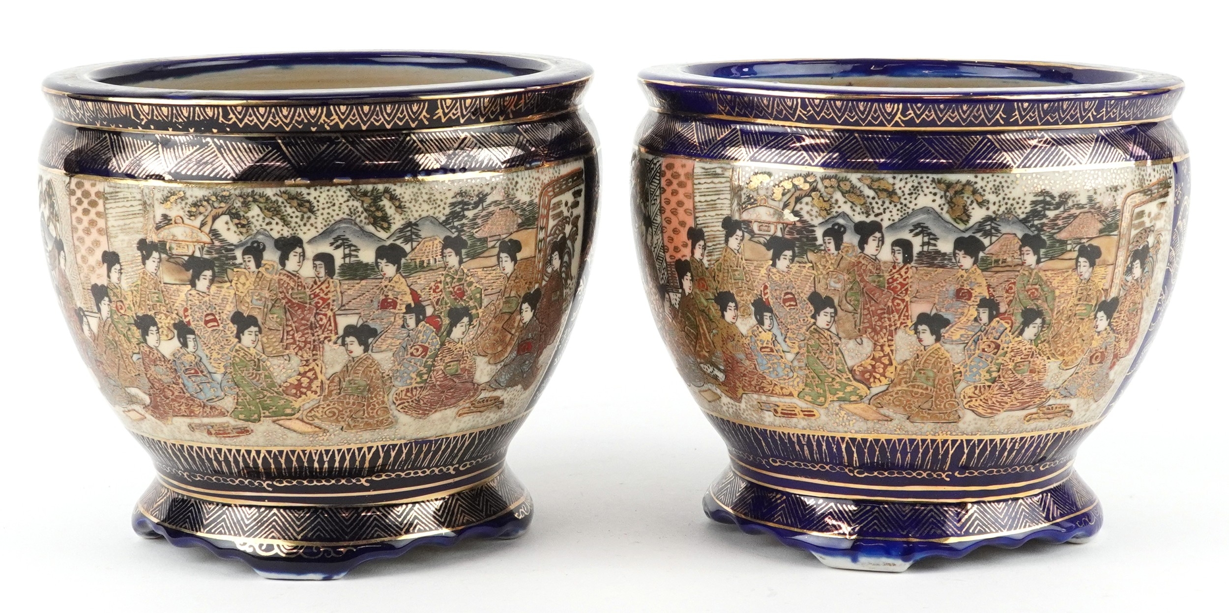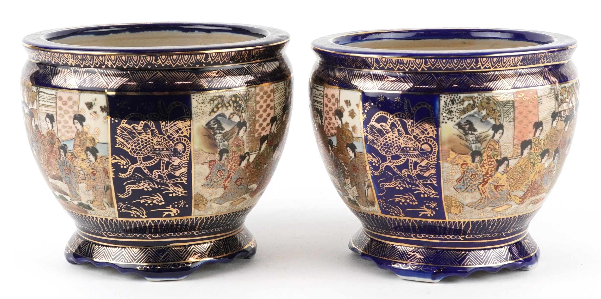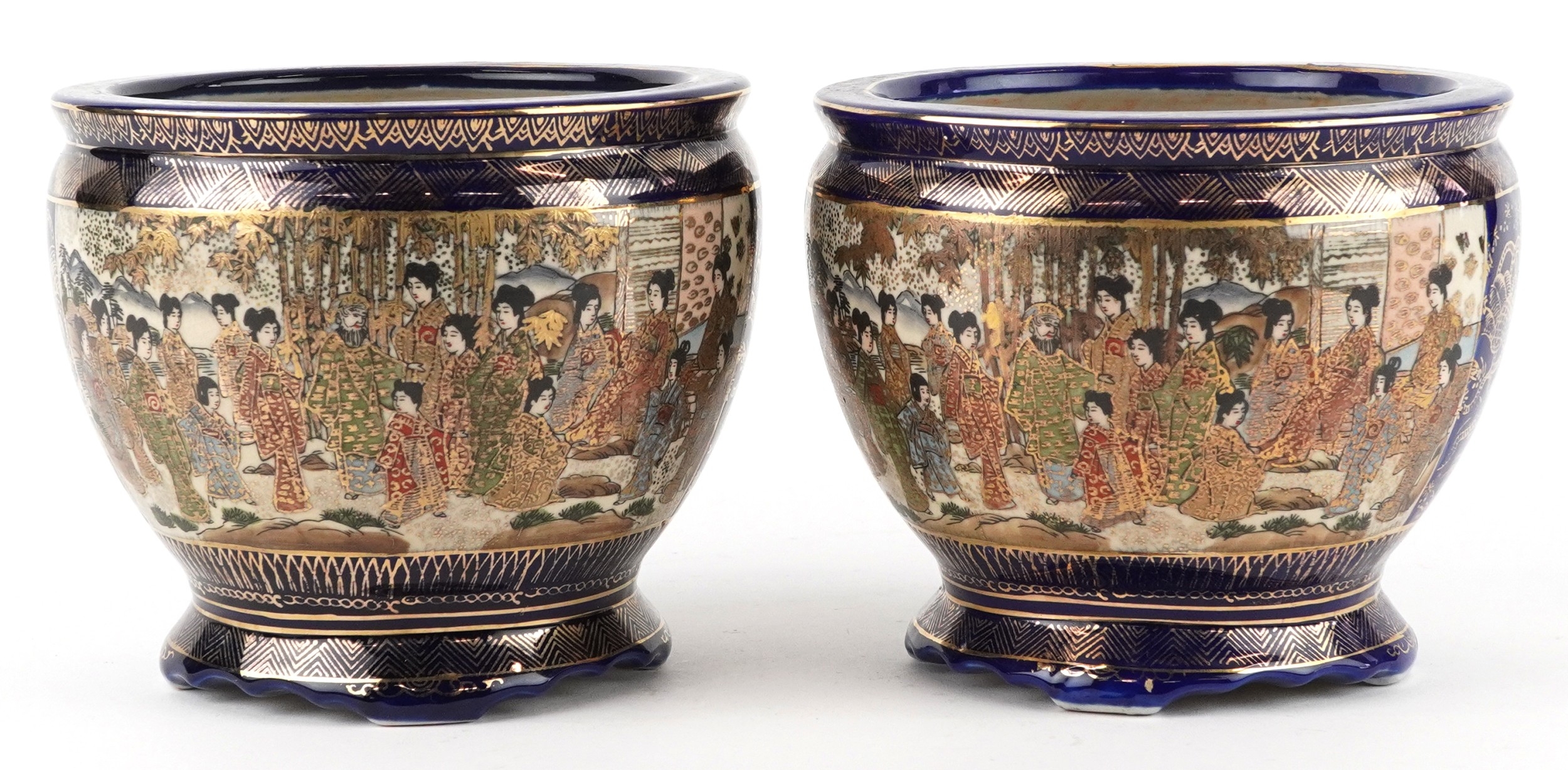 A pair of Japanese Satsuma earthenware jardinières finely hand painted with panels of figures onto a blue and gilt ground, 12.5cm high.