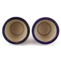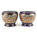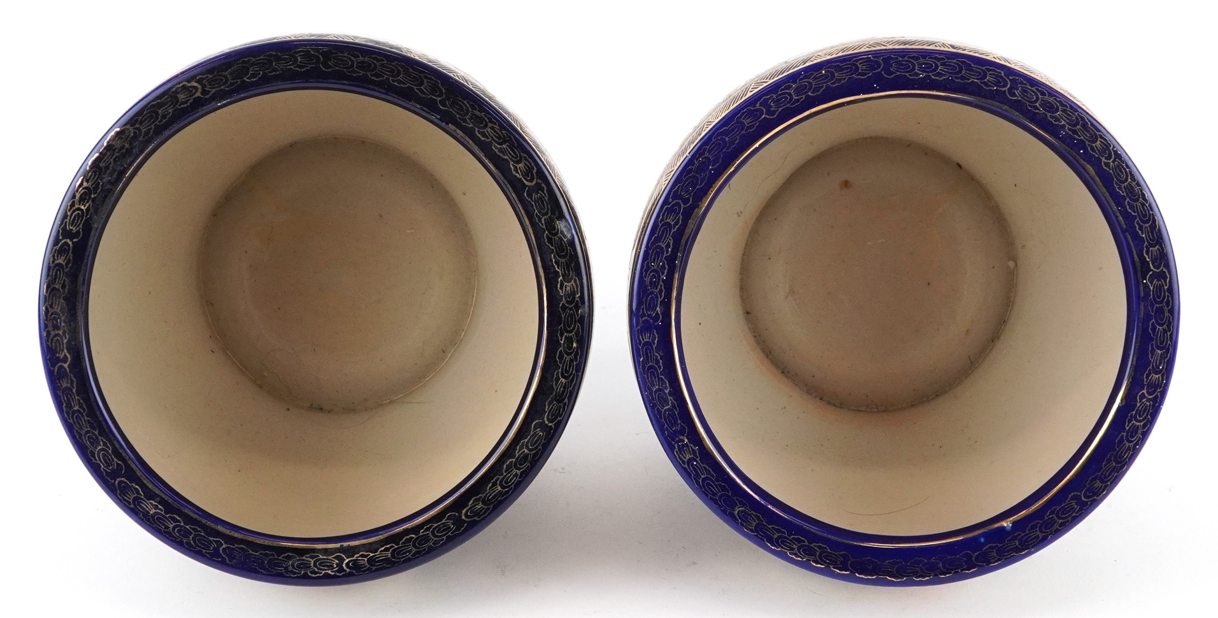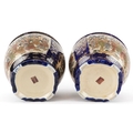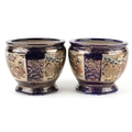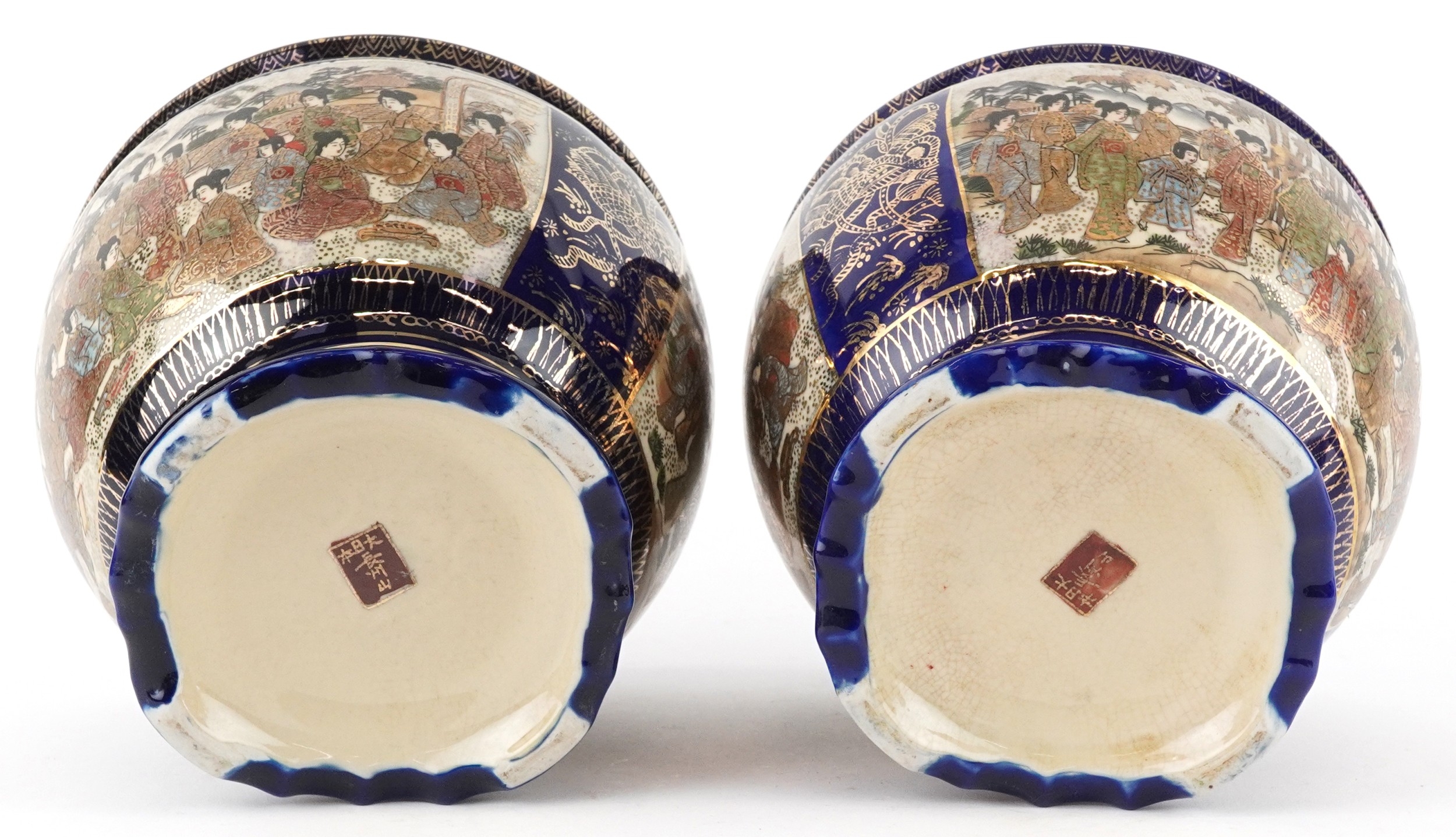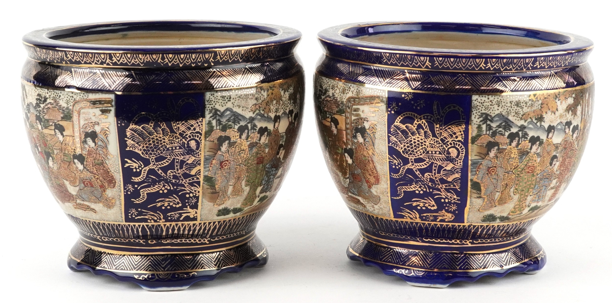 A pair of Japanese Satsuma earthenware jardinières finely hand painted with panels of figures onto a blue and gilt ground, 12.5cm high.