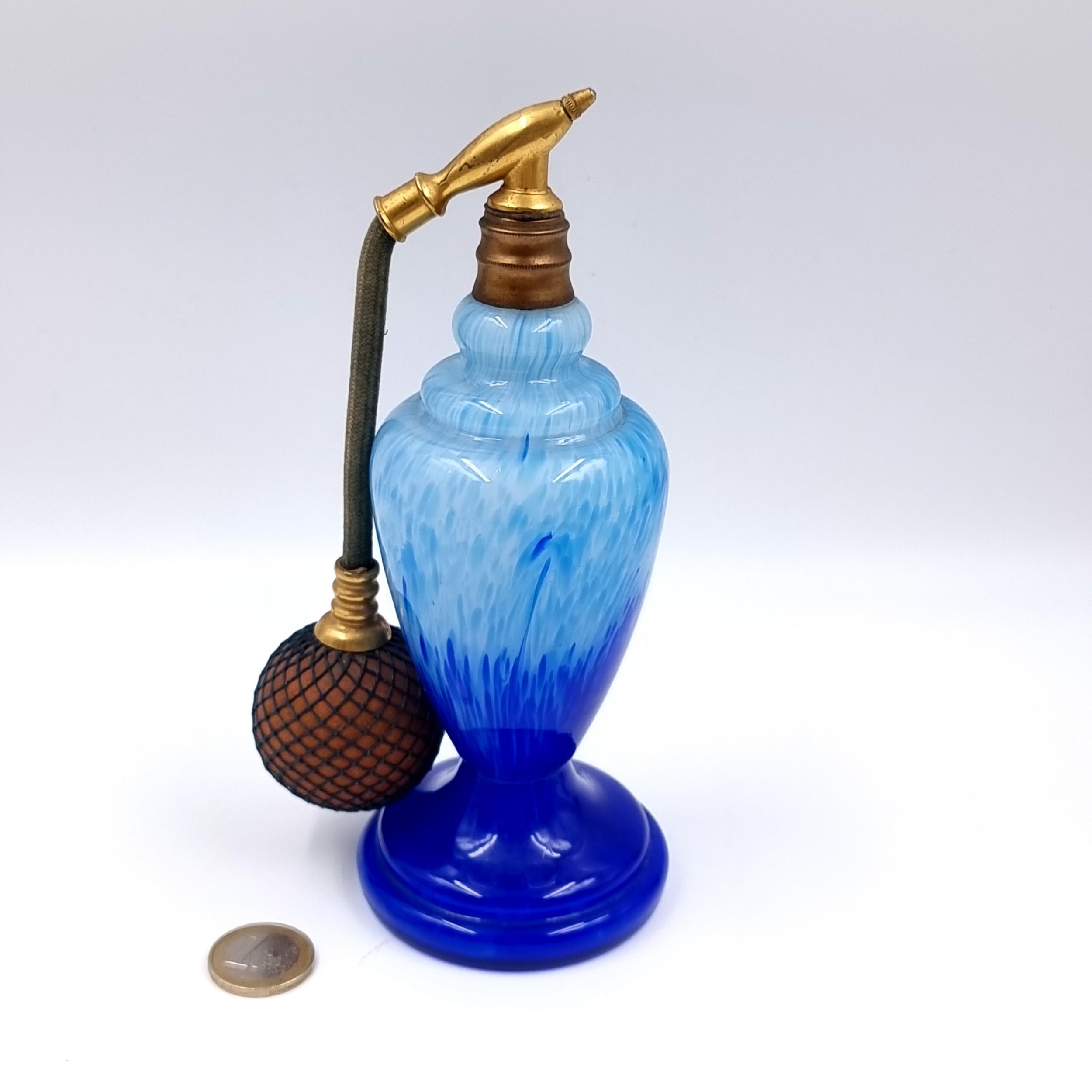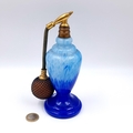 A striking quality antique Czech circa 1900/10 perfume atomizer by Rugkel. This Blue double hue glass example has brass fitting mounts with attached pump with no cracks, chips or imperfections. Dimensions - 18CM x 6.5CM. Base - 7CM Diametre. Weight - 360 grams.