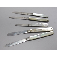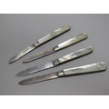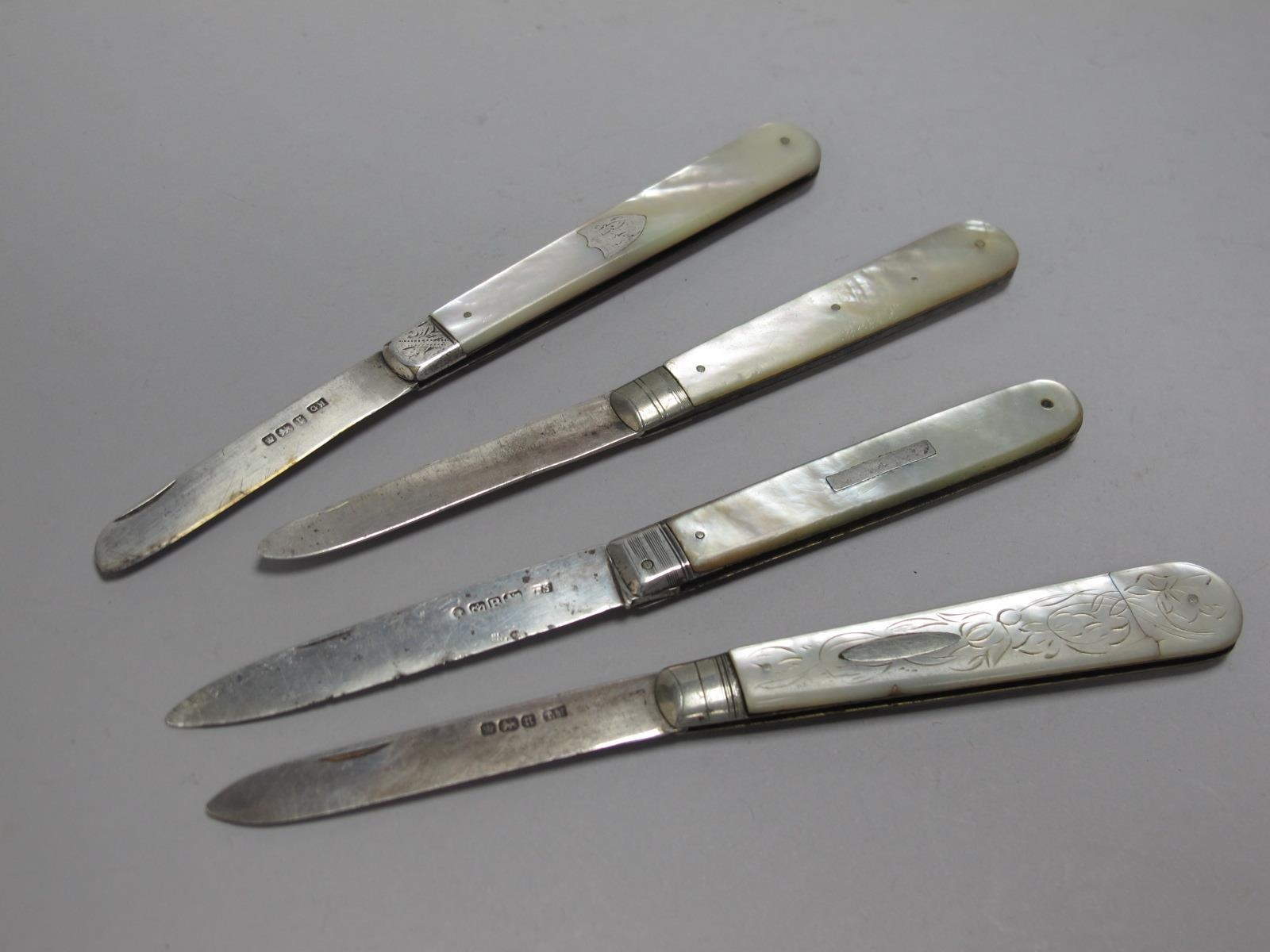 Four Hallmarked Silver and Mother of Pearl Folding Fruit Knives, (various makers / dates) (damages). (4)