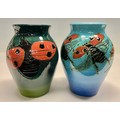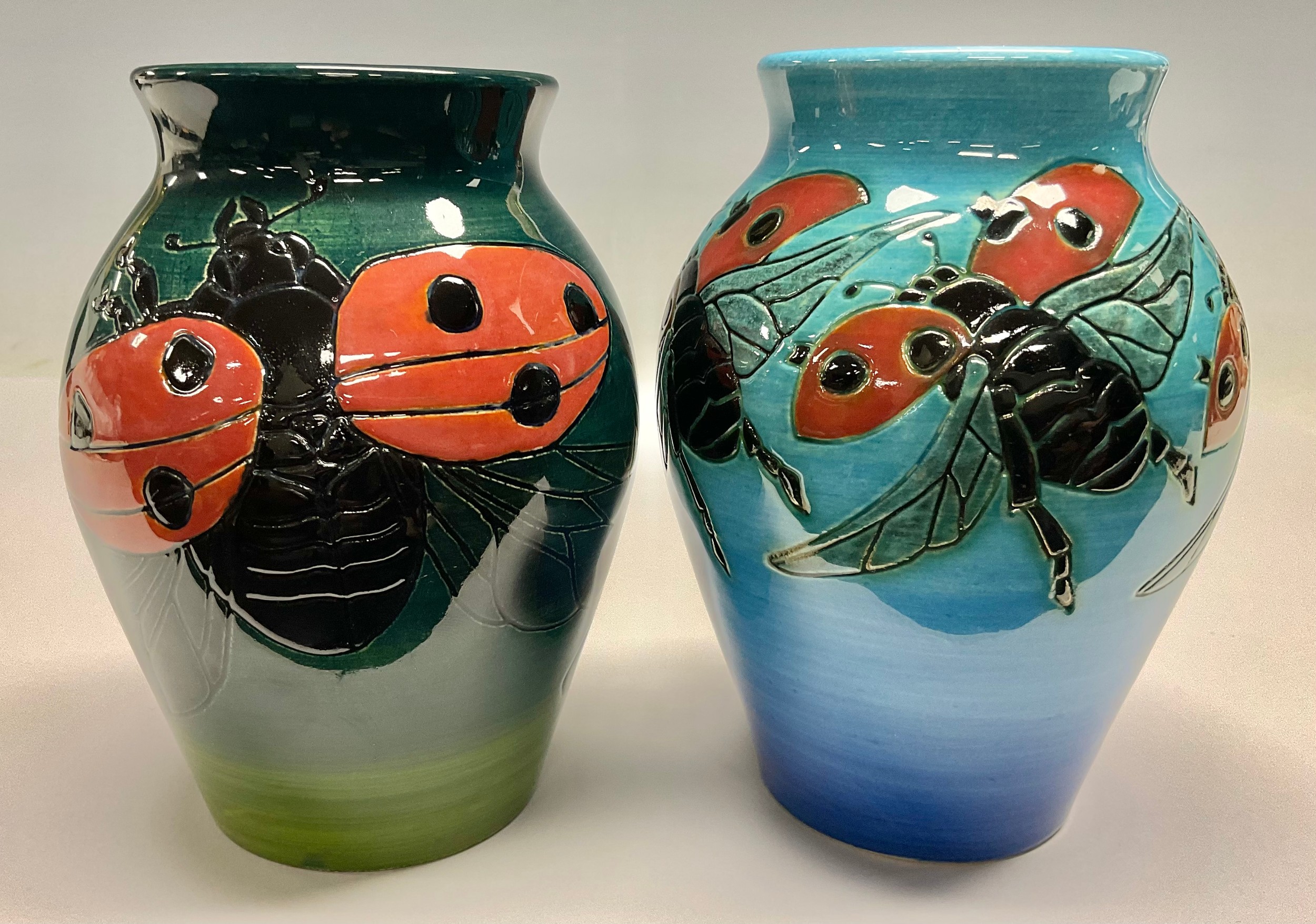 A Dennis China Works vase decorated to a design by Sally Tuffin with ladybirds against a blue wash ground, impressed and painted marks, no 14/98, another green ground, No 13/98, each approx 13cm high (2)