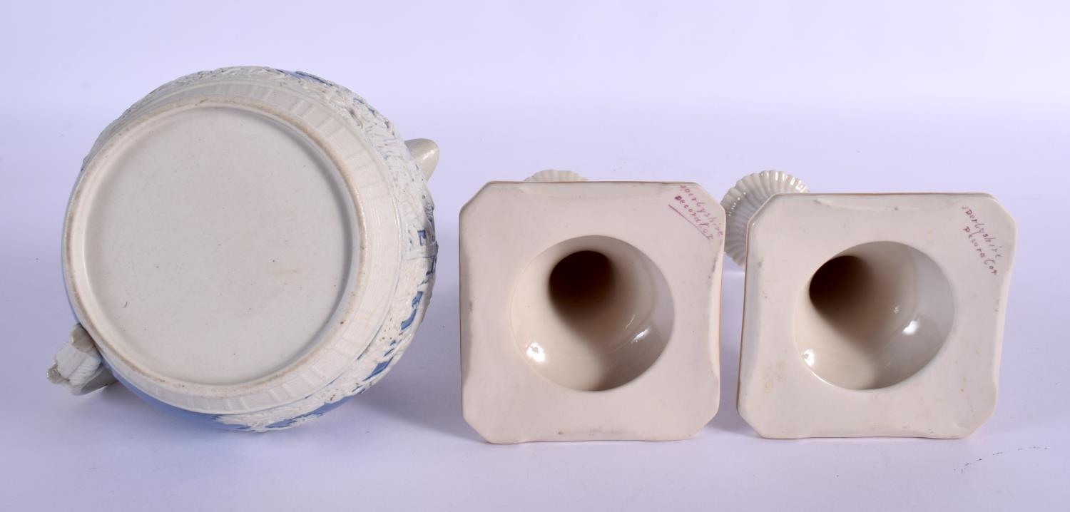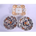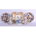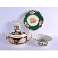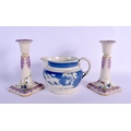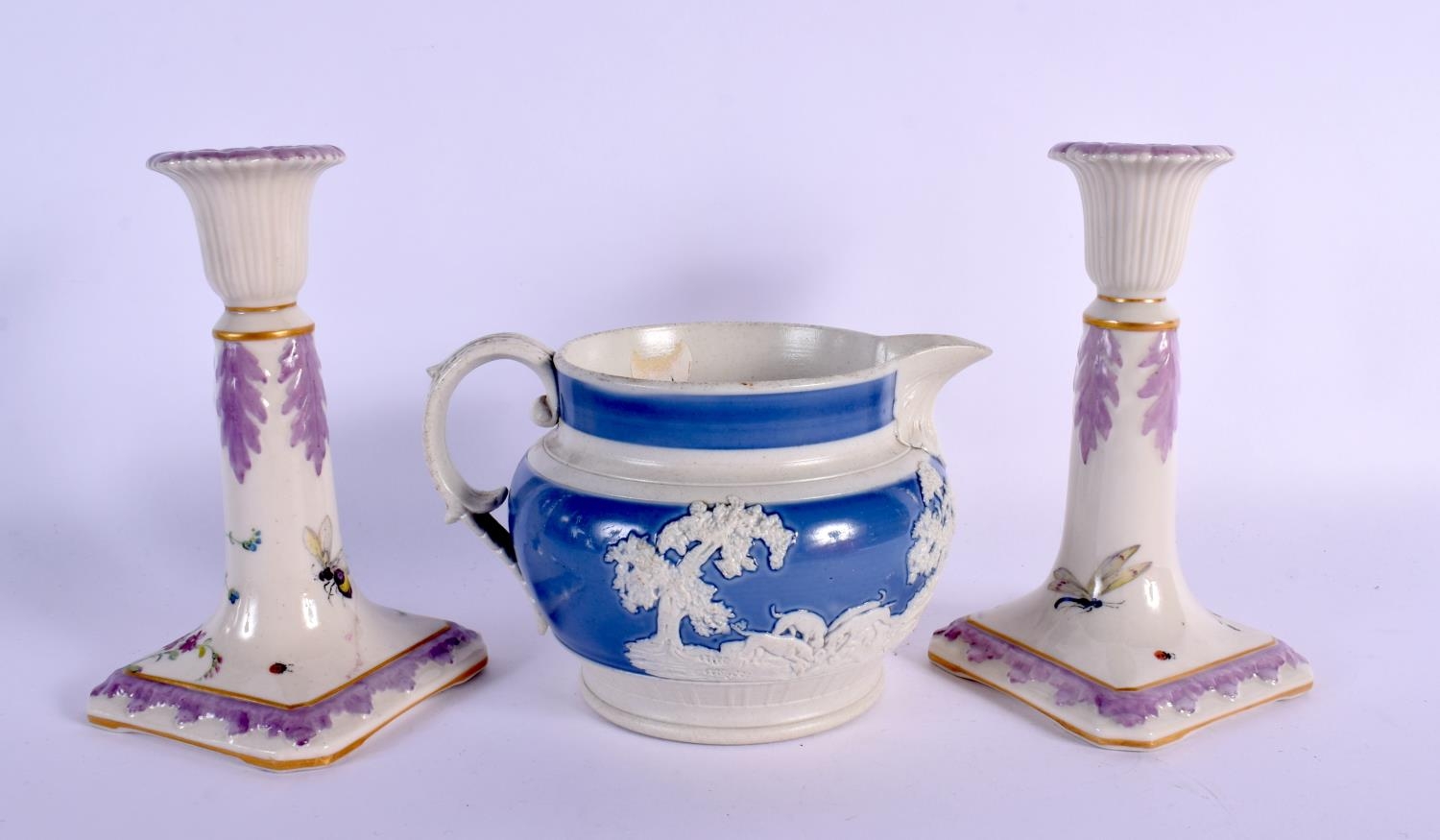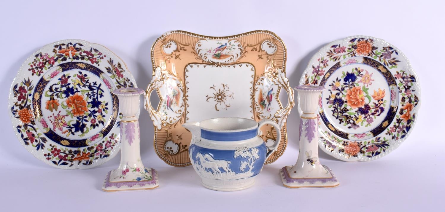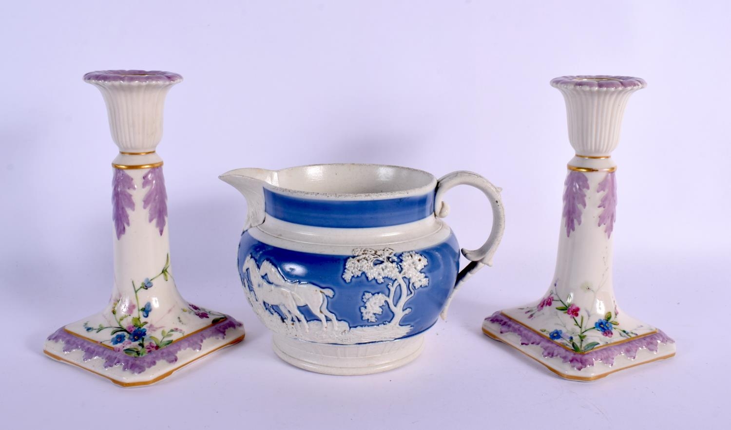 AN ANTIQUE POTTERY HUNTING JUG together with a Ridgway plate, candlesticks etc. (6)
