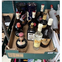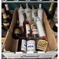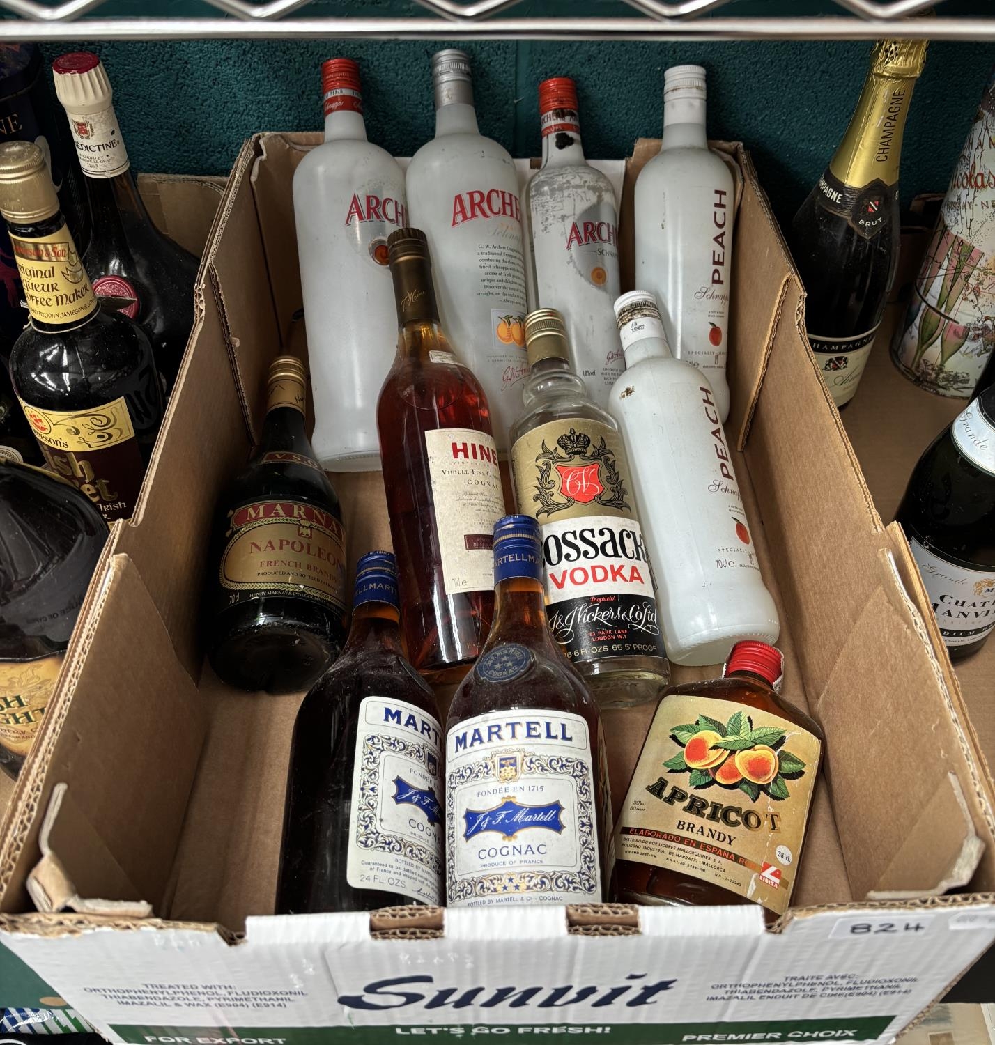 Box containing assorted alcohol including Cossack Vodka, brandy and Archers