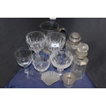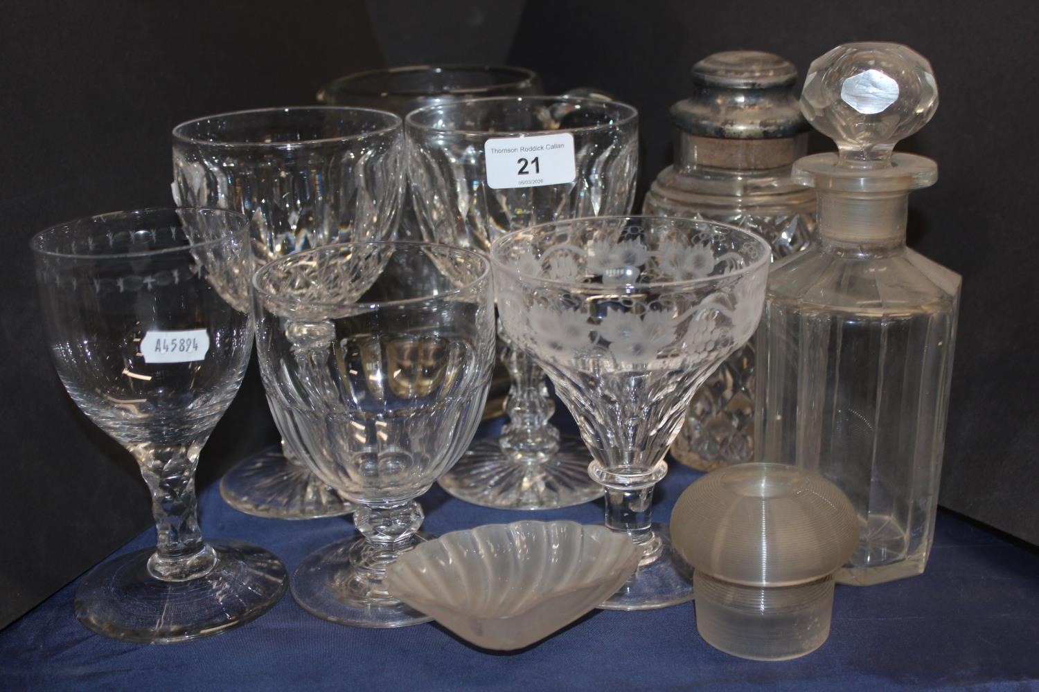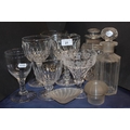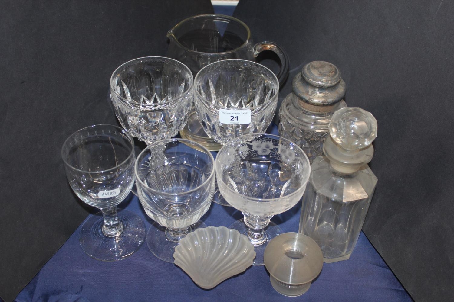 Pair of cut-glass goblets, glass rummers, a decanter, a cocktail shaker, a picture, a shell ashtray, etc.