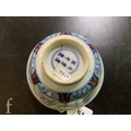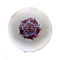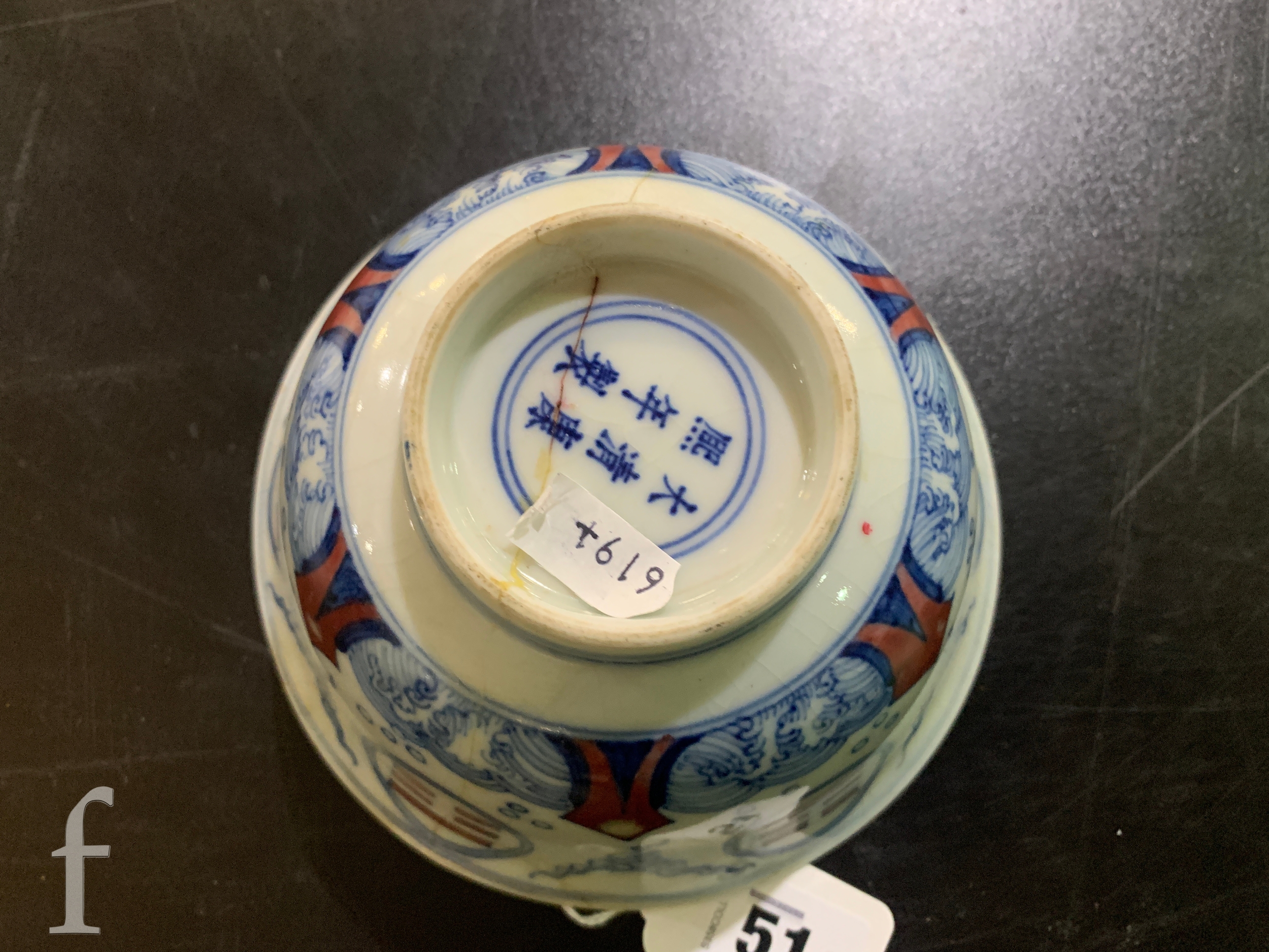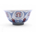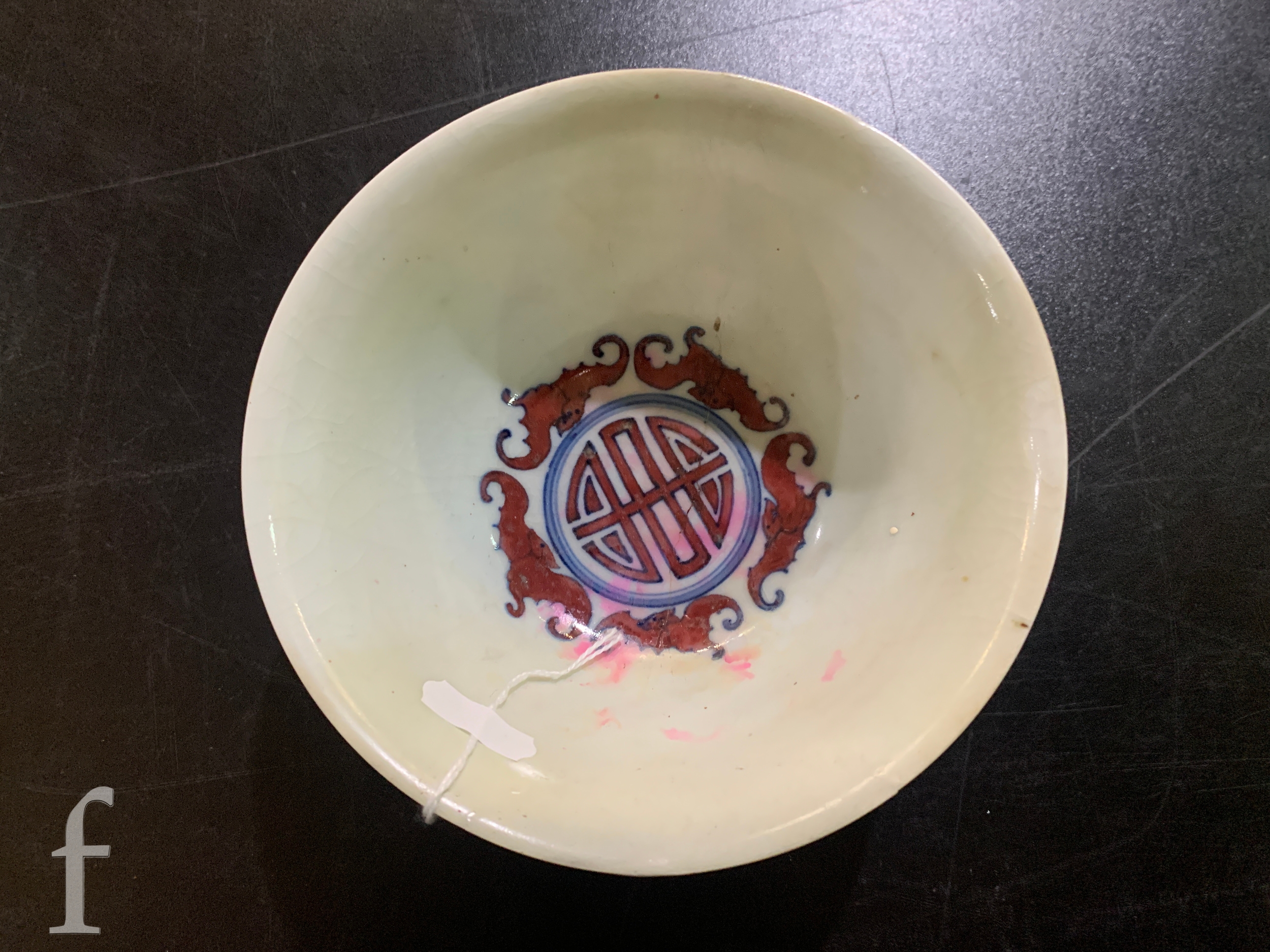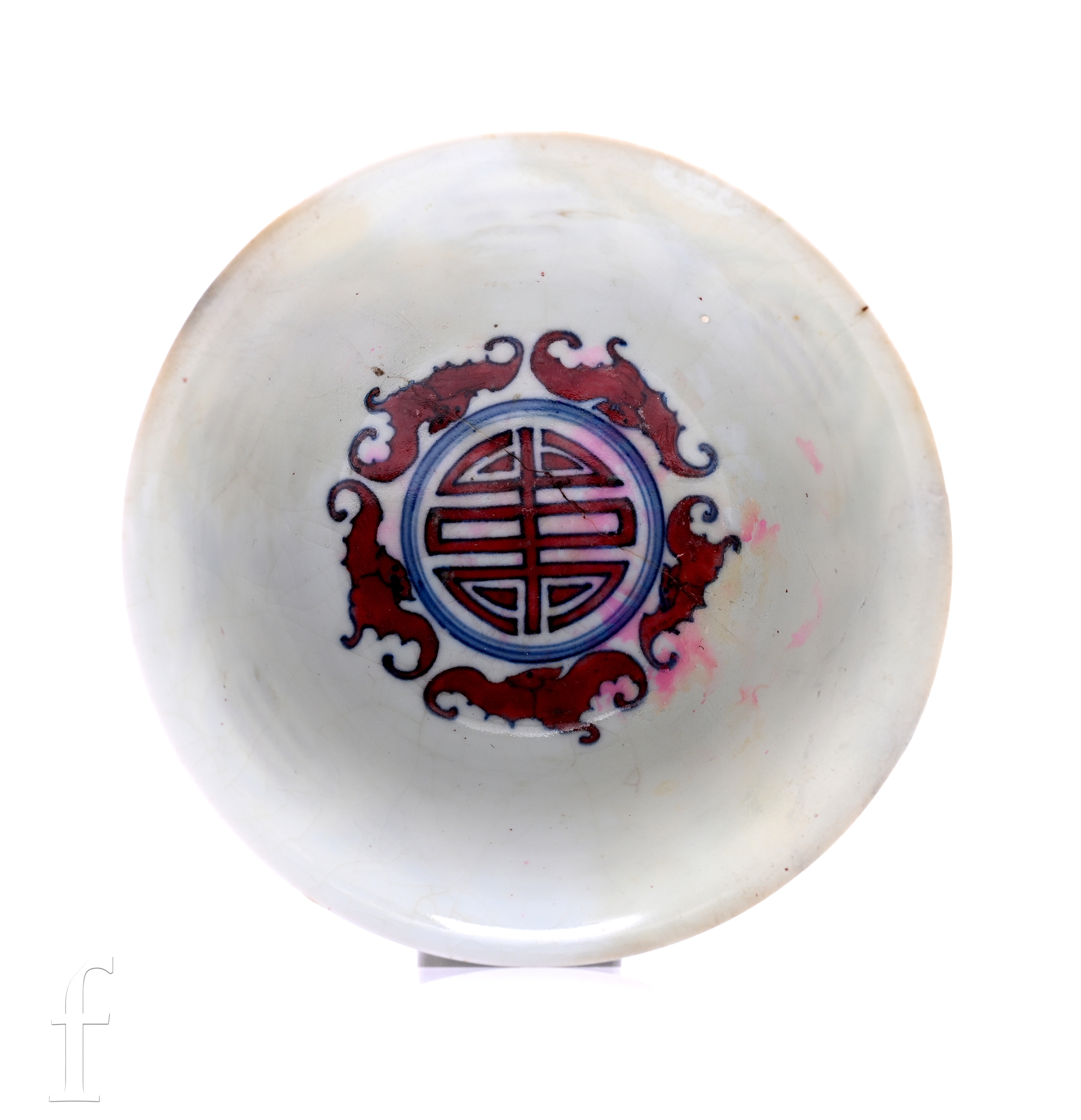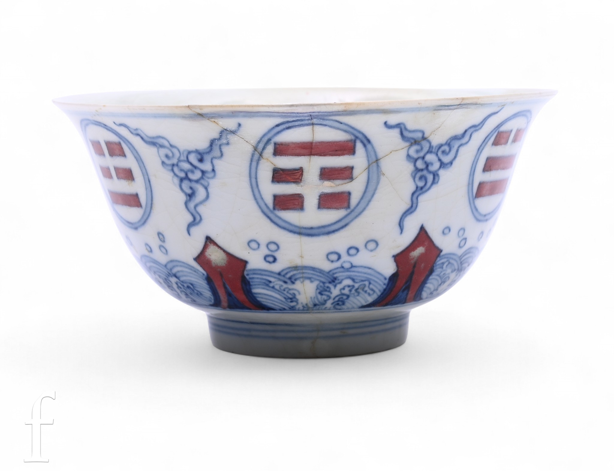 A Chinese copper-red and underglaze blue 'Trigram' bowl, the high footrim rising to gently sloped sides, with six roundels and waves, the central well with Auspicious character and ruyi bats, Kangxi Six-Character mark to base, height 7.5cm, diameter 15.5cm.