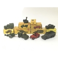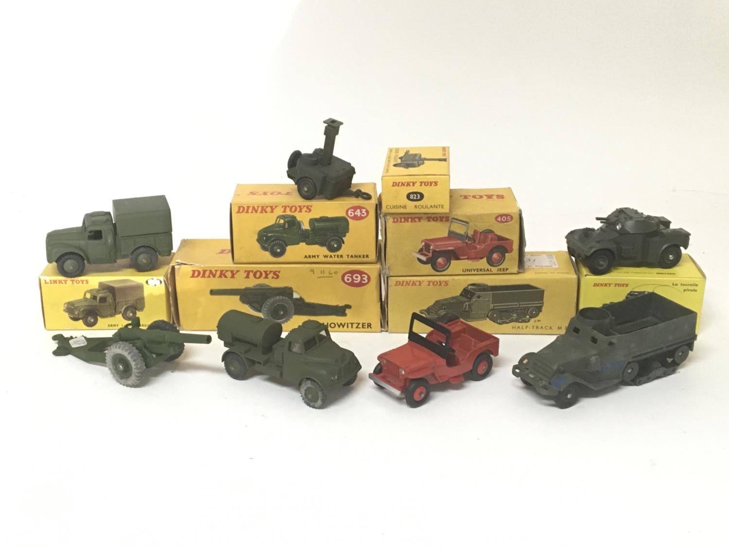 Dinky toys, Military vehicles, #822 Half track, #693 7.2 howitzer, #643 Army water tanker, #405 Universal Jeep, #641 Army 1 ton cargo truck #814 AML Armoured car and #823 Army field kitchen, boxed
