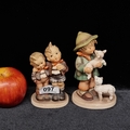 Two vintage porcelain Goebel Hummel figurines, one 1960s example titled "Two Brothers" of two young boys in neckerchiefs, H 13cm. And a 1950s example titled "Shepherd's Boy", H 14.5cm. (sd one lamb)