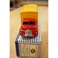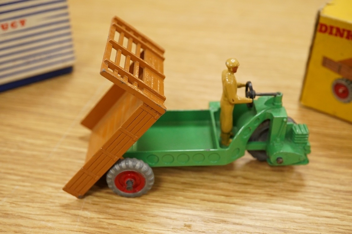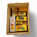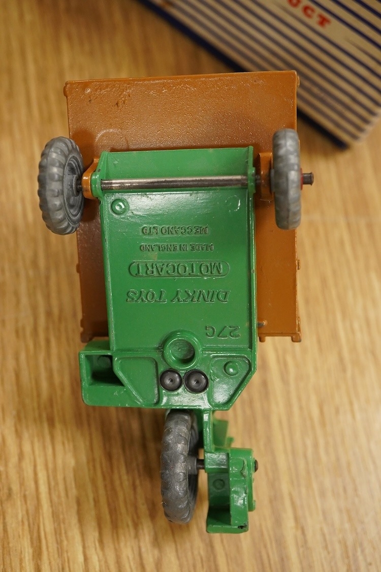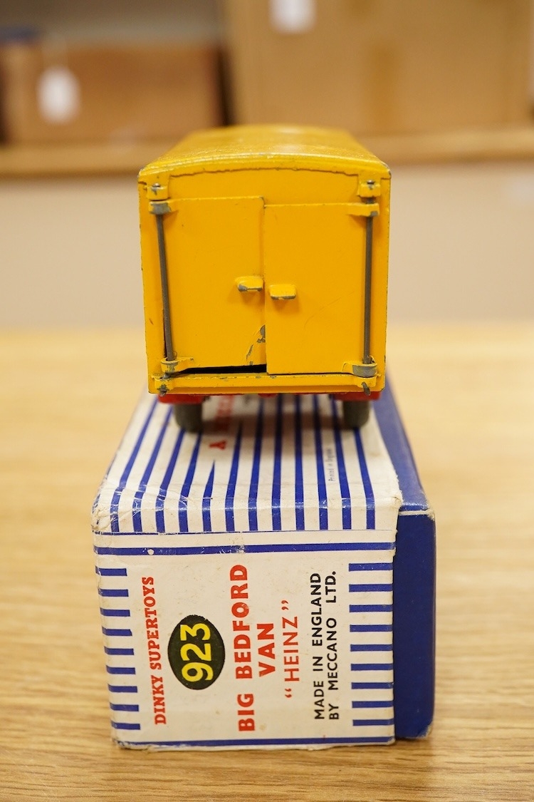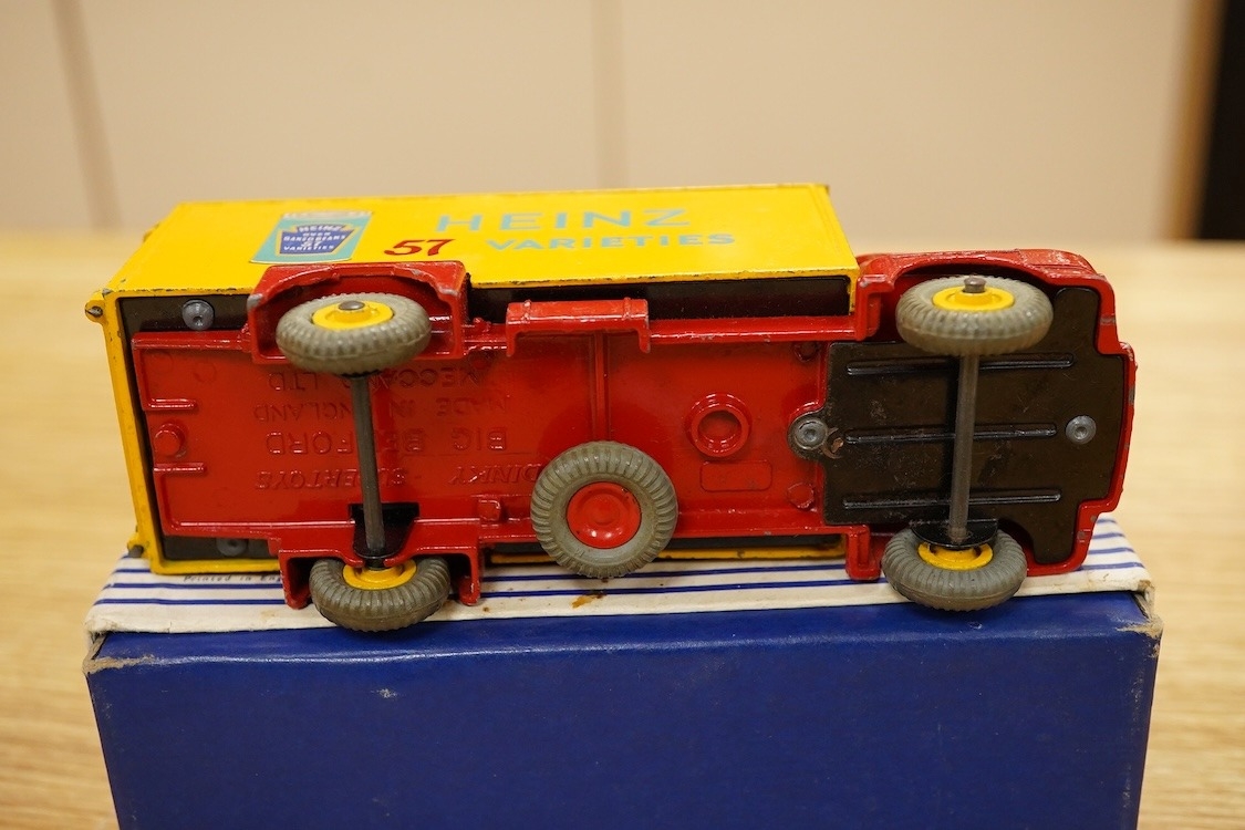 Nine Dinky Toys; Big Bedford Heinz van (923), Austin Atlantic Convertible (106), Austin-Healey 100 (109), M.G. Midget (108), Cunningham C-5R (133), Motocart (342), Austin Champ (674), Army Covered Wagon (623), and Army 1-ton Cargo Truck (641), all boxed or in the remains of their boxes
