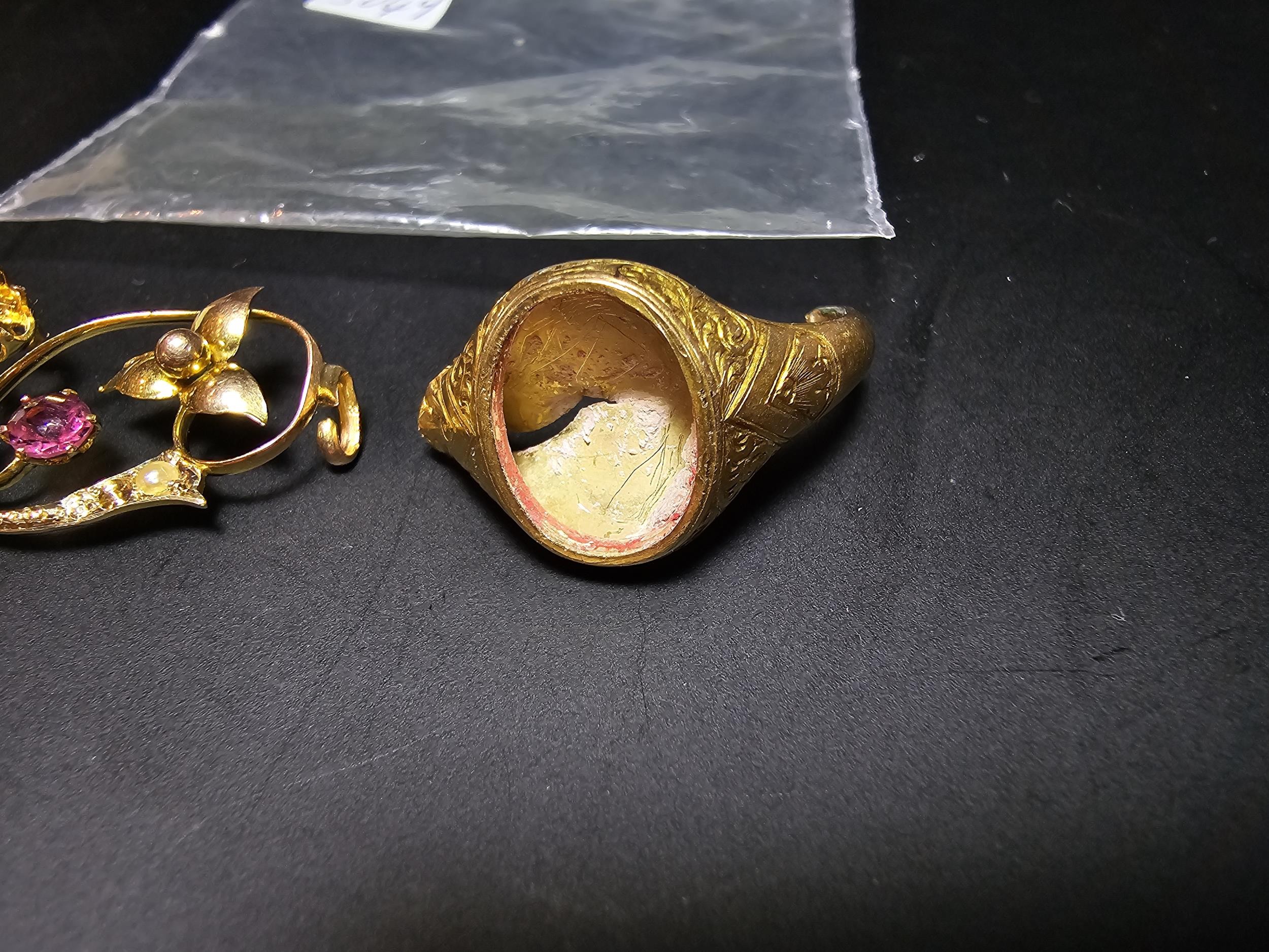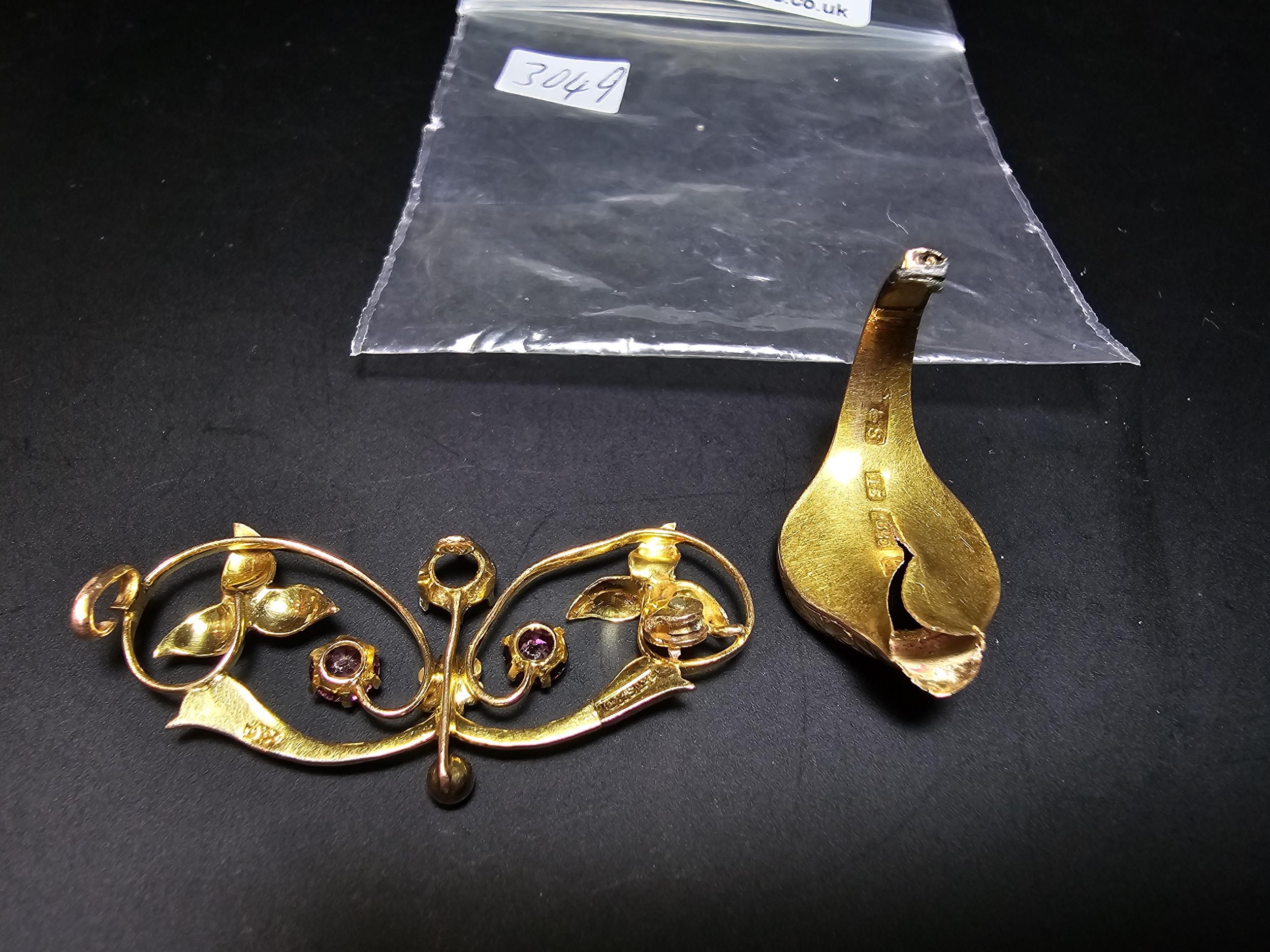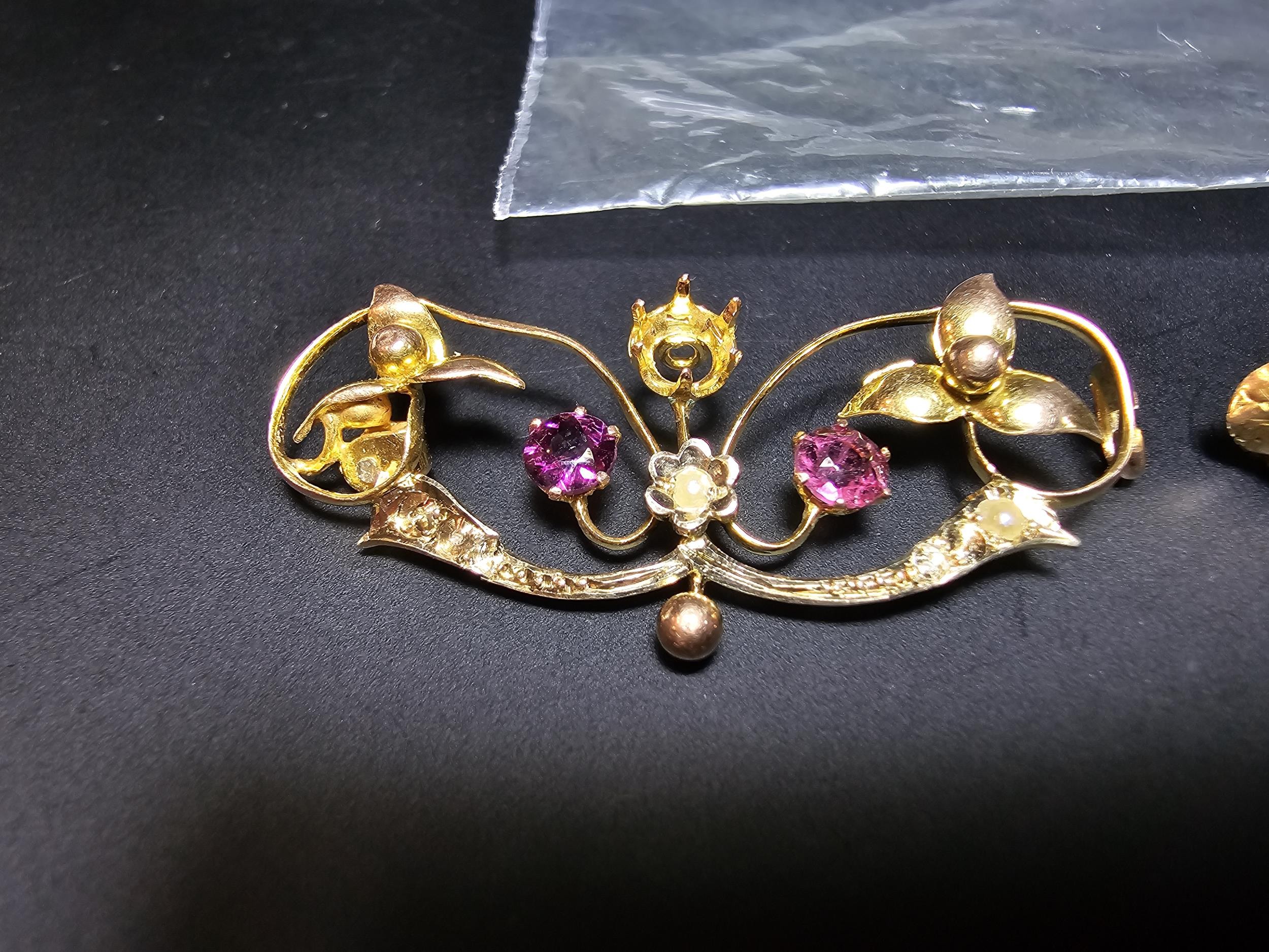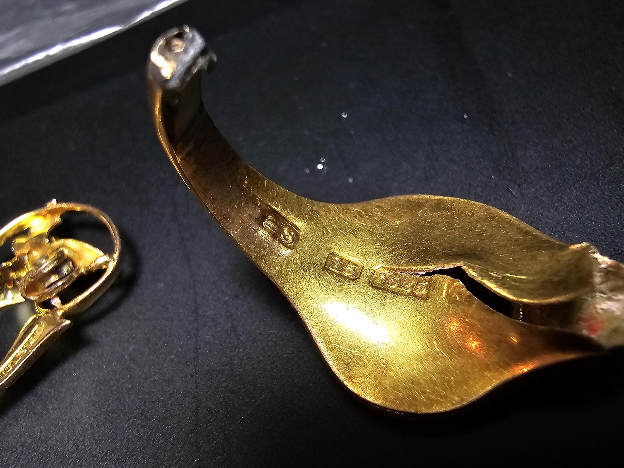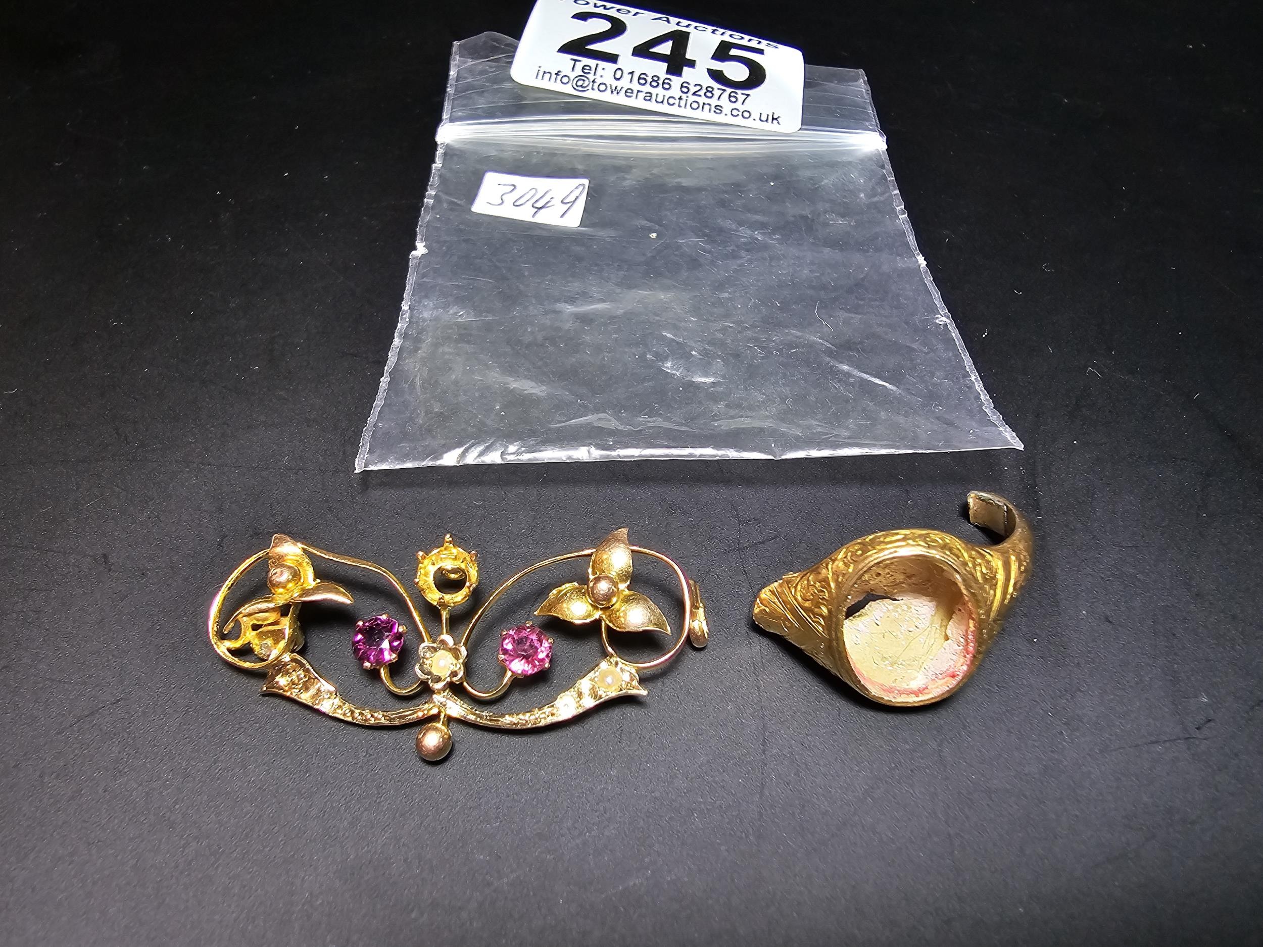 Small qty of scrap gold to include part of a hallmarked 15ct. gold ring, and a 9ct. hallmarked brooch. Weight of the 15ct. gold piece only is 2.22g and the weight of the 9ct. gold piece only is 1.87g.