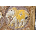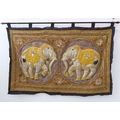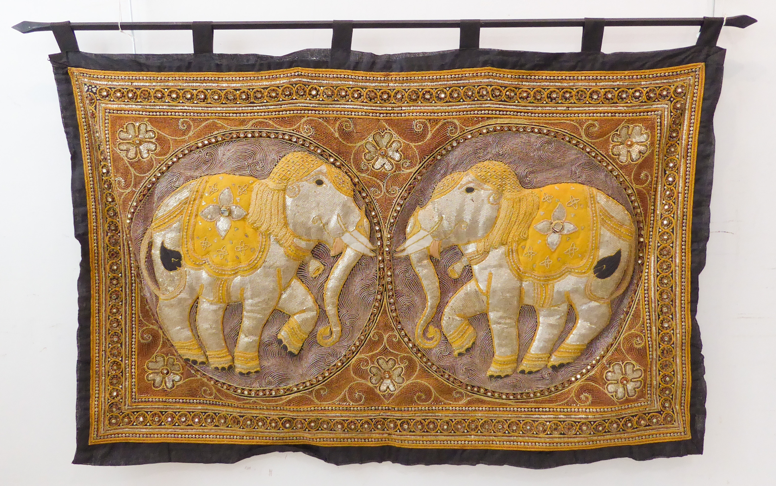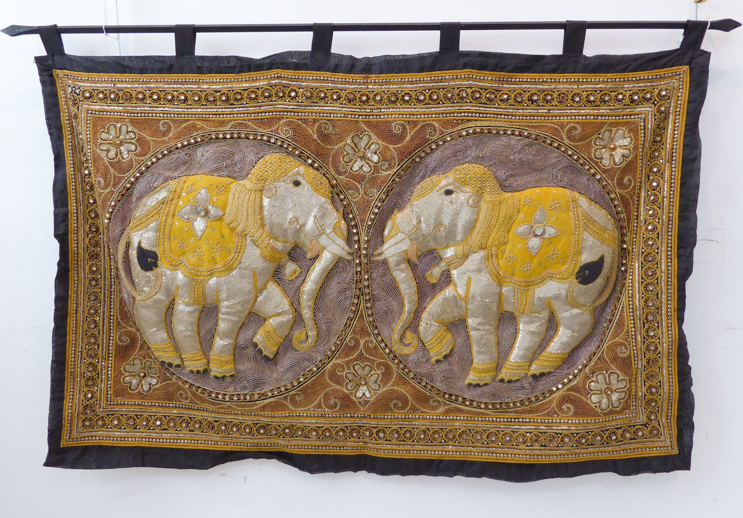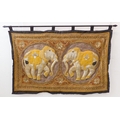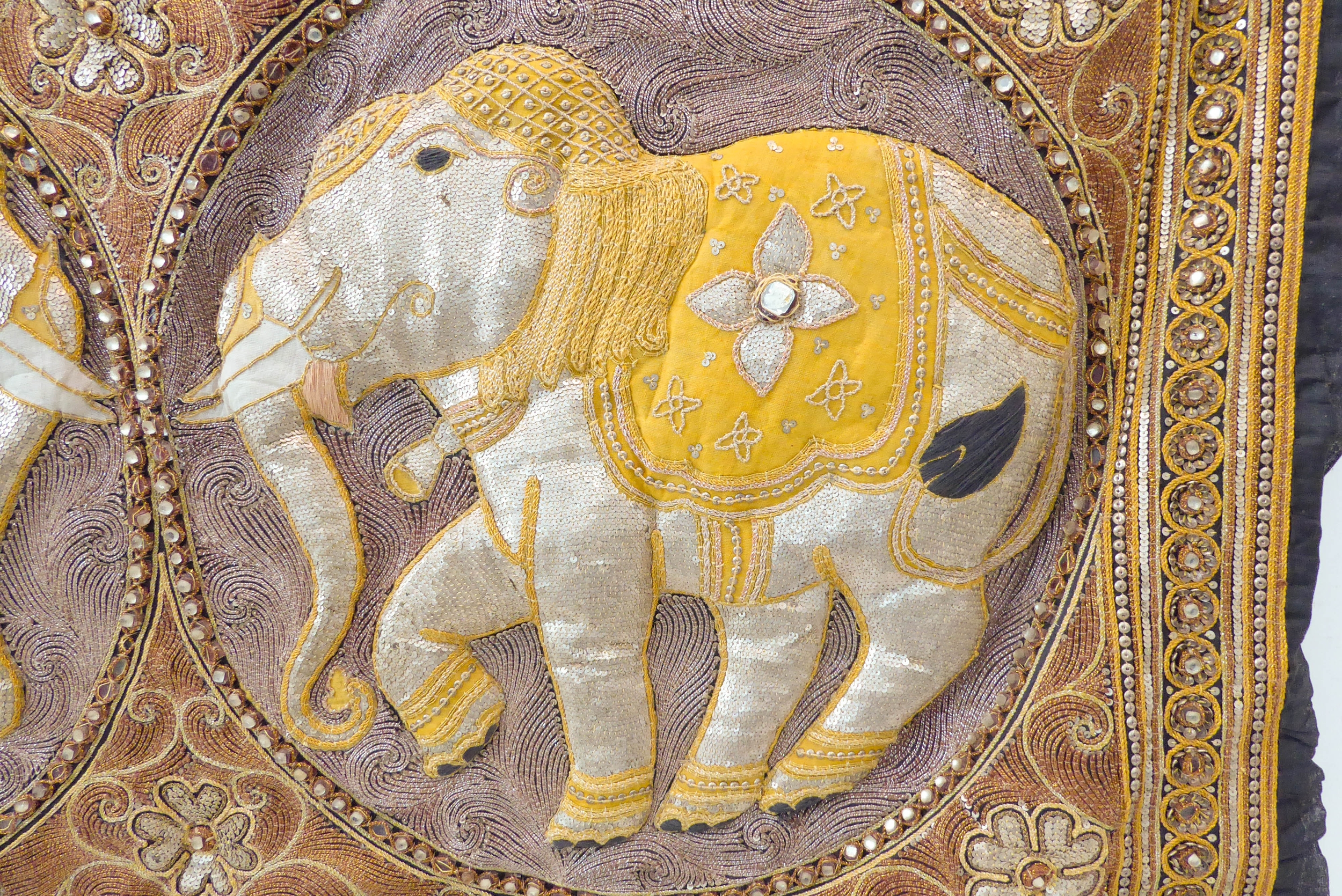 A very fine Indian needlework depicting two opposing elephants within roundels and surrounded by various hand-stitched beads and cut stones within conjoining circles (126.5cm x 82cm), together with iron hanging bar. The creation would have taken many months and 1000s of constituent parts to produce.