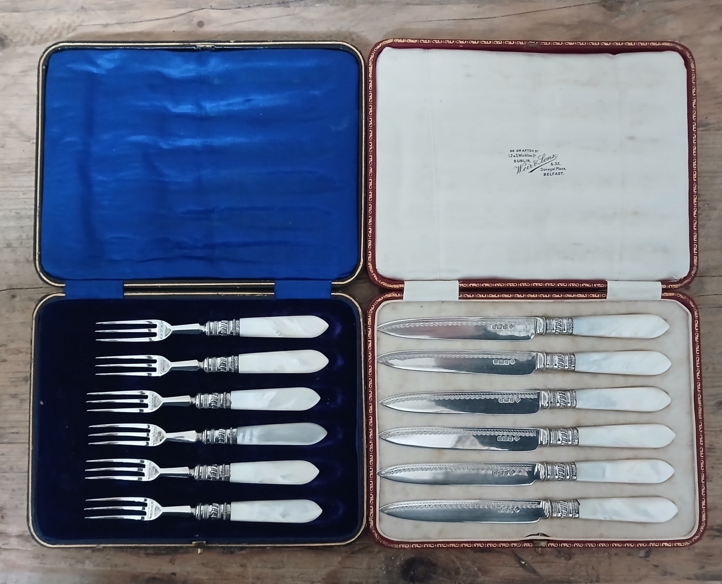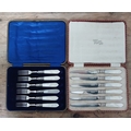 A set of hallmarked silver bladed/pronged and mother of pearl handled knives and forks, associated boxes.
