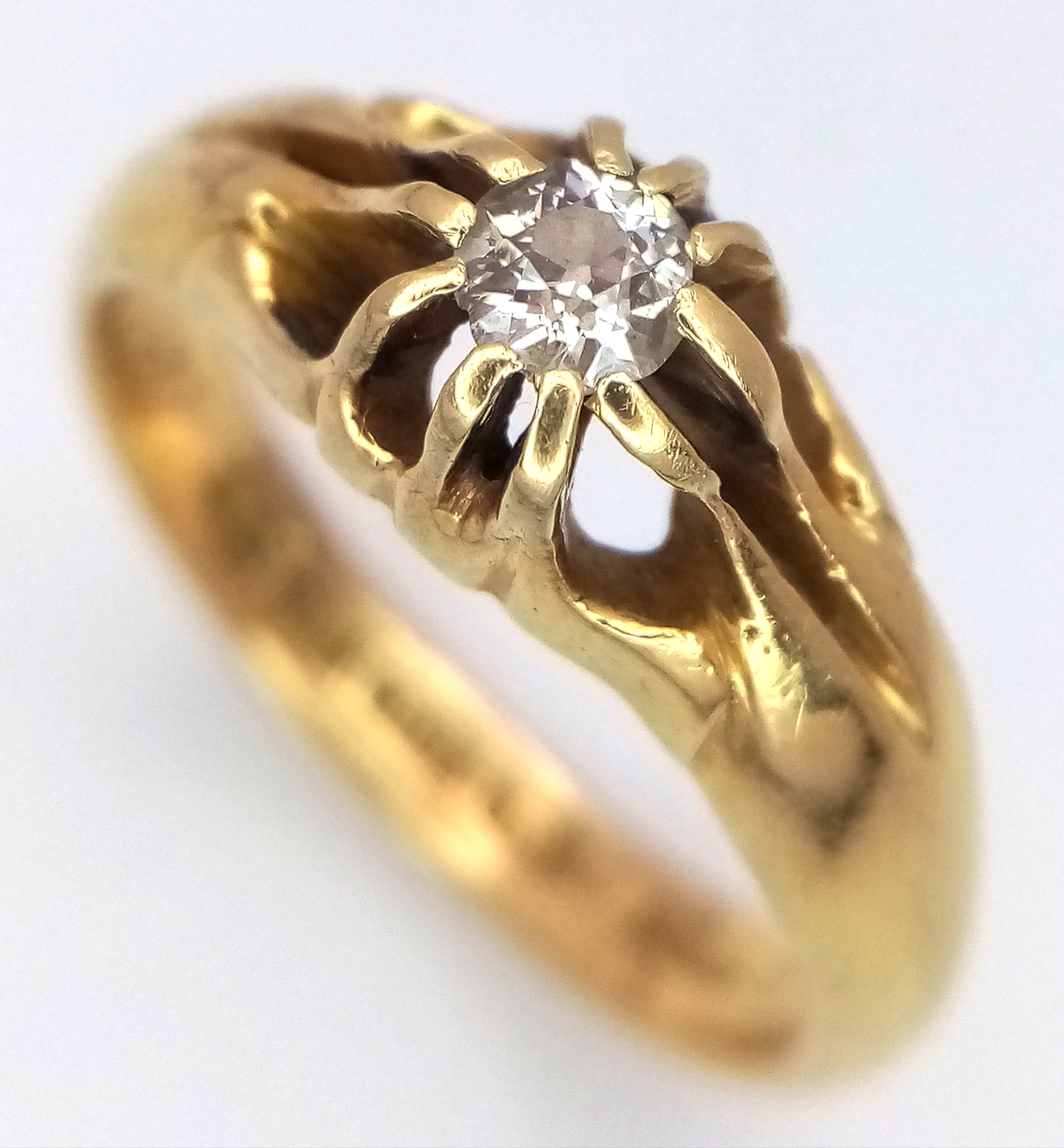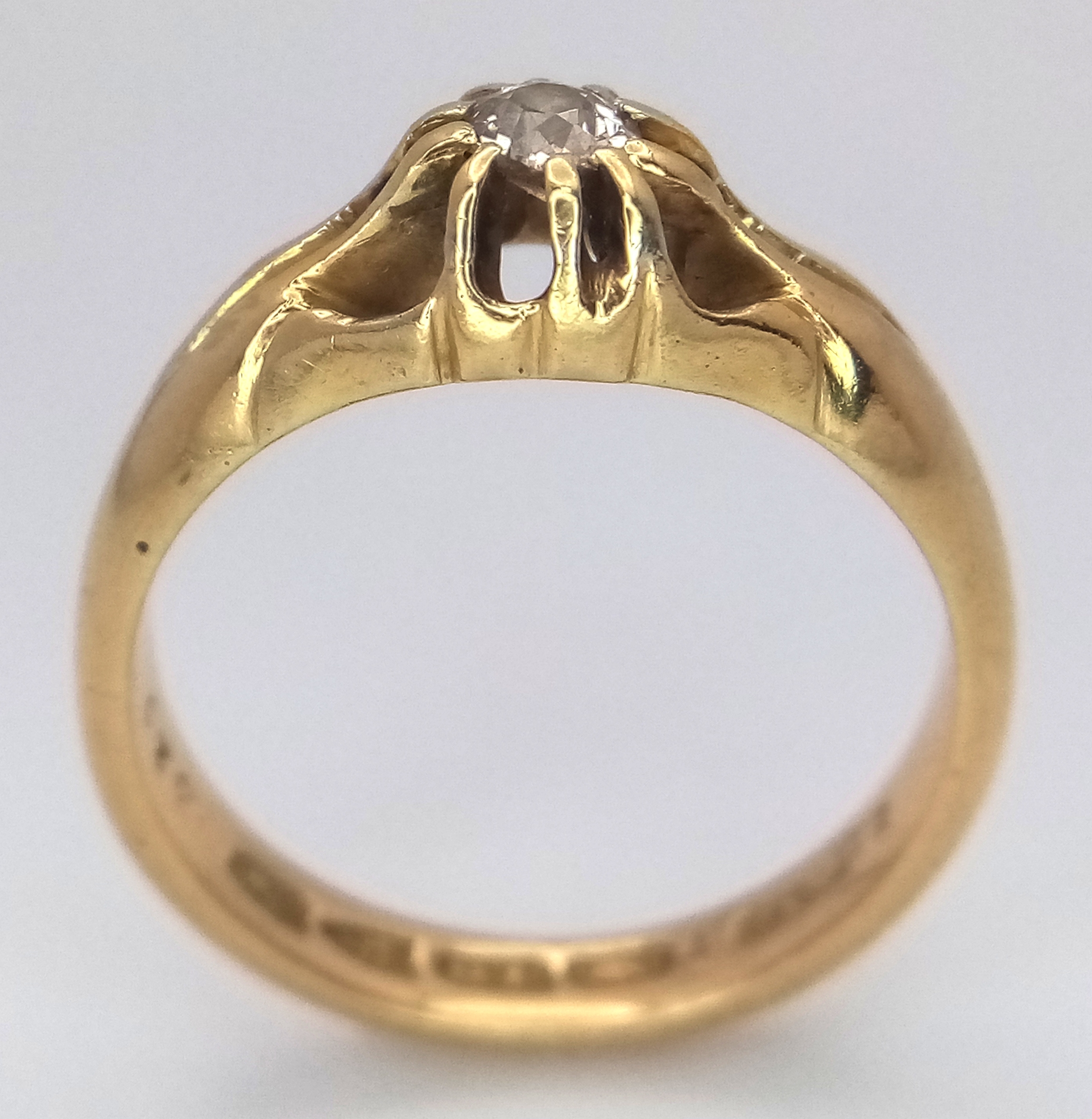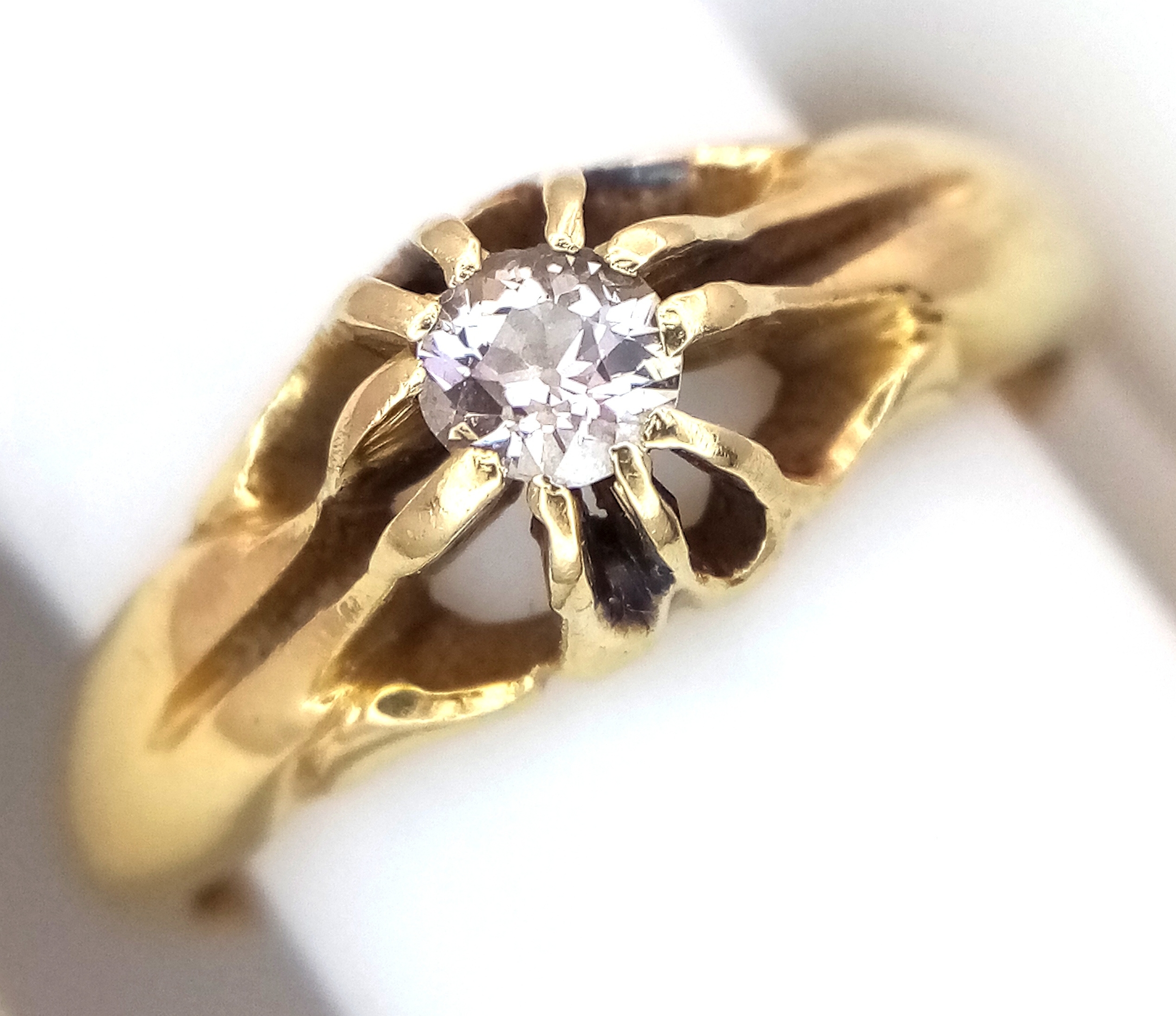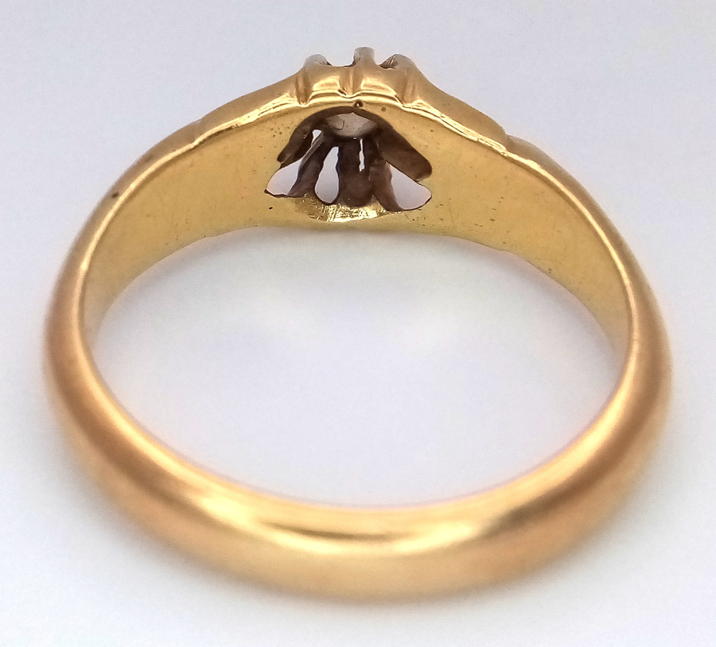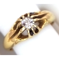 AN 18K YELLOW GOLD, GYPSY SET, OLD CUT DIAMOND, SINGLE STONE RING. 0.15 CTW. 6G, SIZE Q. SC 8044