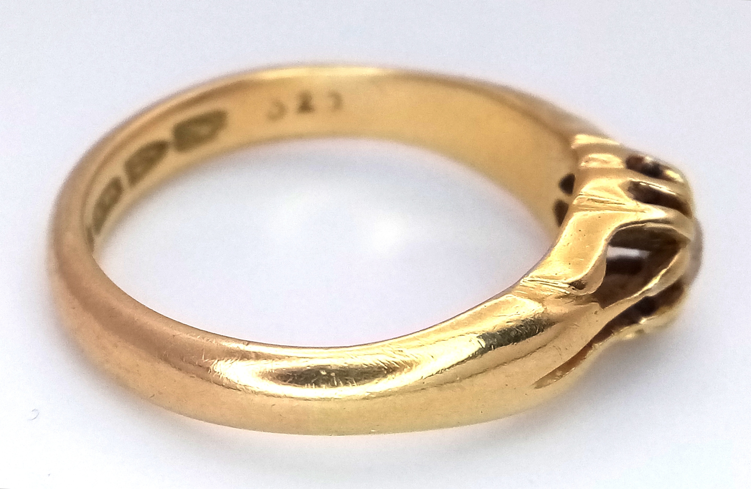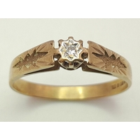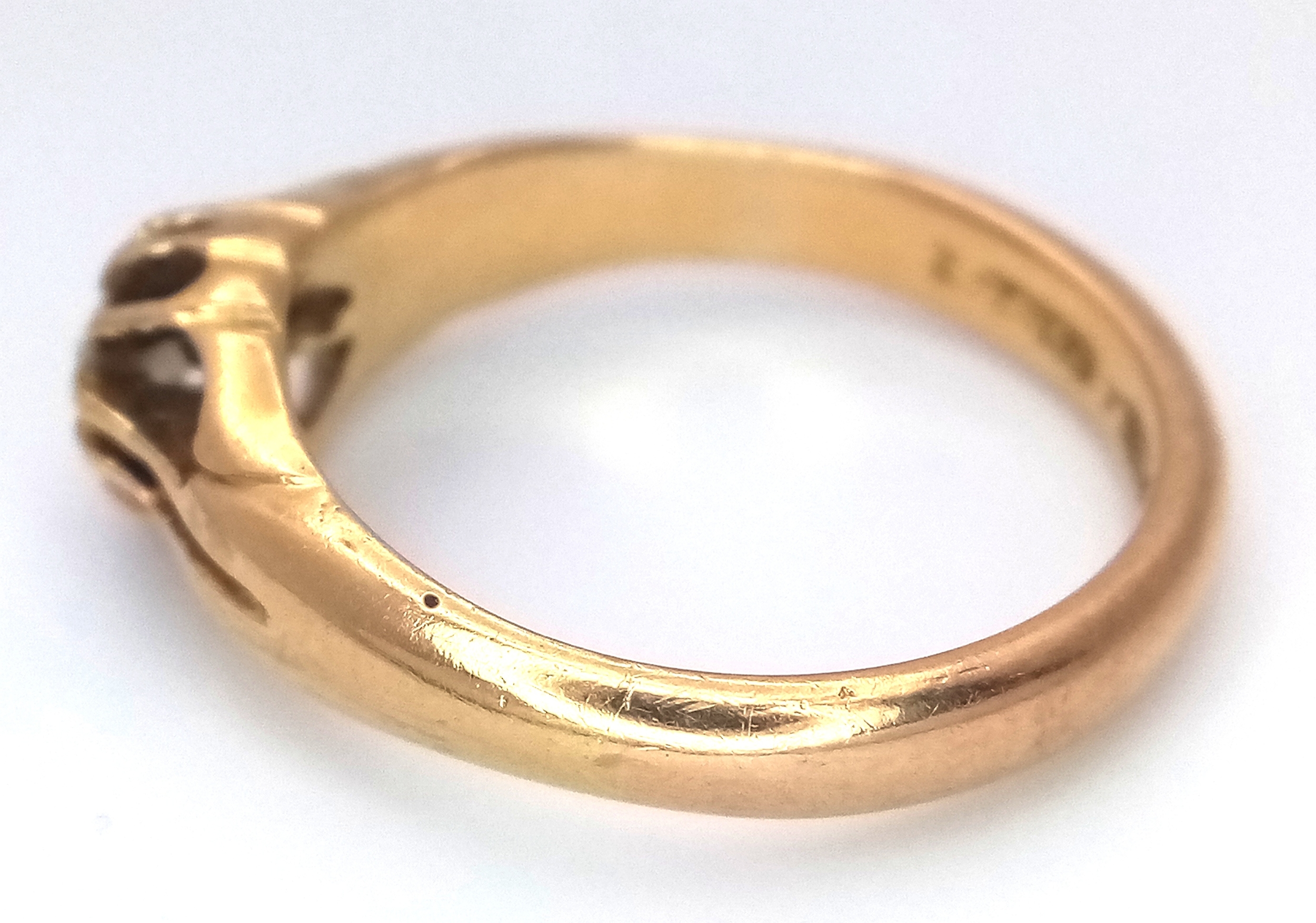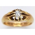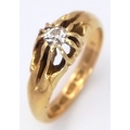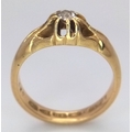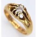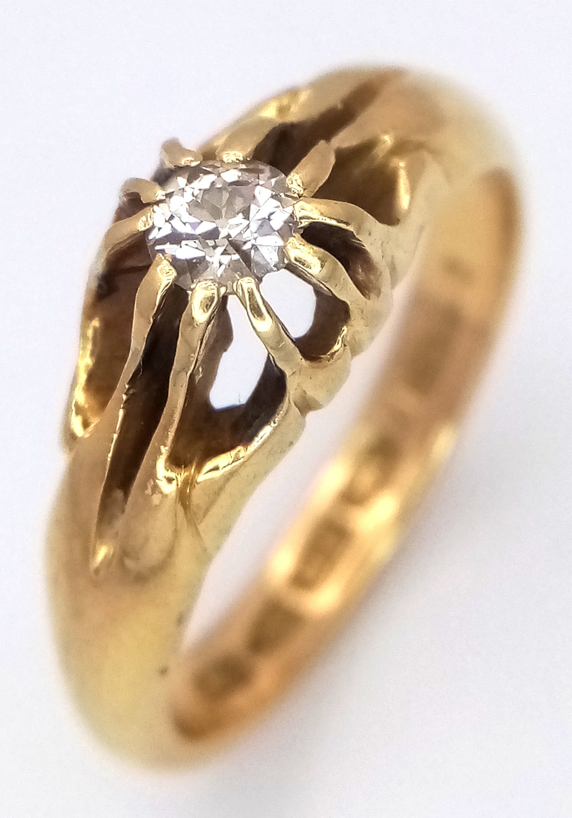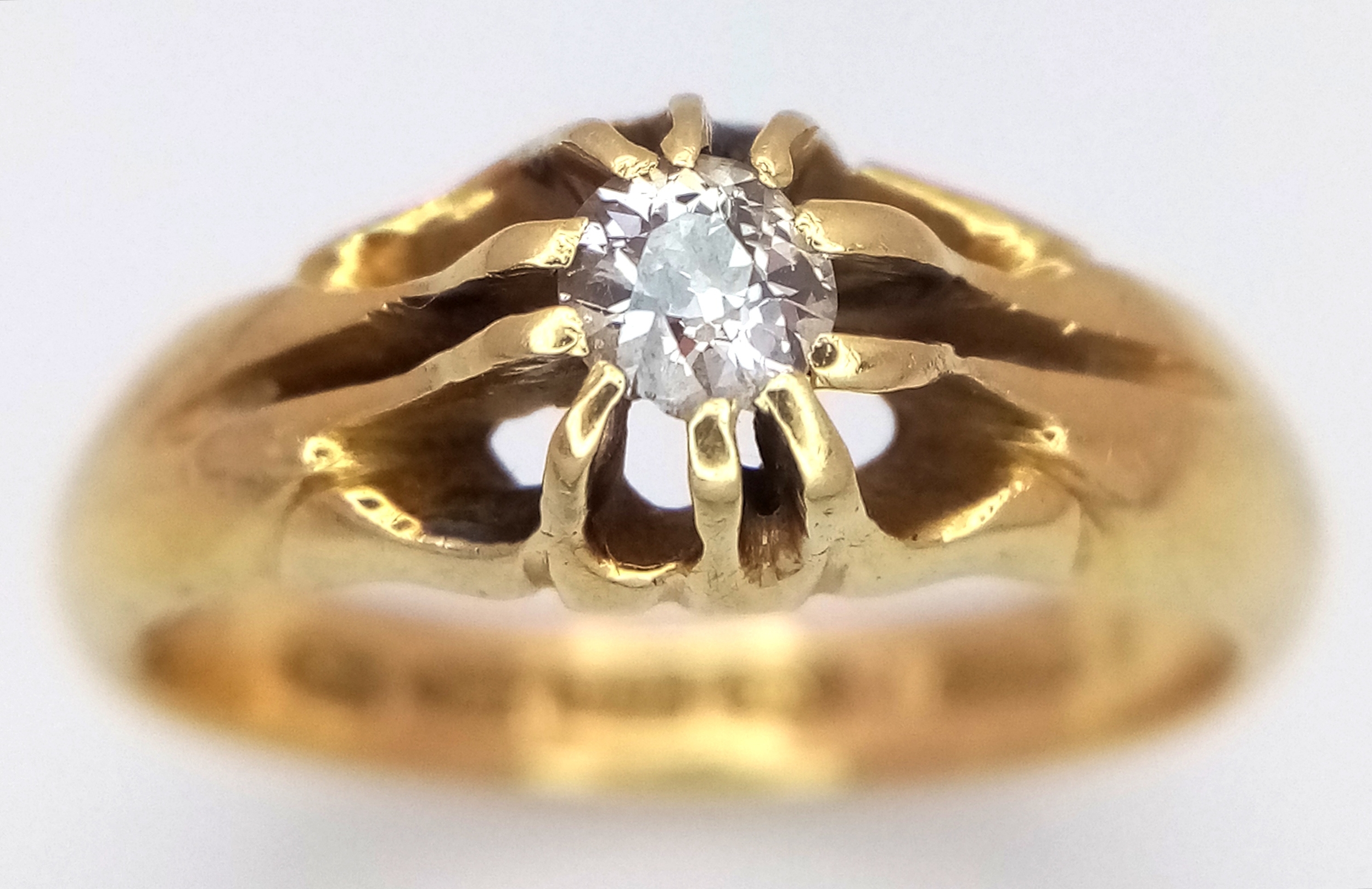 AN 18K YELLOW GOLD, GYPSY SET, OLD CUT DIAMOND, SINGLE STONE RING. 0.15 CTW. 6G, SIZE Q. SC 8044