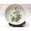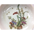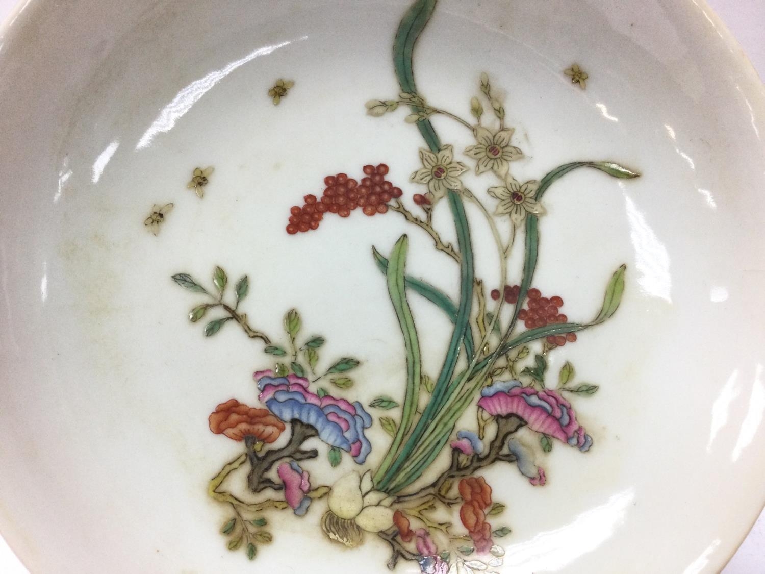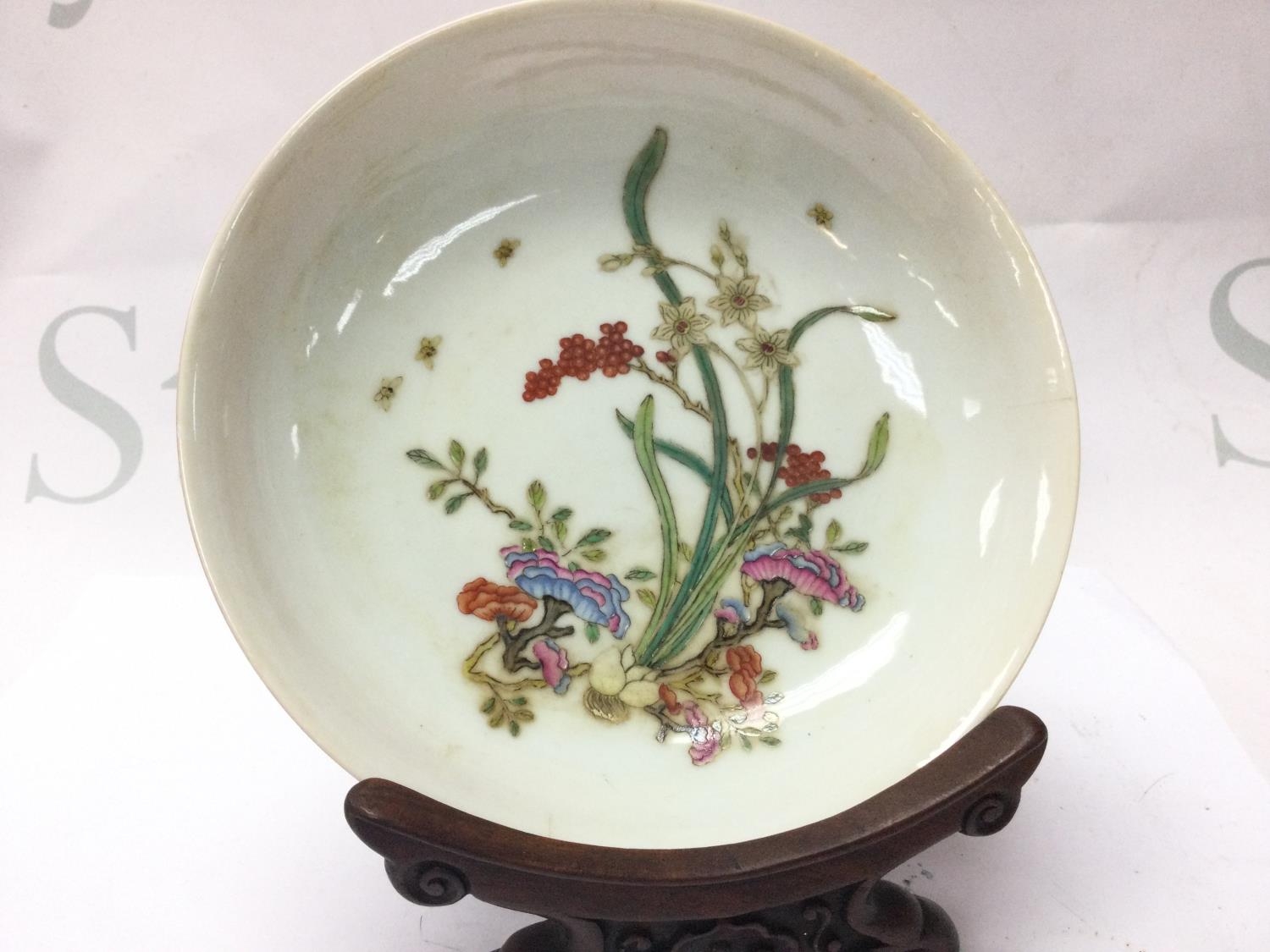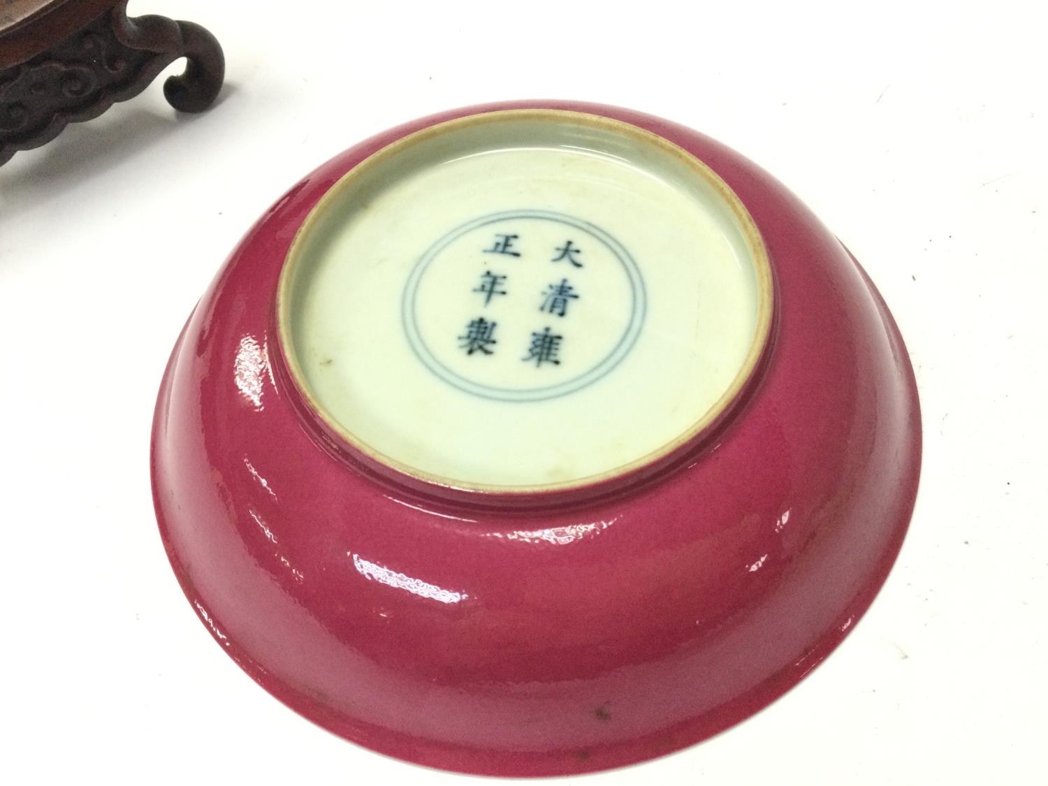A Chinese dish with floral design, copped red glaze on underside and a six character Yongzheng mark at the base. Small hairline cracks. This lot cannot be posted