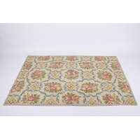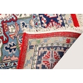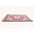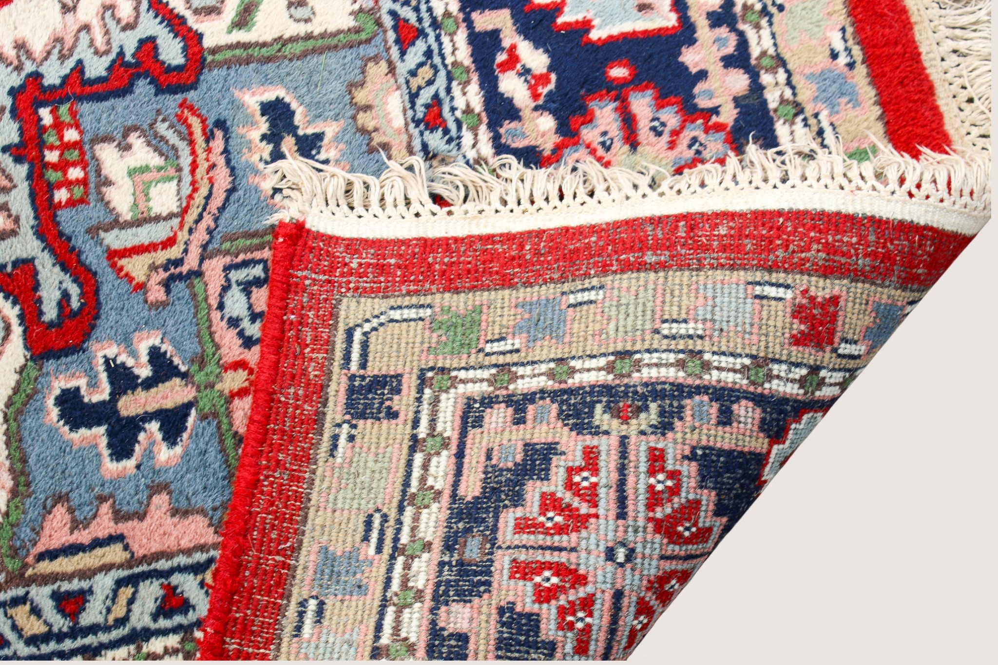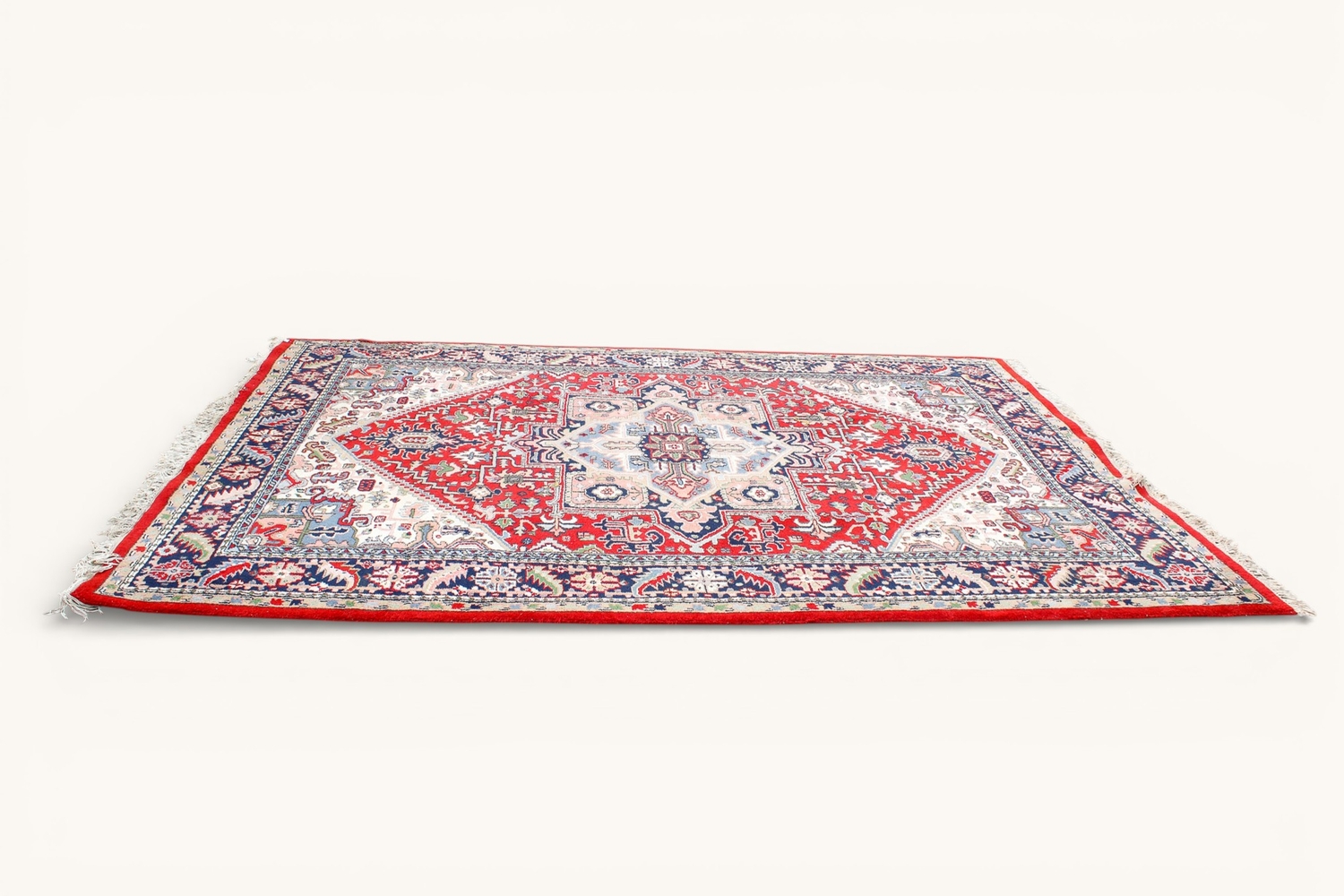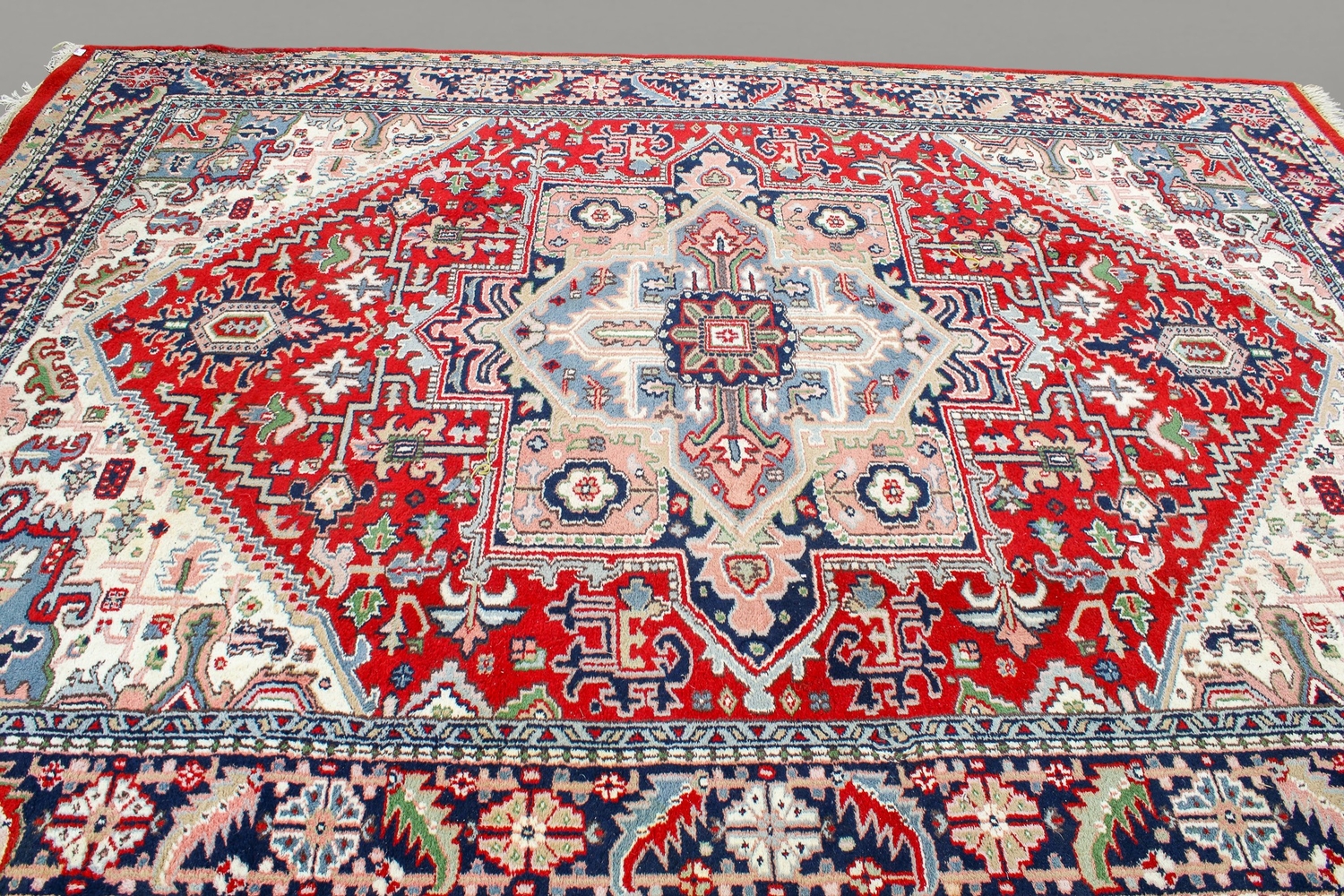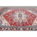 A 20th century large Persian rug. The central panel featuring a cream and blue medallion on a red ground decorated with foliage and motifs, surrounded by blue, cream and pink floral borders, cream tassels to either end, 350cm x 255cm.
