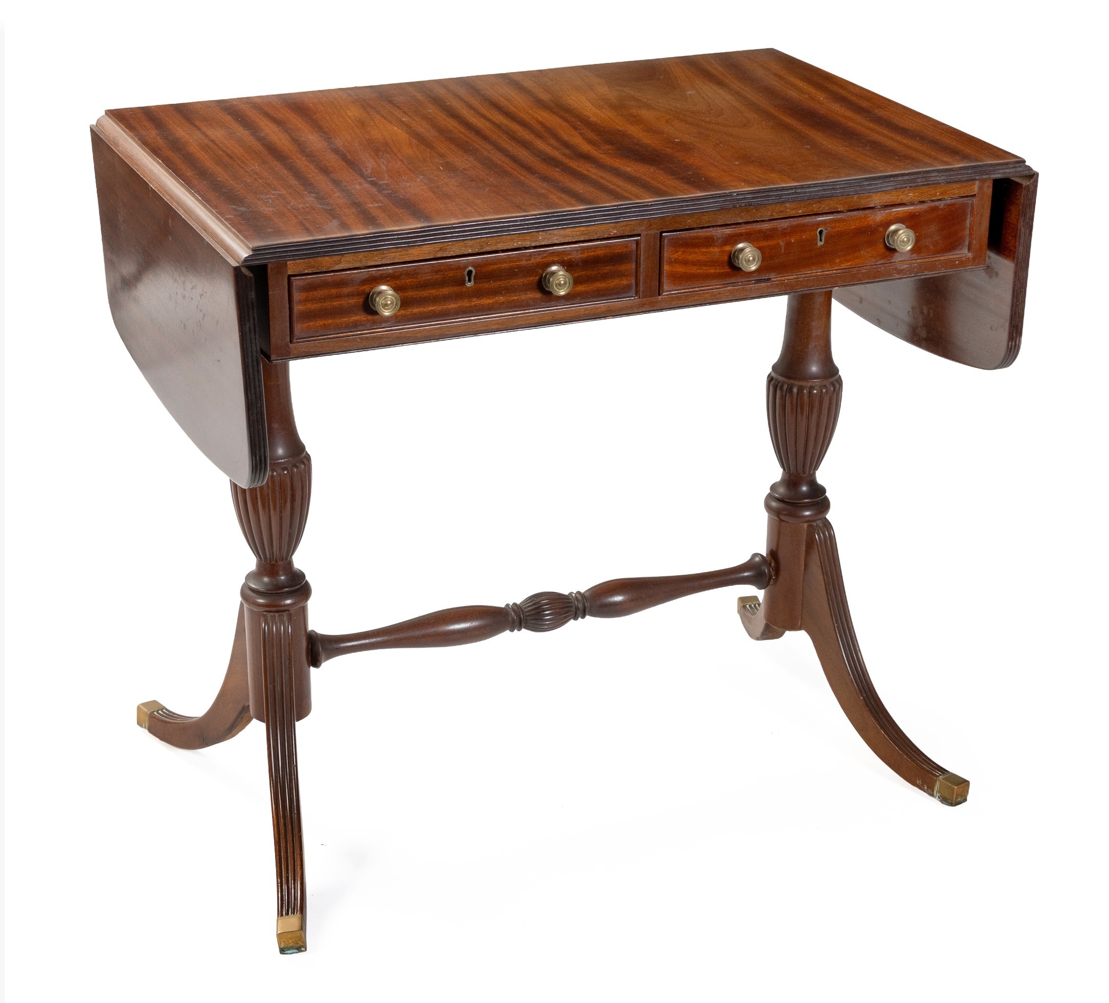 The hinged rounded rectangular top above a pair of frieze drawers , on lobed baluster-shaped supports, on outswept legs terminating in brass caps, joined by a turned stretcher