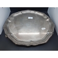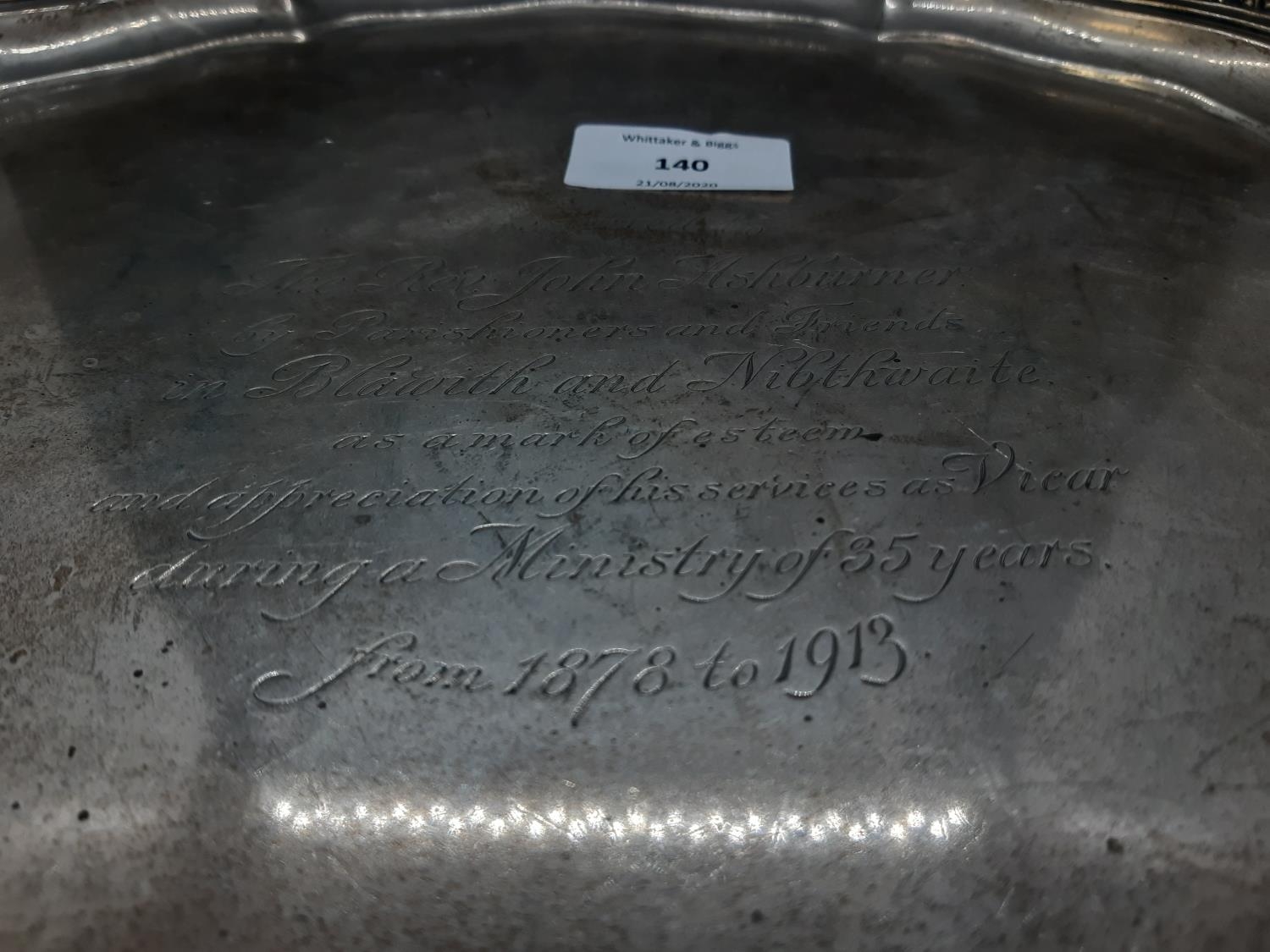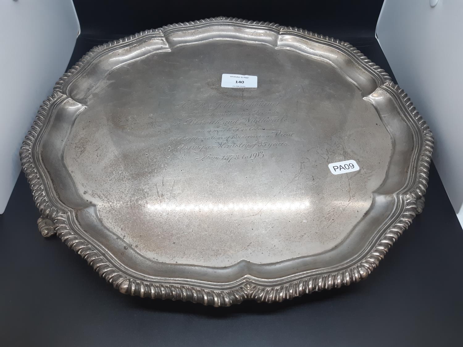 A large hallmarked Sheffield silver Presentation salver on tri footed base, presented to “the Rev. John Ashburner by parishioners and friends in Blawith and Nibthwaite as a mark of esteem and appreciation of his services as Vicar during a ministry of 35 years from 1878 to 1913”, dated 1937 and measuring approx. 36cm in diameter - total approx. weight 1225 grams