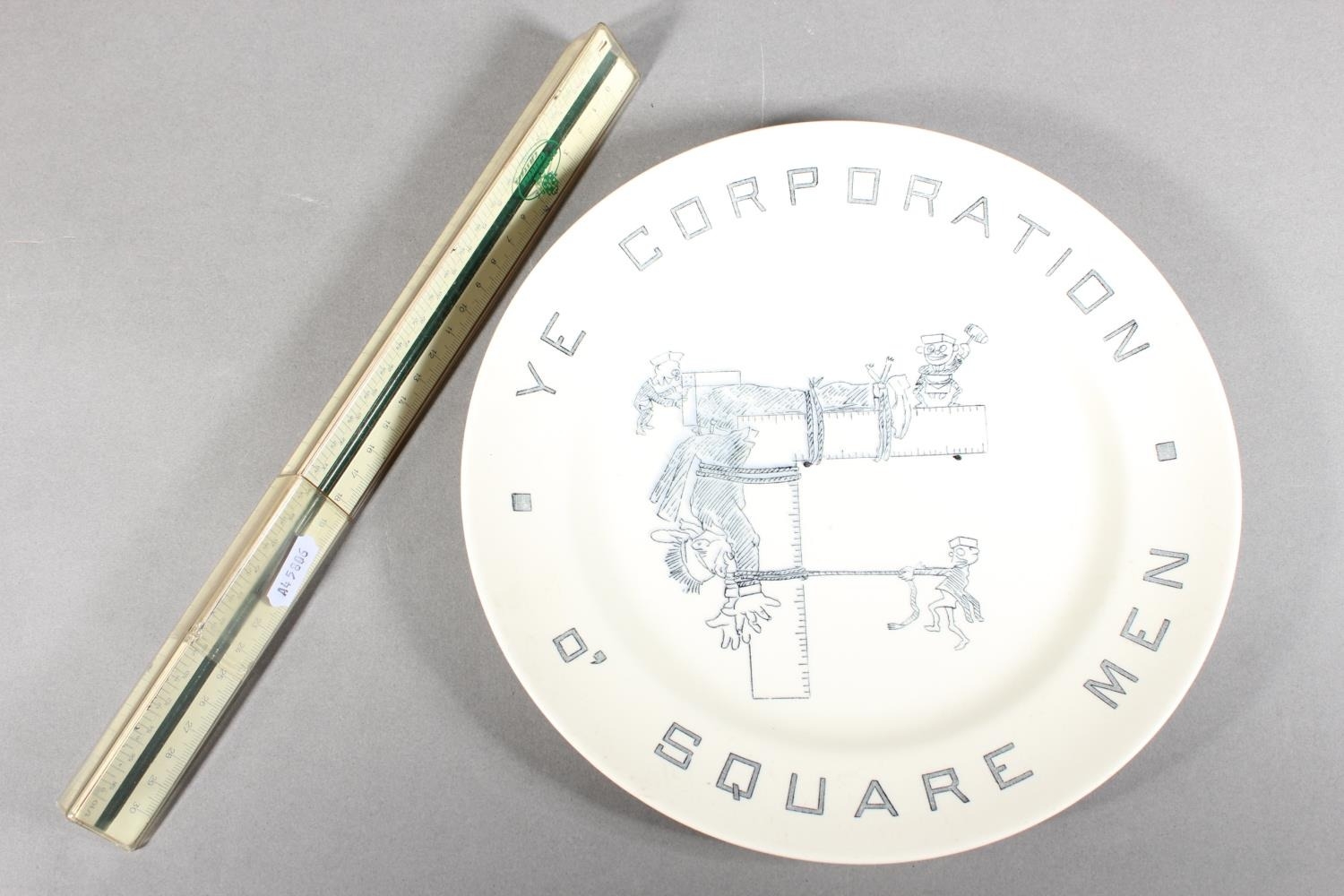 Ceramic plate inscribed Ye Corporation O Square Men and a rule.