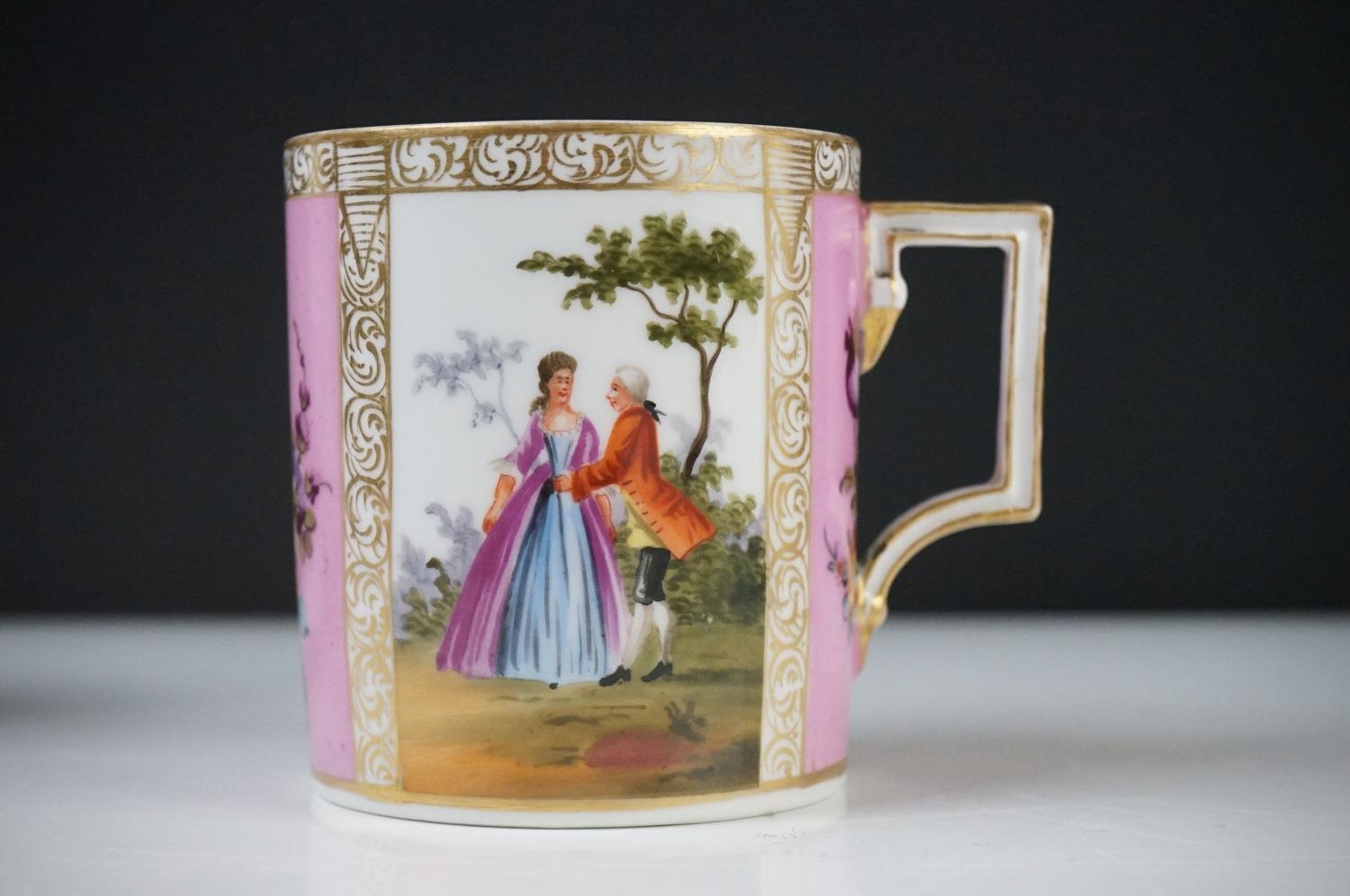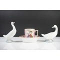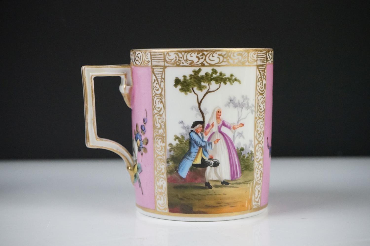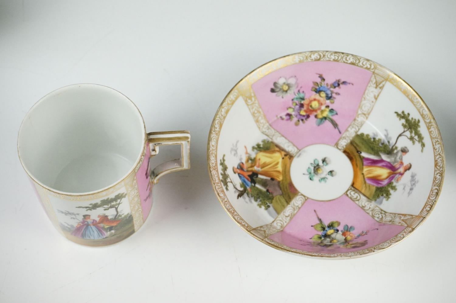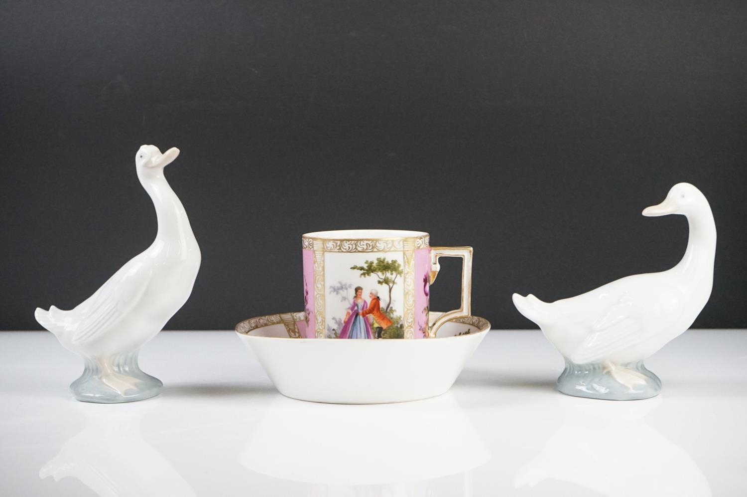 Continental Porcelain ' Augustus Rex ' Large Coffee Can and Saucer decorated with panels of courting couples and panels of flowers on a pink ground, coffee can 9cm high together with two Nao Geese