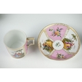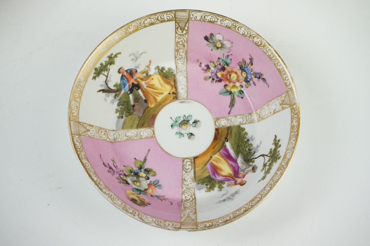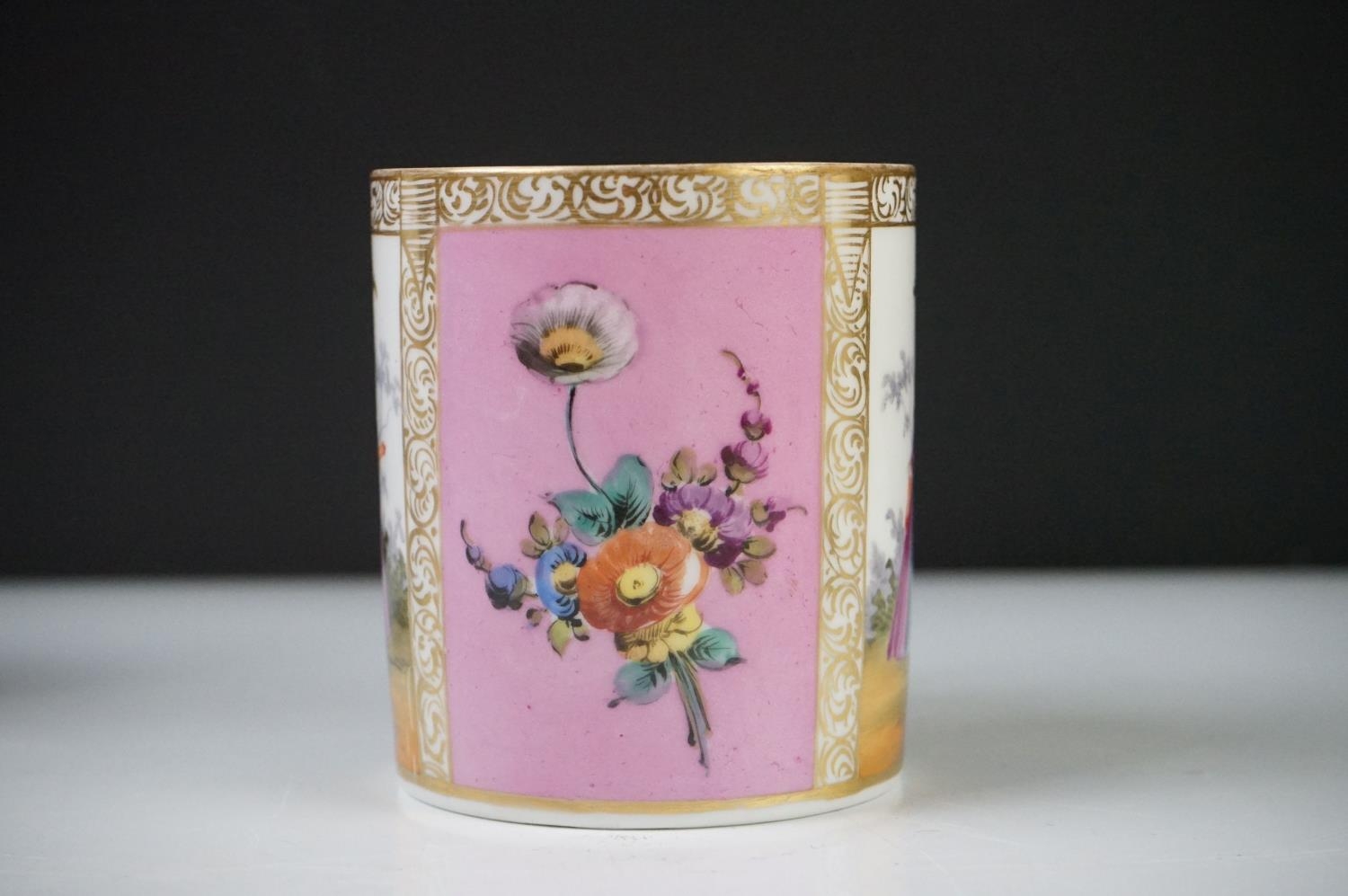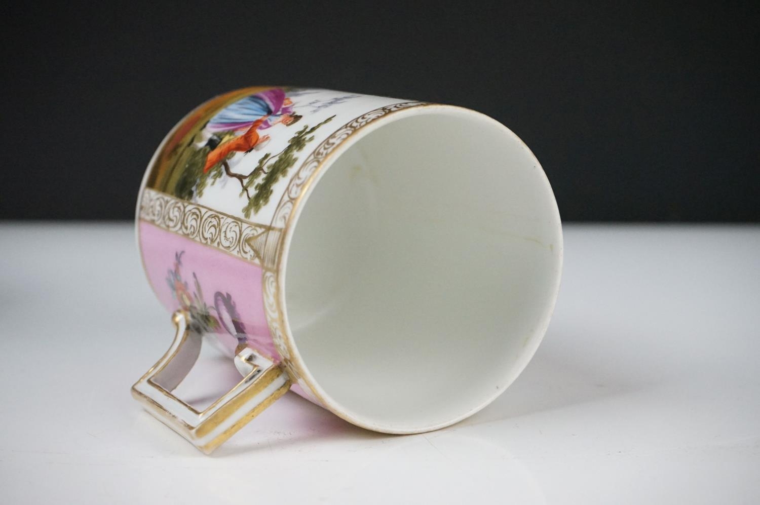 Continental Porcelain ' Augustus Rex ' Large Coffee Can and Saucer decorated with panels of courting couples and panels of flowers on a pink ground, coffee can 9cm high together with two Nao Geese