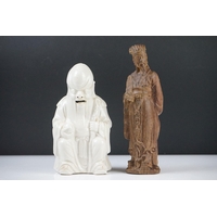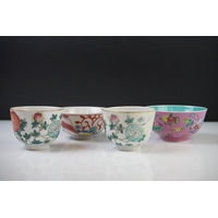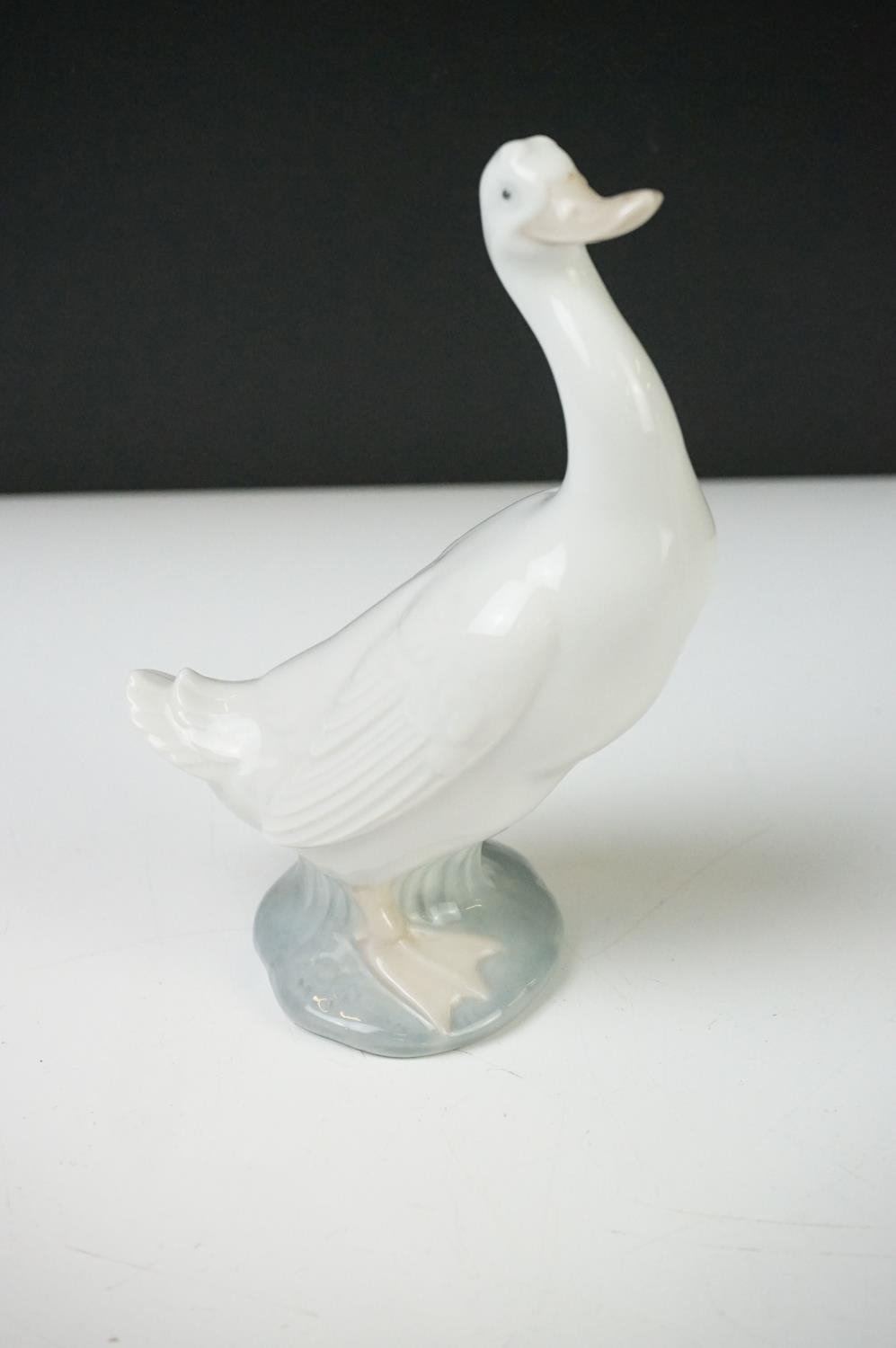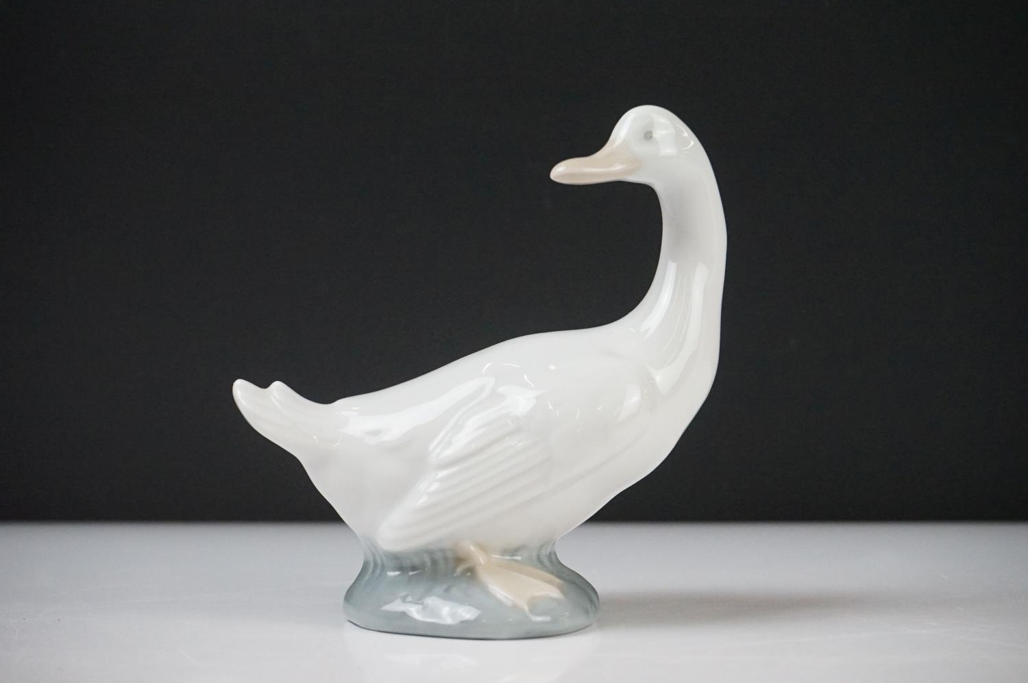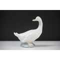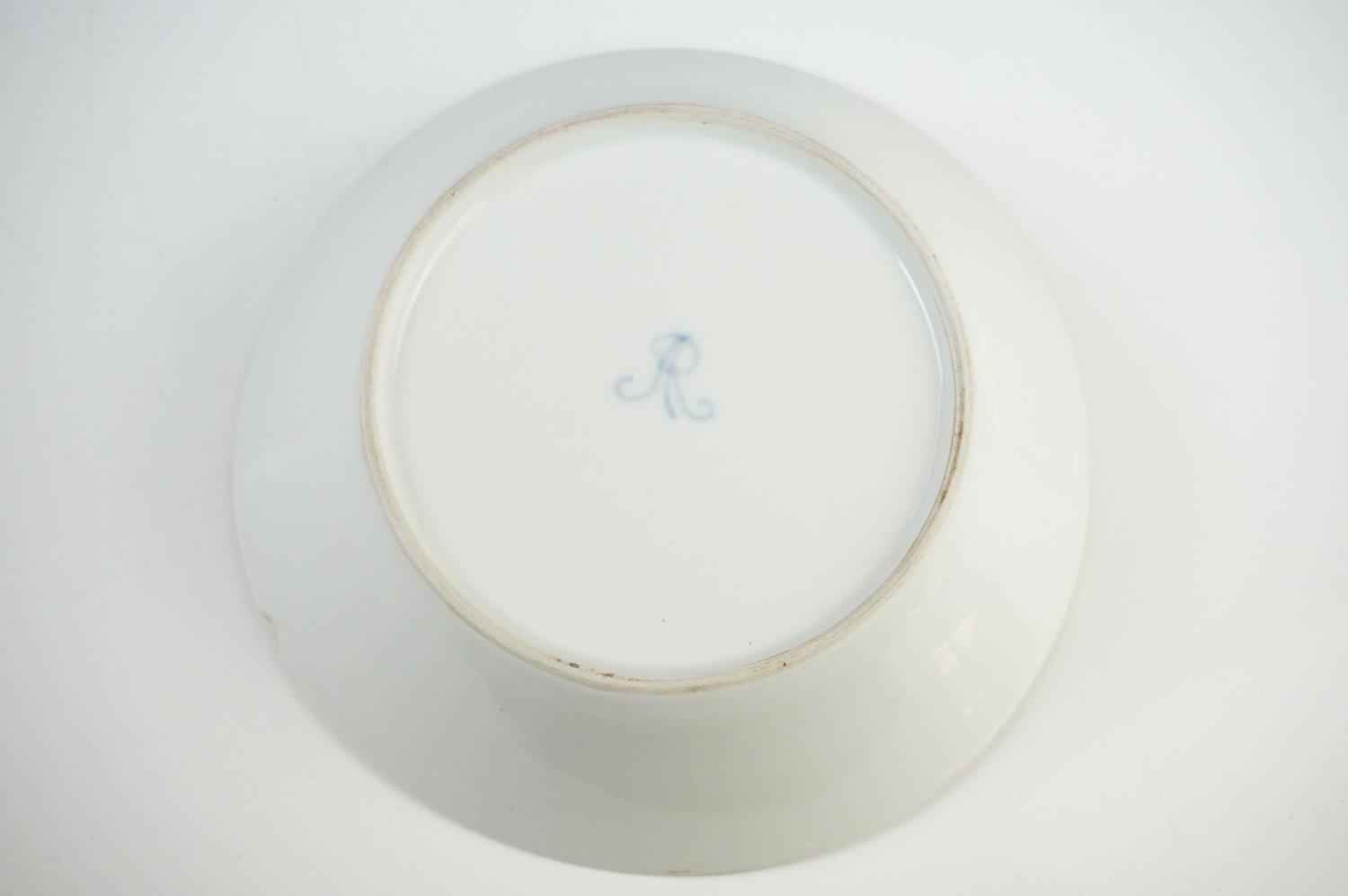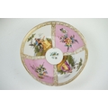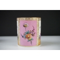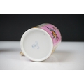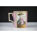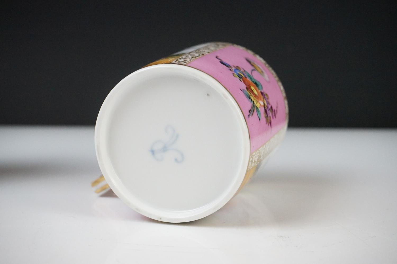 Continental Porcelain ' Augustus Rex ' Large Coffee Can and Saucer decorated with panels of courting couples and panels of flowers on a pink ground, coffee can 9cm high together with two Nao Geese