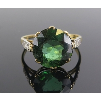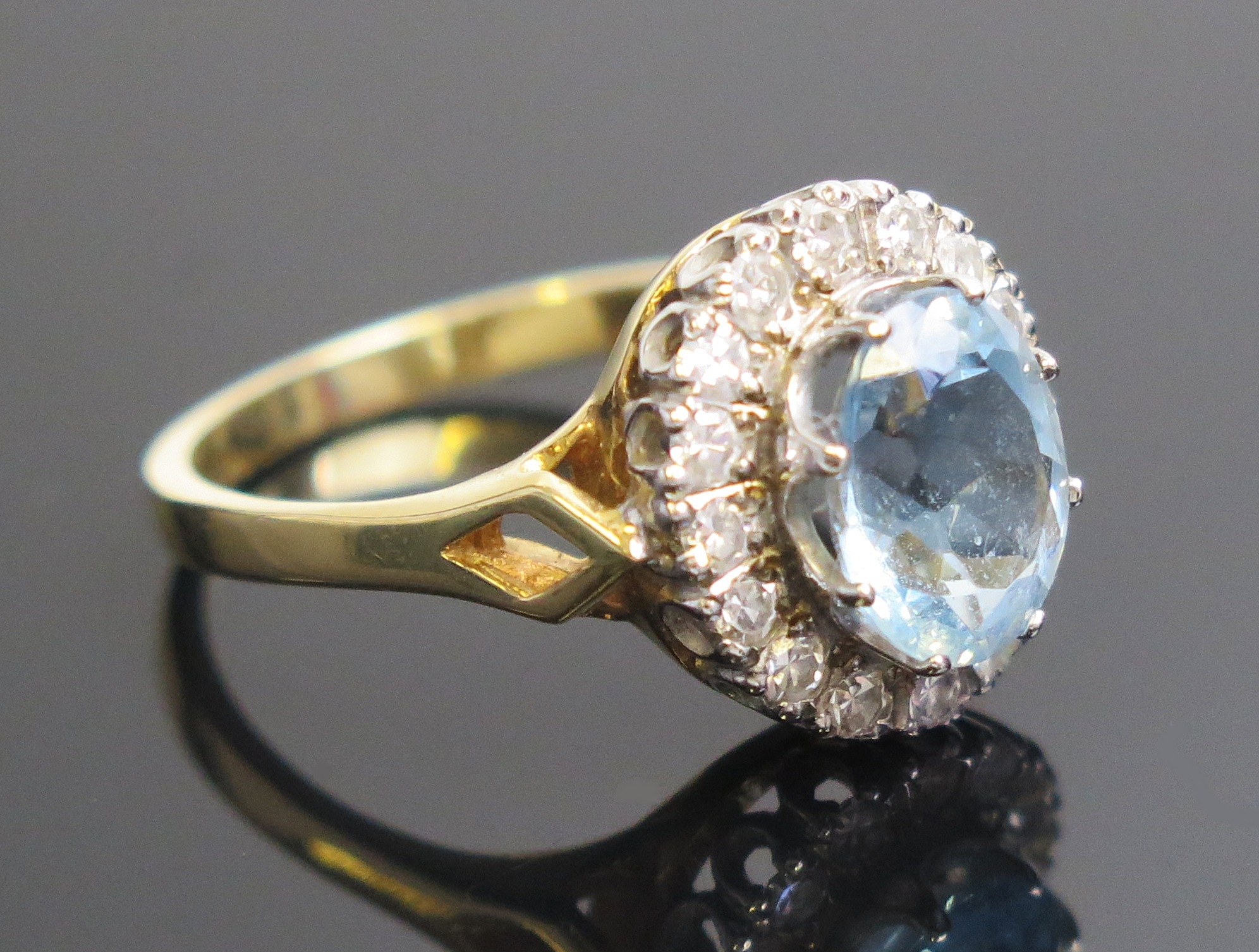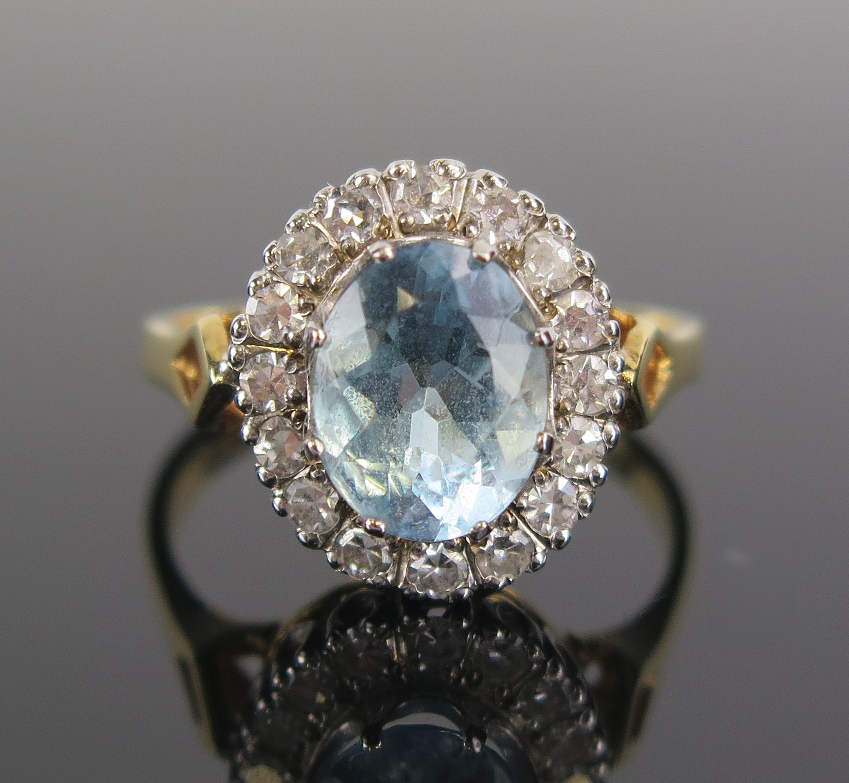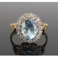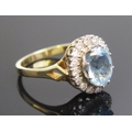 Aqua Marine and diamond cluster ring in an 18ct yellow gold setting, c. 10x8mm principal stone and 15x13.5mm head, size S, hallmarked, 6.5g. Made by Shipton & Co. and in original box