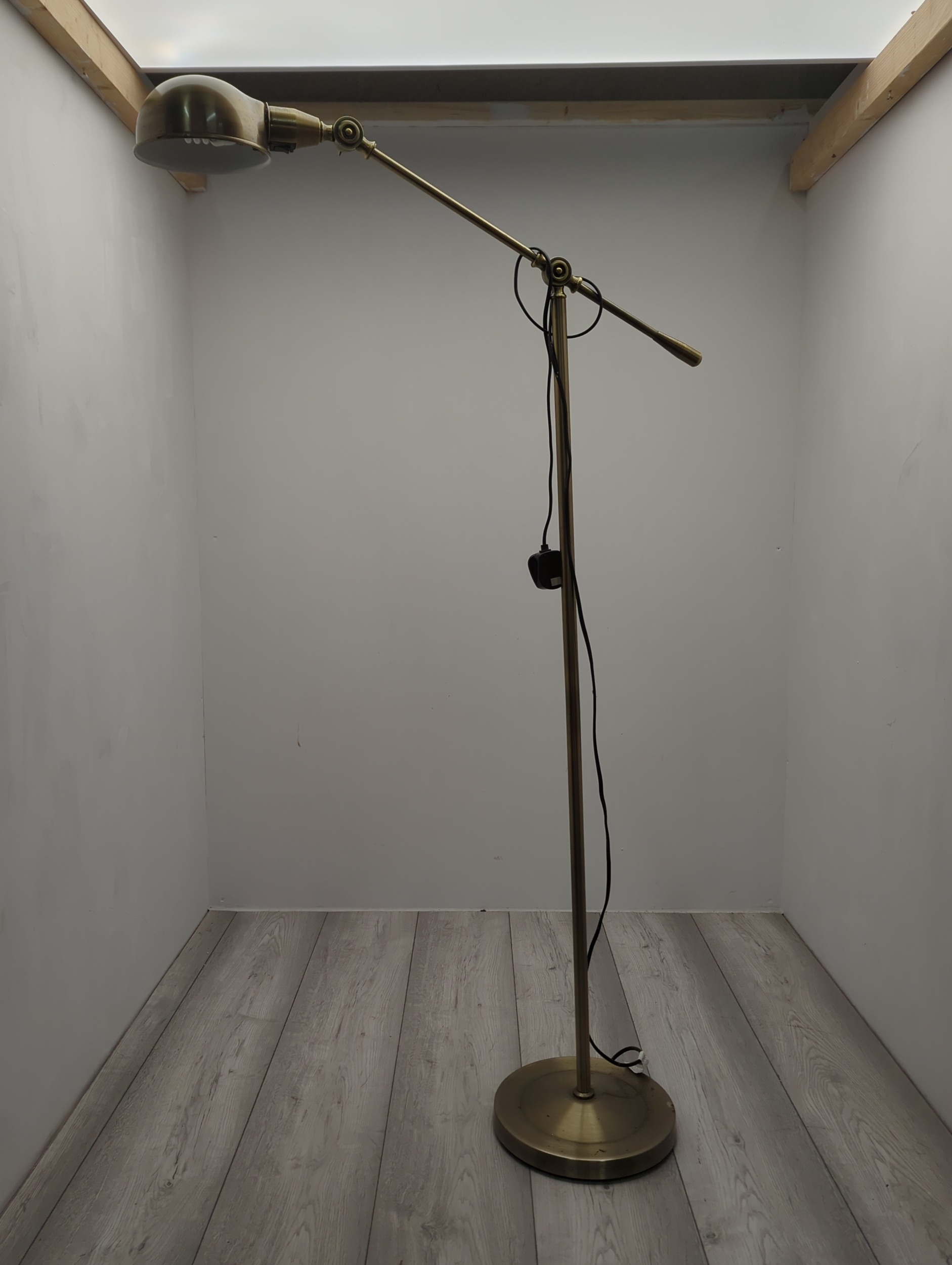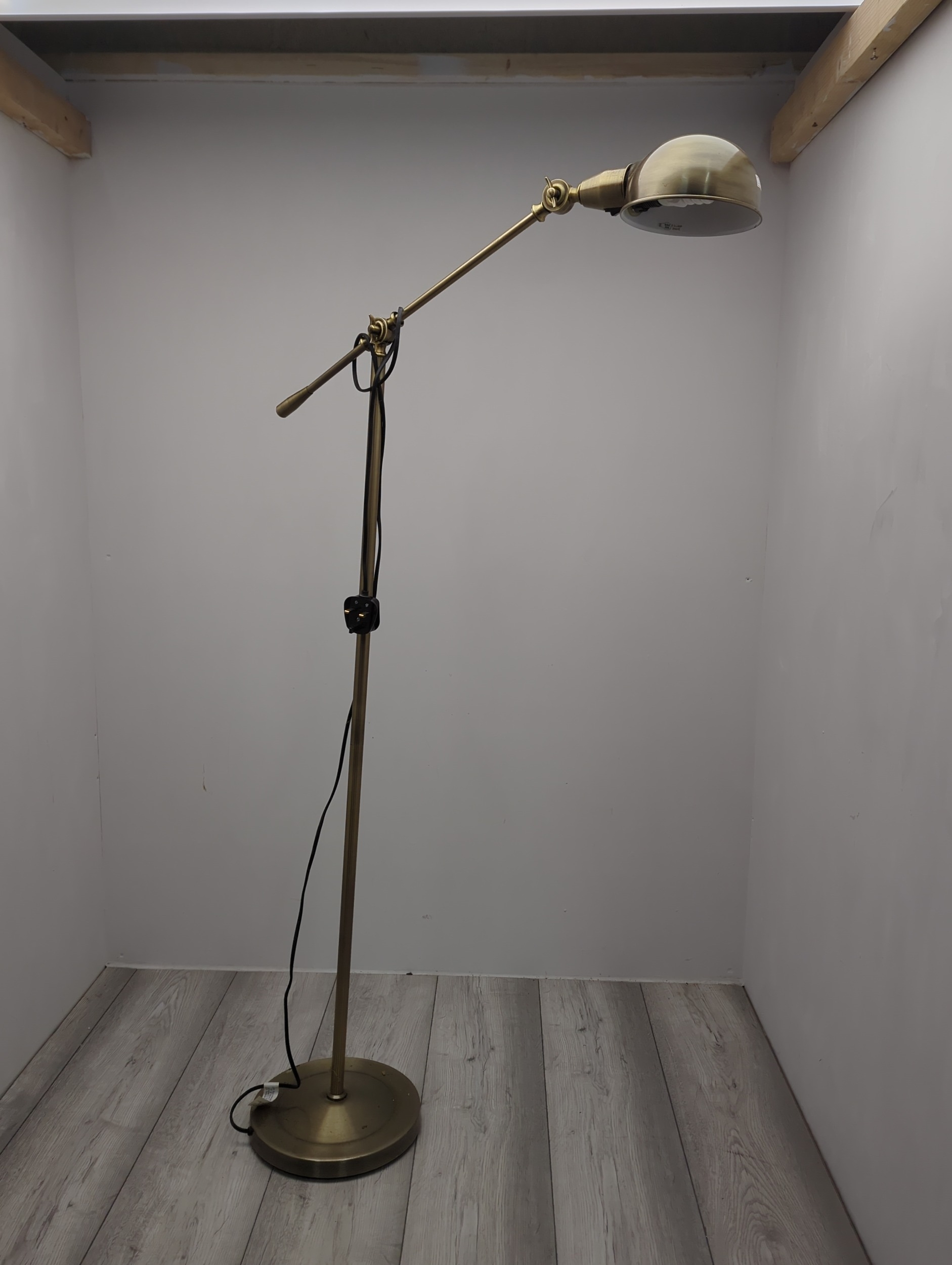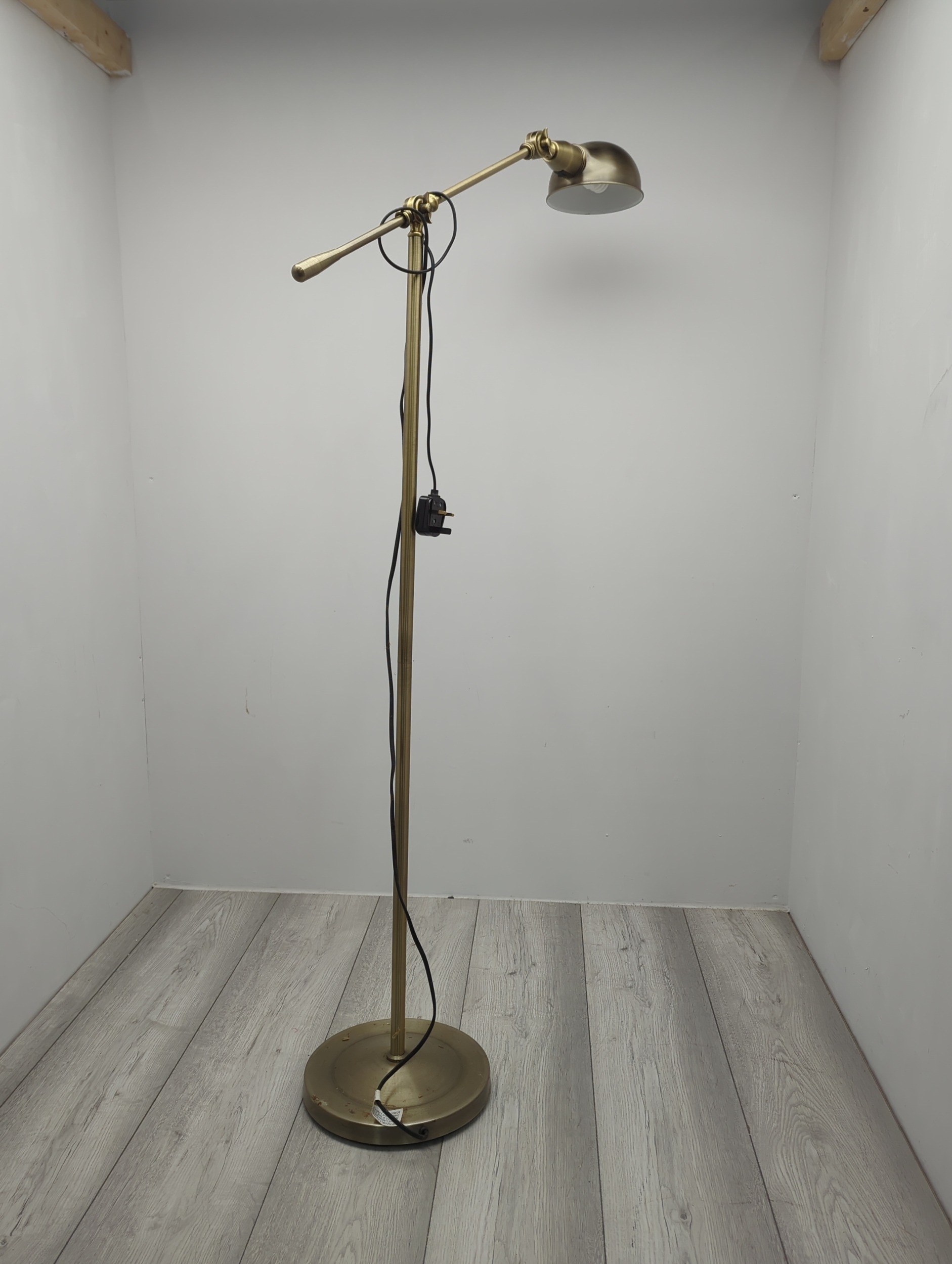This brass adjustable floor lamp features a sleek design with a round base and a single arm supporting a metal shade. It is equipped with a plug and cable for easy connection to a power source. Ideal for providing focused lighting in study or reading areas, the lamp's articulated arm allows for precise positioning of light.