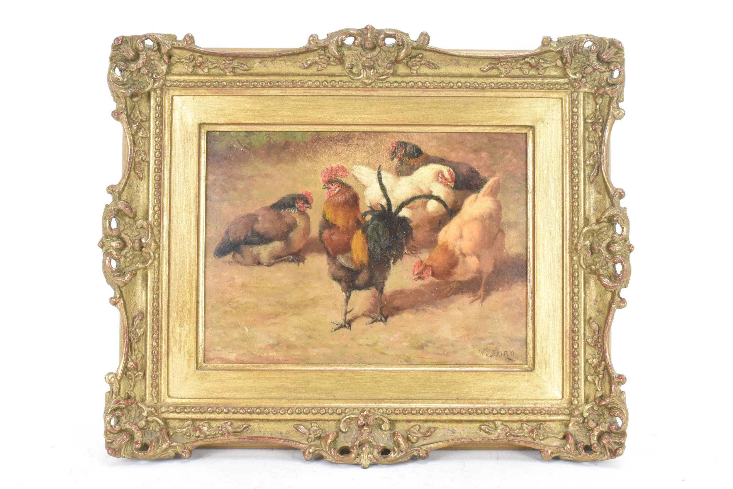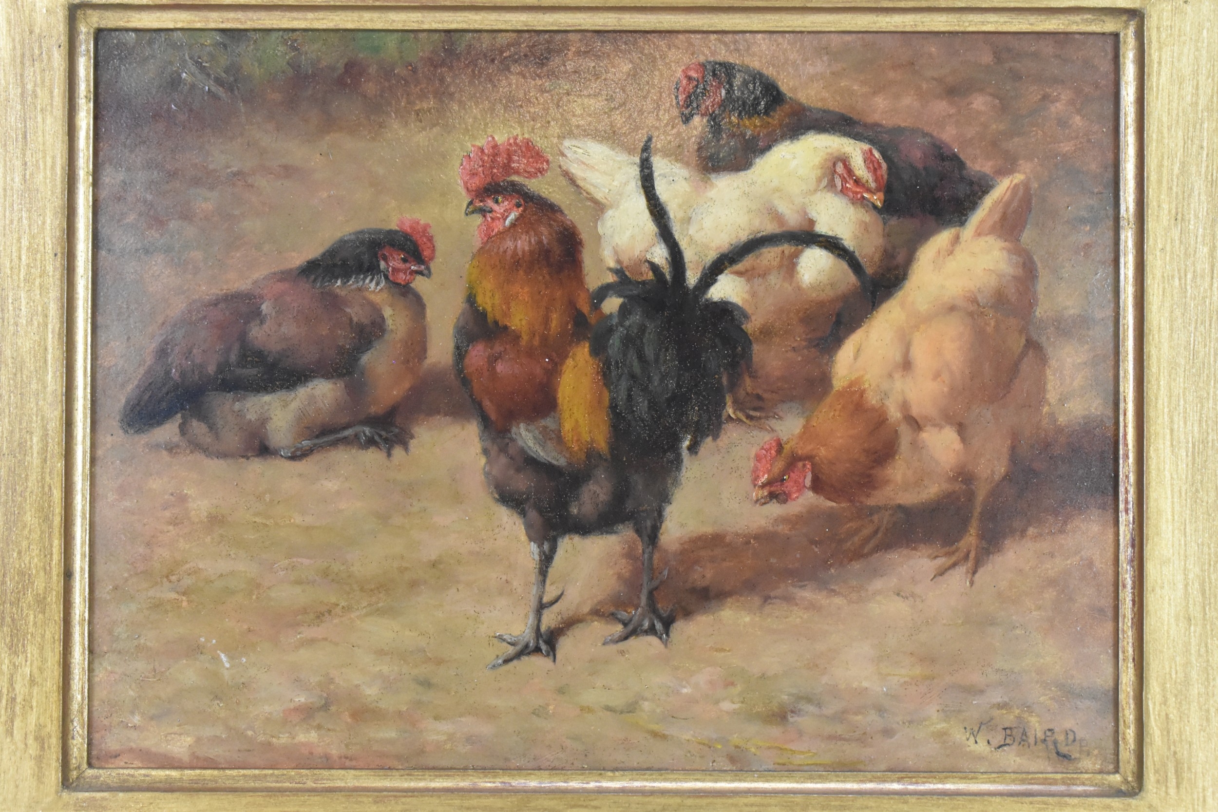 William Baptiste Baird (American 1847-1917) An oil on board depicting chickens, signed to the lower right corner, 21cm x 15cm, the frame 33cm x 27cm
