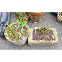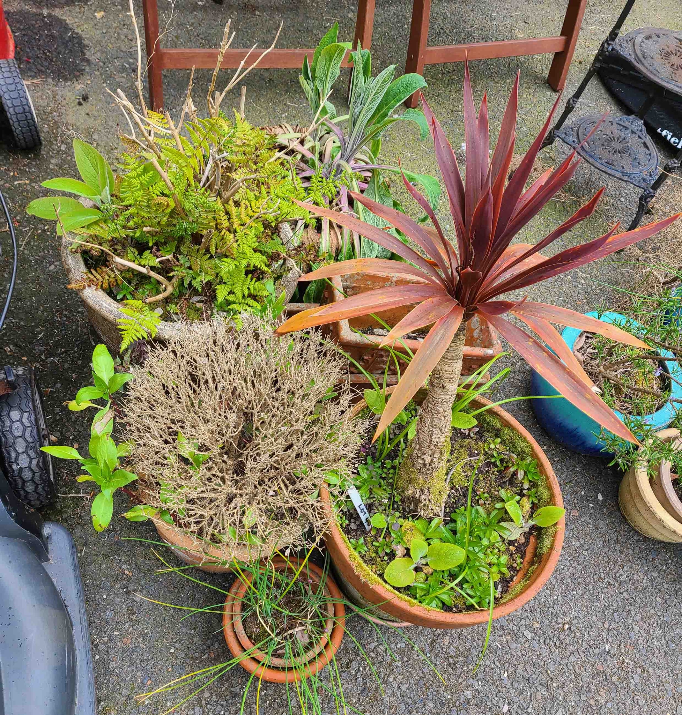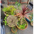 Six assorted garden pots containing various plants including a cabbage palm and chives - sold with two oblong terracotta planters