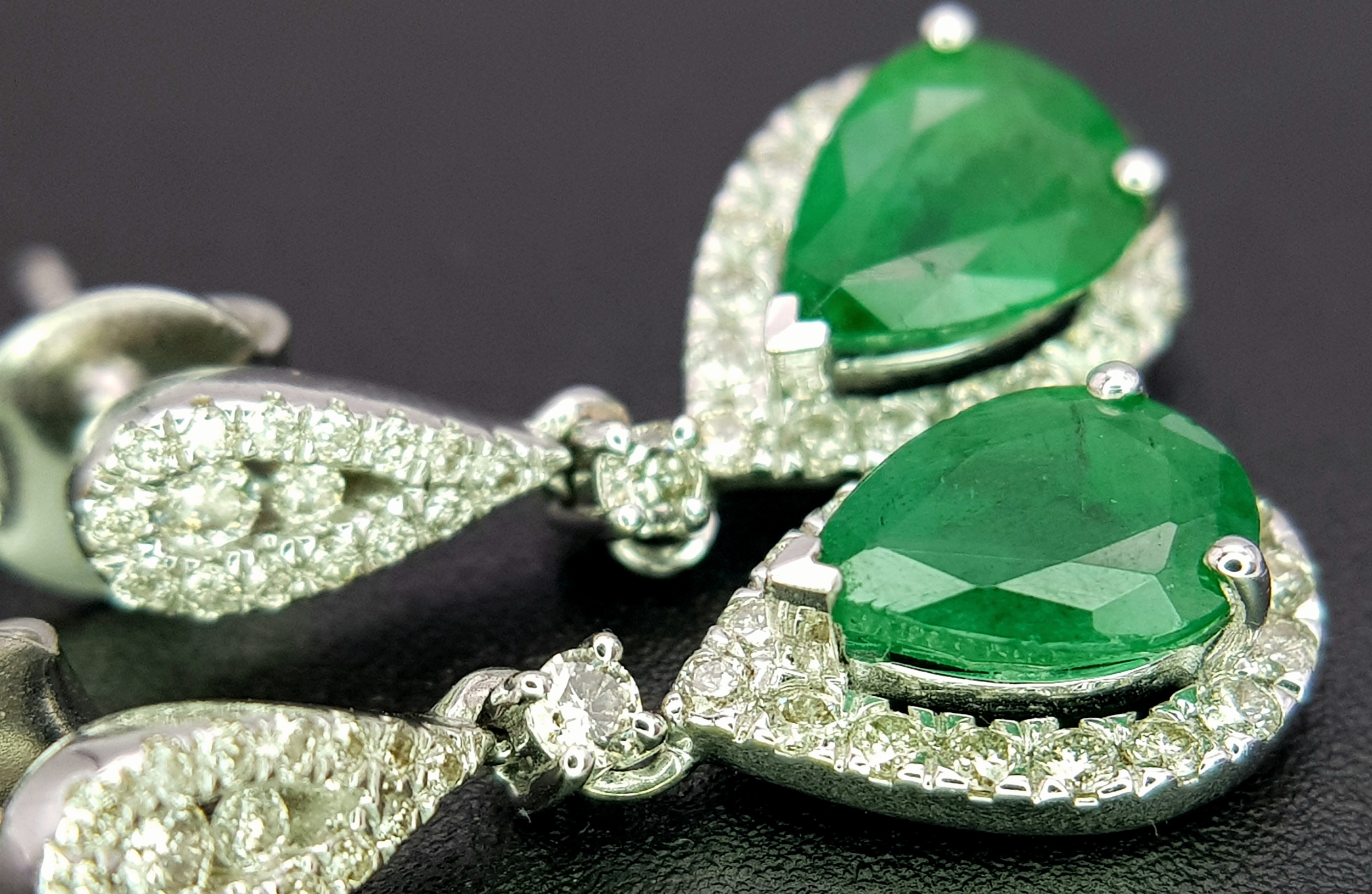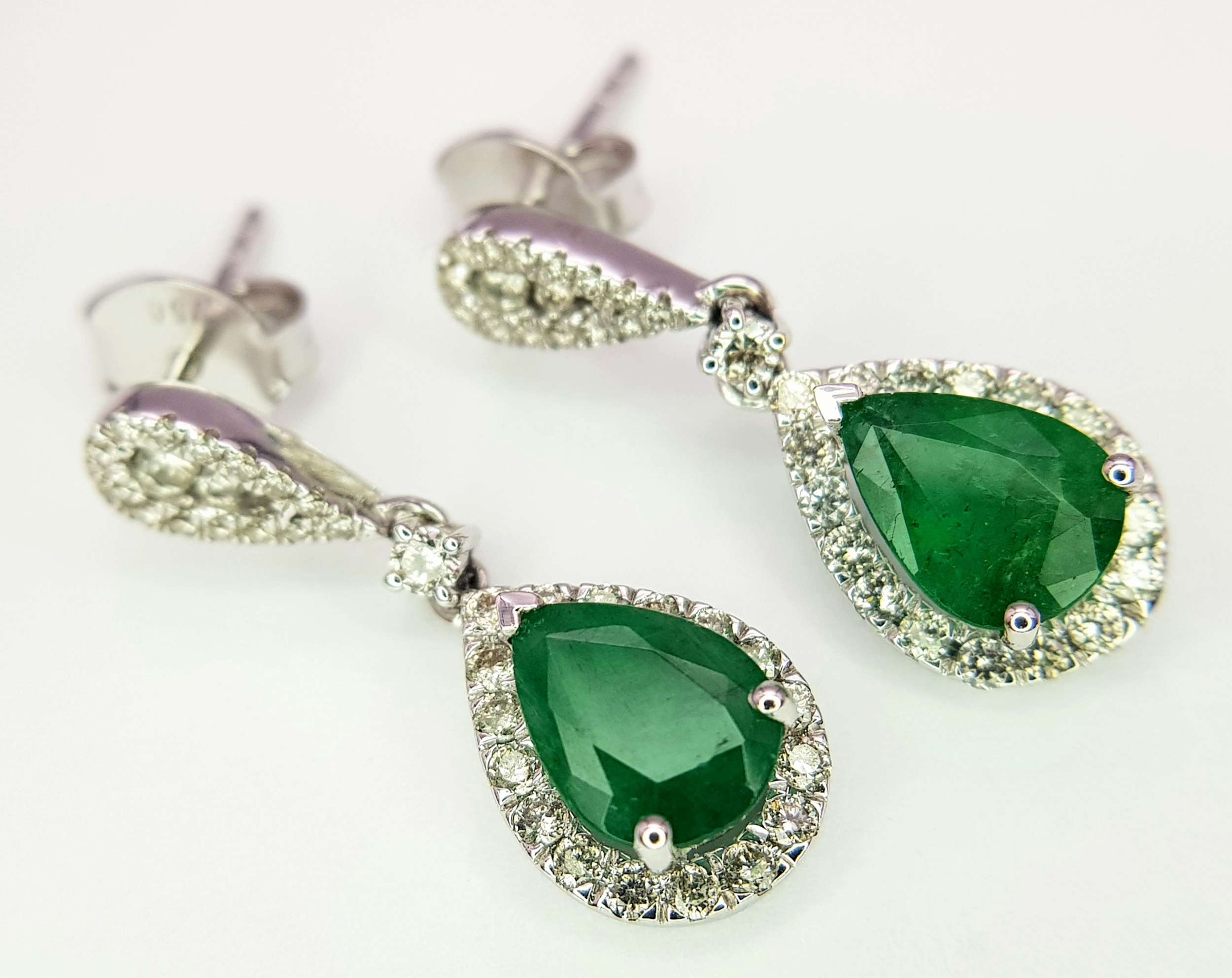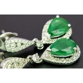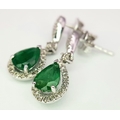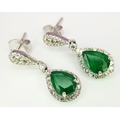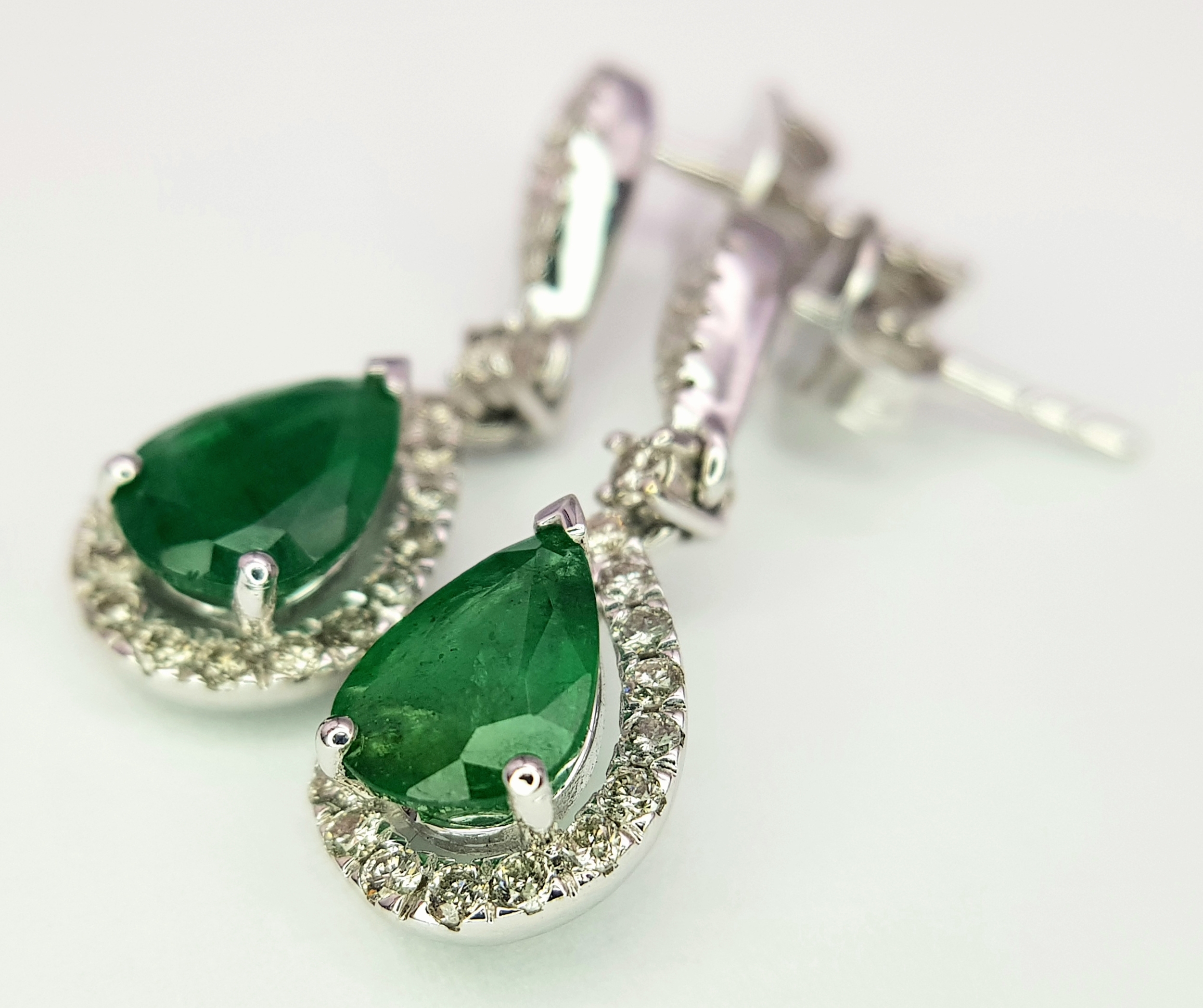 A Pair of 18K White Gold, Colombian Emerald and Diamond Drop Earrings. Each having a 1ct emerald with diamond surround and accents - 1.2ctw. 22mm drop. 4.2g. r-210803.