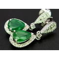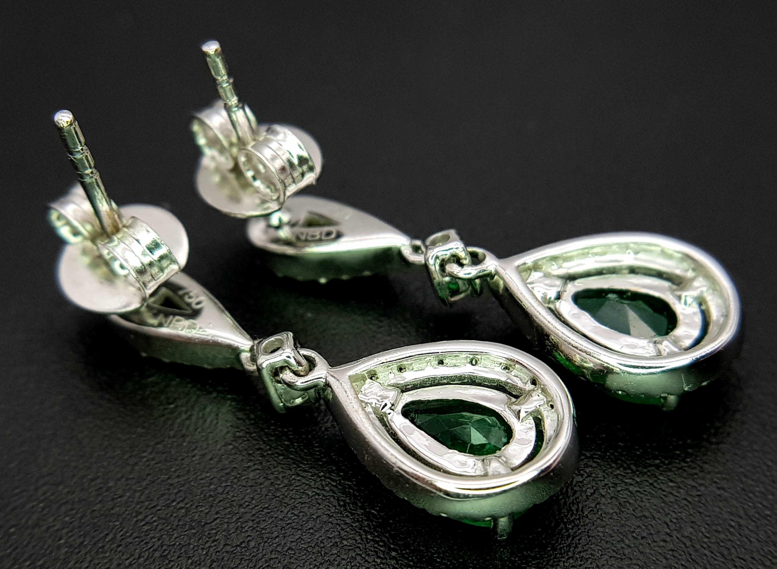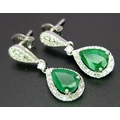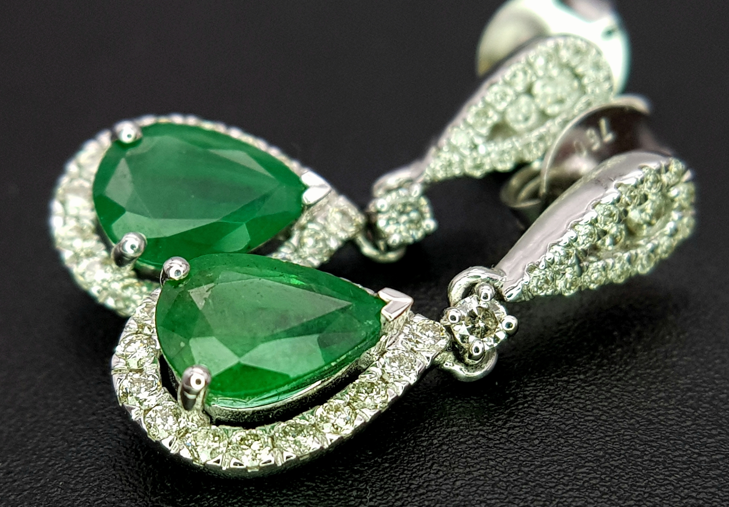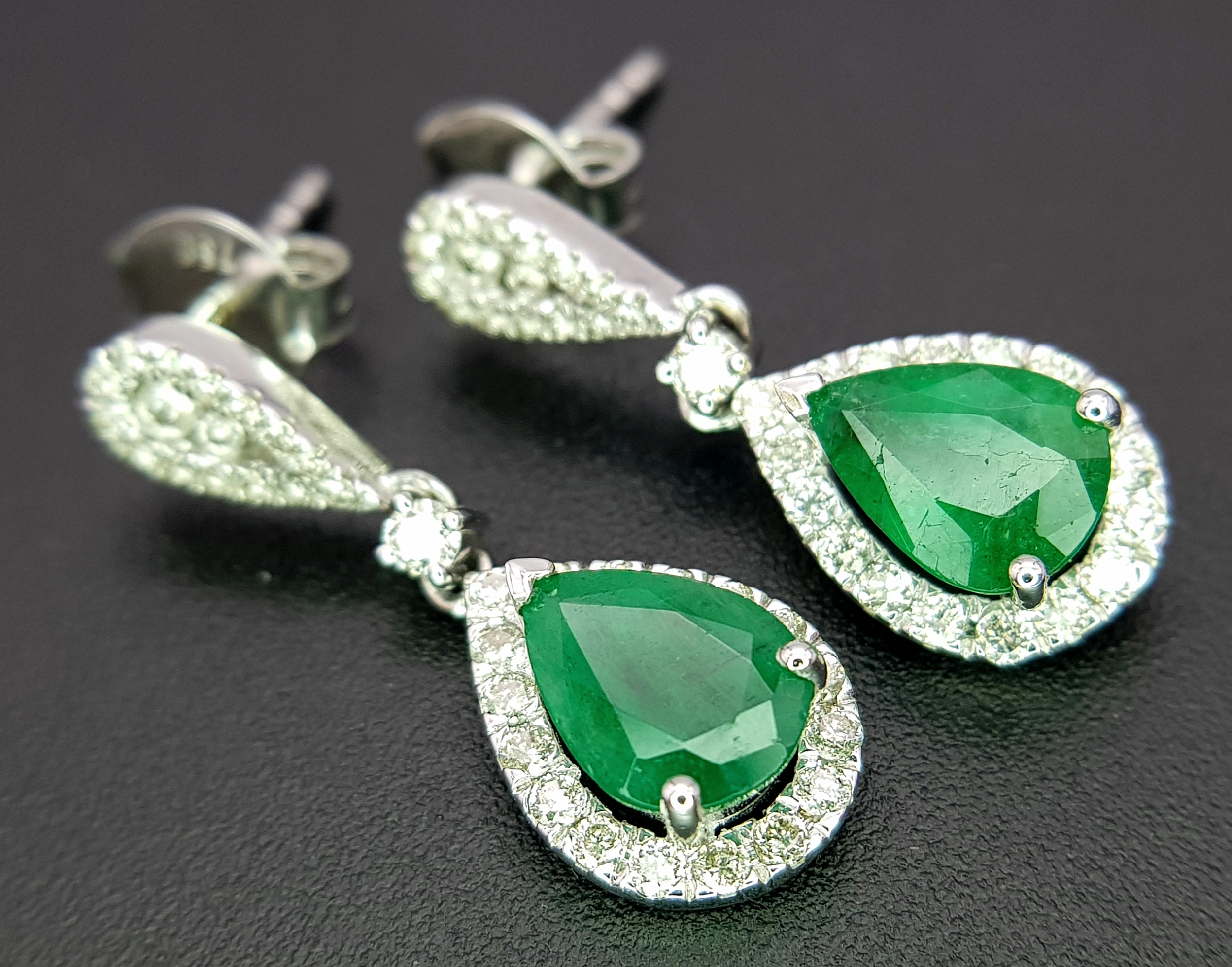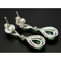A Pair of 18K White Gold, Colombian Emerald and Diamond Drop Earrings. Each having a 1ct emerald with diamond surround and accents - 1.2ctw. 22mm drop. 4.2g. r-210803.
