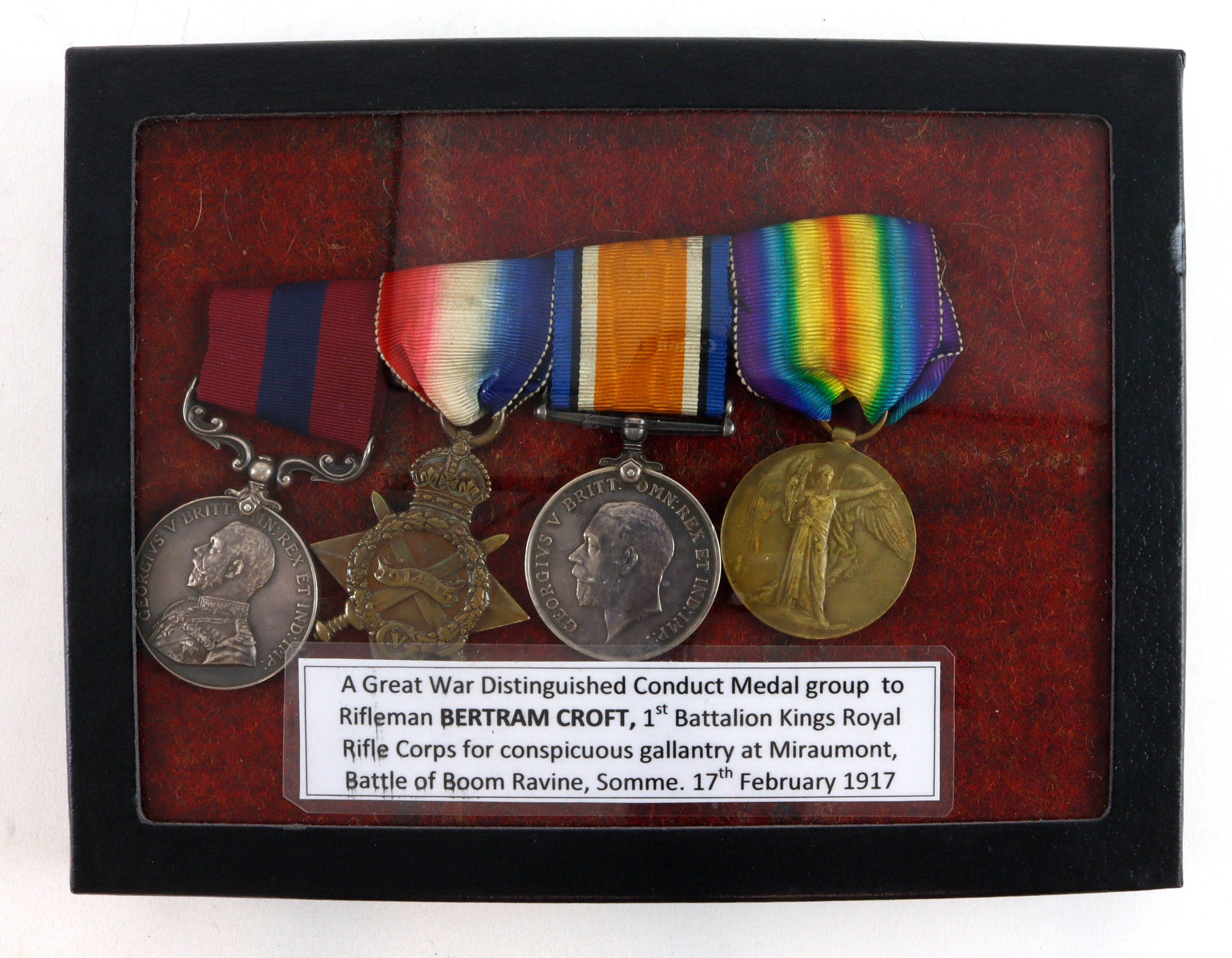DCM GV (9734 Pte B Croft 1/KRRC) 1915 Star Trio (9734 Pte B Croft K.R.Rif.C.) Born Hull. DCM L/G 17/4/1917 "he single handedly took a machine-gun forward and opened fire on the enemy…" Battle of Boom Ravine. Annotated L/G confirms "South of Miraumont 17/2/17". The Last great battle of the Somme area before the German retreat to the Hindenberg Line. With research (4)