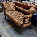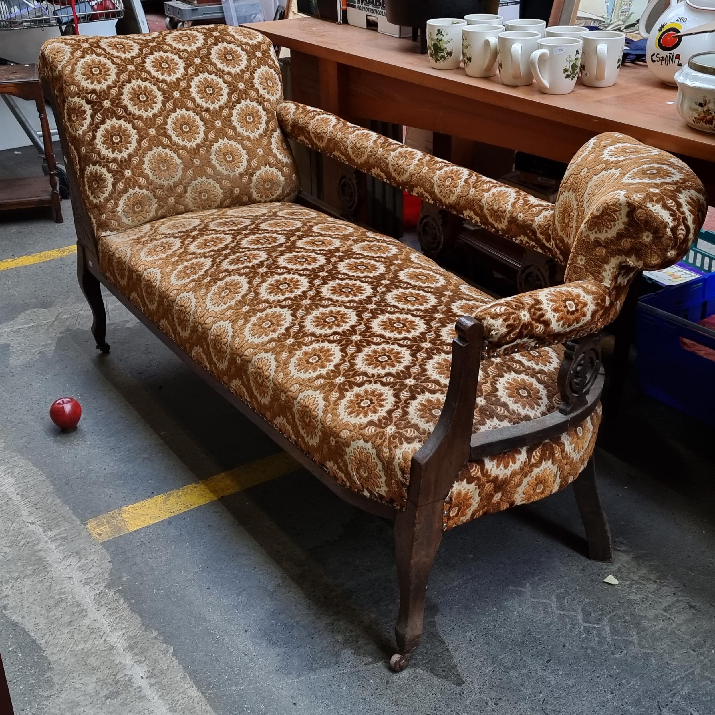 A fantastic mid century chaise lounge with attractive carved legs set on original castors and a pierced open-work frame. Upholstered in a brocade fabric in shades of terracotta and brown.