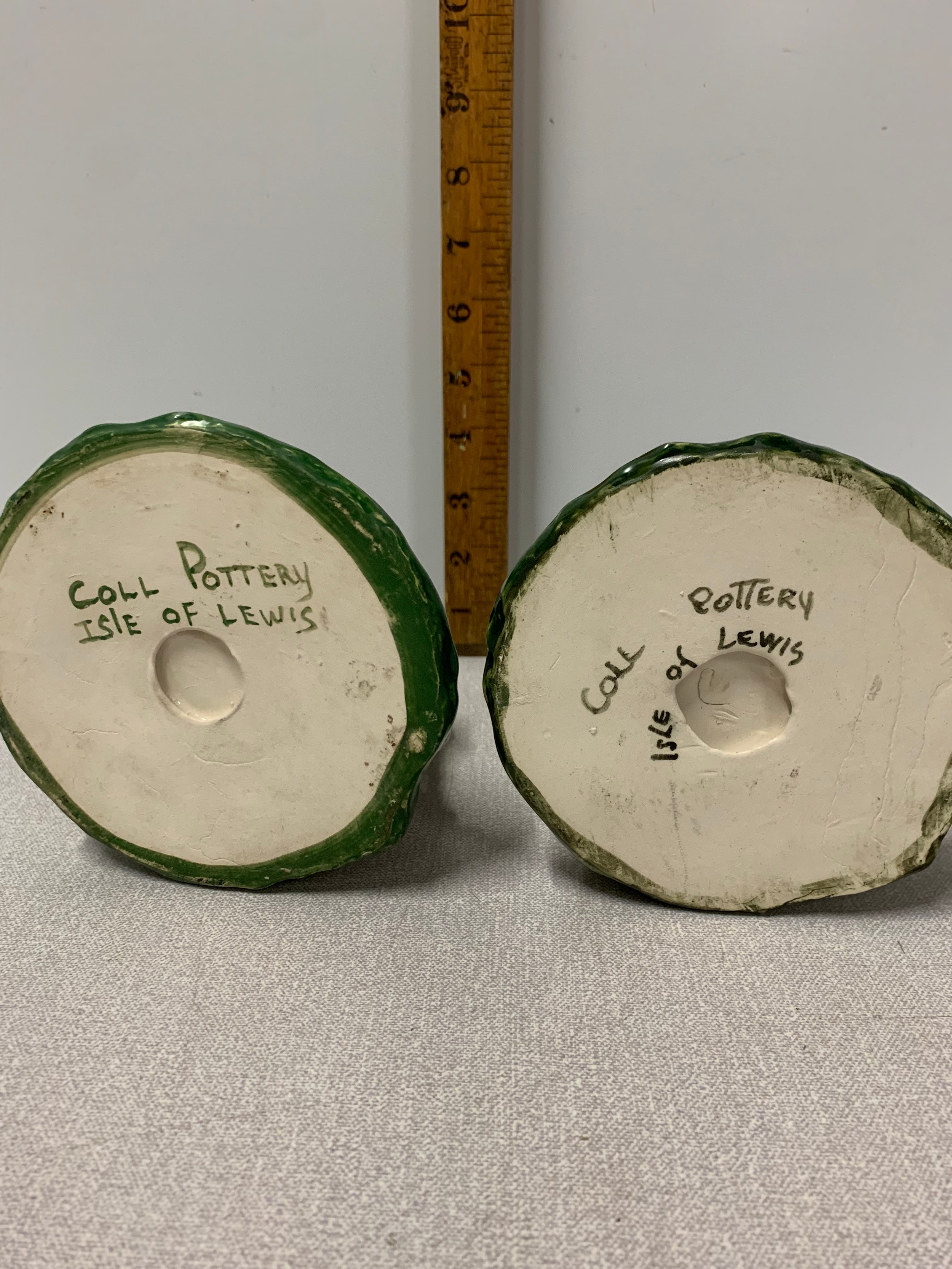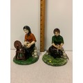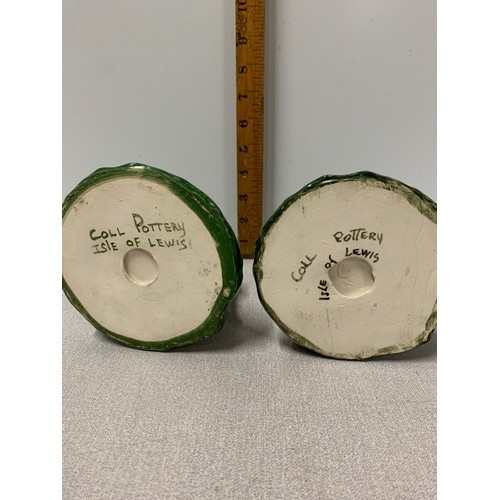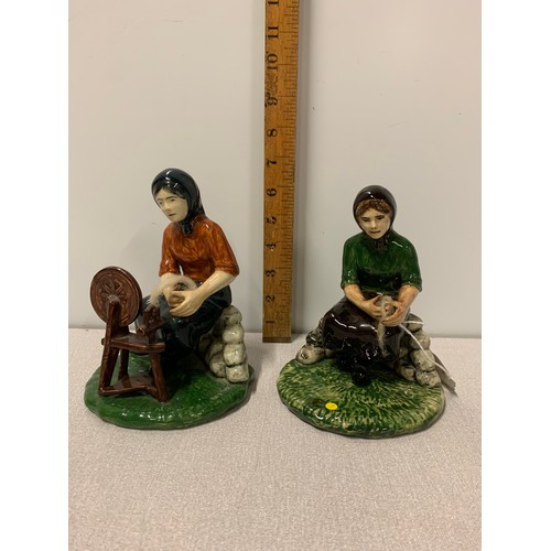 Pair of Coll Pottery Isle Of Lewis figures of woman spinning wool. Signed to base.Tallest 17cm