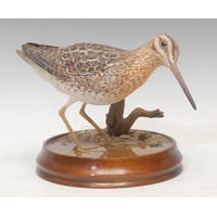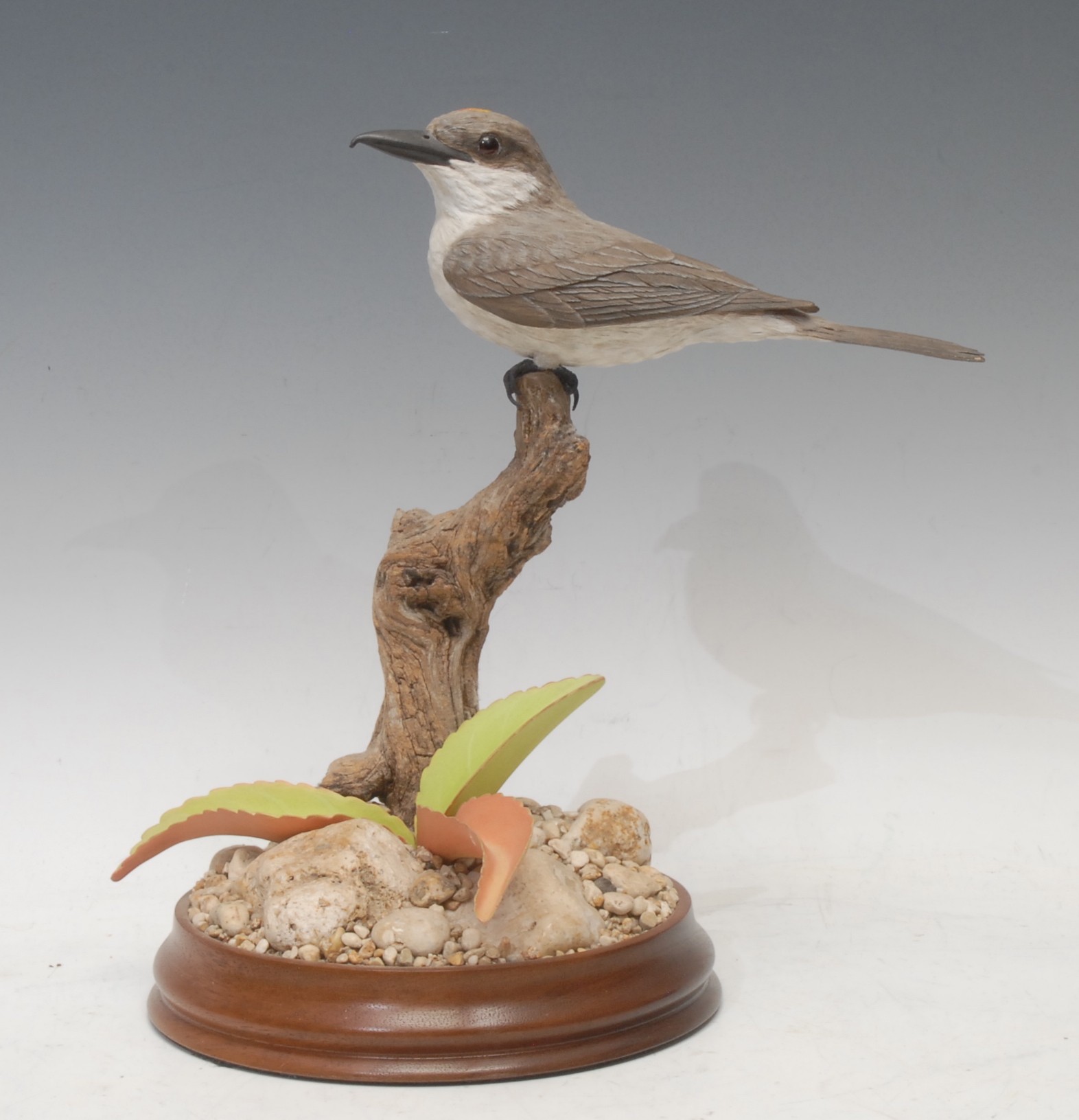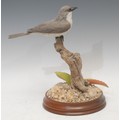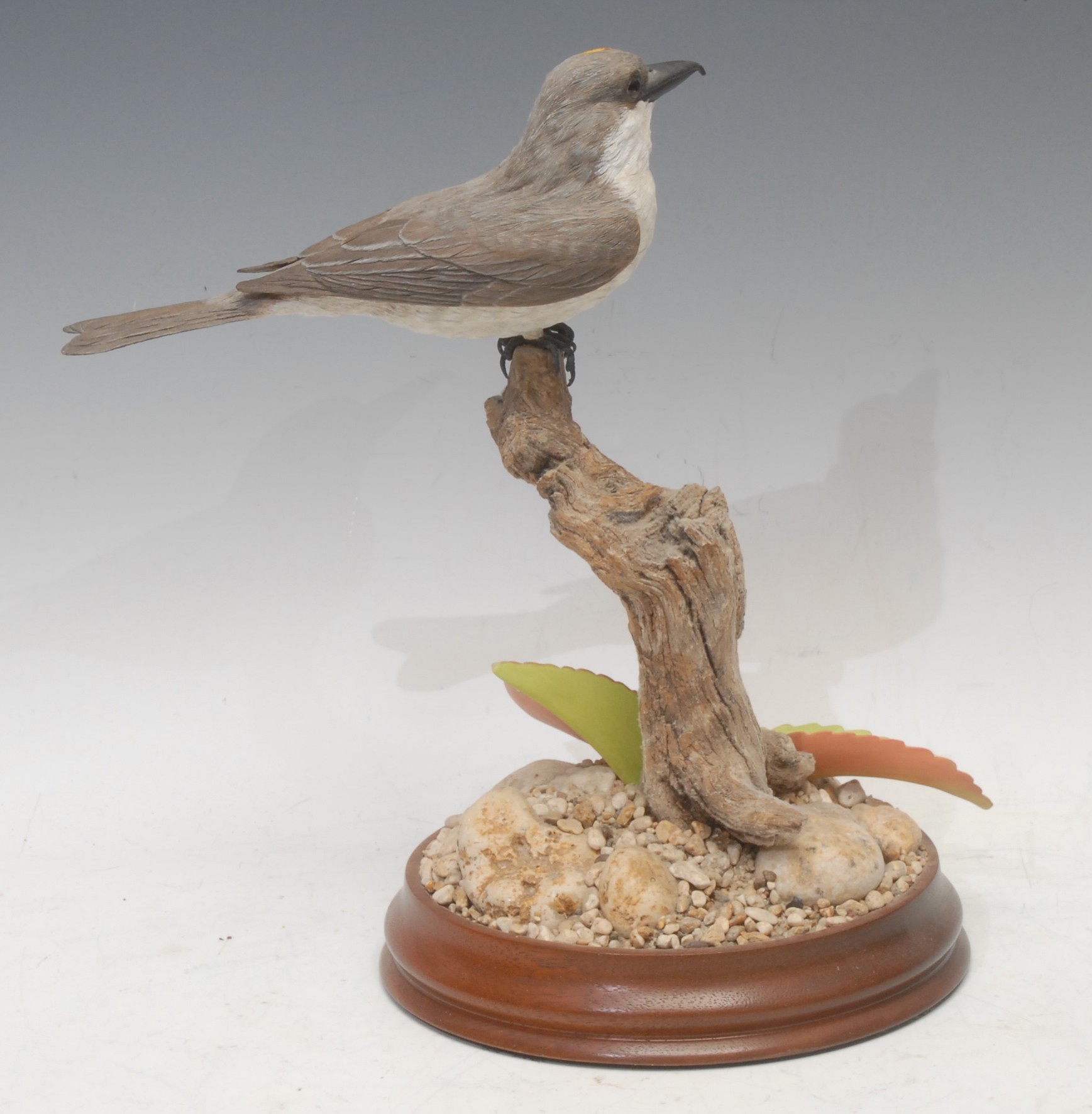 A Wild Feathers Bird Art finely carved wooden model or decoy, of a Grey Kingbird, by Geoff & Joanie Skeete, painted in polychrome, naturalistically mounted, circular hardwood base, 28cm high