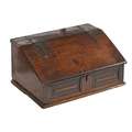 An English boarded oak desk box, second quarter 18th c, with raised and fielded panel to the front, sloping lid, associated steel hinges, the interior fitted with two drawer, 60cm l
